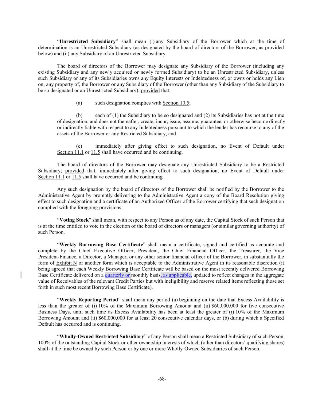 “Unrestricted Subsidiary” shall mean (i) any Subsidiary of the Borrower which at the time of determination is an Unrestricted Subsidiary (as designated by the board of directors of the Borrower, as provided below) and (ii) any Subsidiary of an Unrestricted Subsidiary. The board of directors of the Borrower may designate any Subsidiary of the Borrower (including any existing Subsidiary and any newly acquired or newly formed Subsidiary) to be an Unrestricted Subsidiary, unless such Subsidiary or any of its Subsidiaries owns any Equity Interests or Indebtedness of, or owns or holds any Lien on, any property of, the Borrower or any Subsidiary of the Borrower (other than any Subsidiary of the Subsidiary to be so designated or an Unrestricted Subsidiary); provided that: (a) such designation complies with Section 10.5; (b) each of (1) the Subsidiary to be so designated and (2) its Subsidiaries has not at the time of designation, and does not thereafter, create, incur, issue, assume, guarantee, or otherwise become directly or indirectly liable with respect to any Indebtedness pursuant to which the lender has recourse to any of the assets of the Borrower or any Restricted Subsidiary, and (c) immediately after giving effect to such designation, no Event of Default under Section 11.1 or 11.5 shall have occurred and be continuing. The board of directors of the Borrower may designate any Unrestricted Subsidiary to be a Restricted Subsidiary; provided that, immediately after giving effect to such designation, no Event of Default under Section 11.1 or 11.5 shall have occurred and be continuing. Any such designation by the board of directors of the Borrower shall be notified by the Borrower to the Administrative Agent by promptly delivering to the Administrative Agent a copy of the Board Resolution giving effect to such designation and a certificate of an Authorized Officer of the Borrower certifying that such designation complied with the foregoing provisions. “Voting Stock” shall mean, with respect to any Person as of any date, the Capital Stock of such Person that is at the time entitled to vote in the election of the board of directors or managers (or similar governing authority) of such Person. “Weekly Borrowing Base Certificate” shall mean a certificate, signed and certified as accurate and complete by the Chief Executive Officer, President, the Chief Financial Officer, the Treasurer, the Vice President-Finance, a Director, a Manager, or any other senior financial officer of the Borrower, in substantially the form of Exhibit N or another form which is acceptable to the Administrative Agent in its reasonable discretion (it being agreed that each Weekly Borrowing Base Certificate will be based on the most recently delivered Borrowing Base Certificate delivered on a quarterly or monthly basis, as applicable, updated to reflect changes in the aggregate value of Receivables of the relevant Credit Parties but with ineligibility and reserve related items reflecting those set forth in such most recent Borrowing Base Certificate). “Weekly Reporting Period” shall mean any period (a) beginning on the date that Excess Availability is less than the greater of (i) 10% of the Maximum Borrowing Amount and (ii) $60,000,000 for five consecutive Business Days, until such time as Excess Availability has been at least the greater of (i) 10% of the Maximum Borrowing Amount and (ii) $60,000,000 for at least 20 consecutive calendar days, or (b) during which a Specified Default has occurred and is continuing. “Wholly-Owned Restricted Subsidiary” of any Person shall mean a Restricted Subsidiary of such Person, 100% of the outstanding Capital Stock or other ownership interests of which (other than directors’ qualifying shares) shall at the time be owned by such Person or by one or more Wholly-Owned Subsidiaries of such Person. -68-