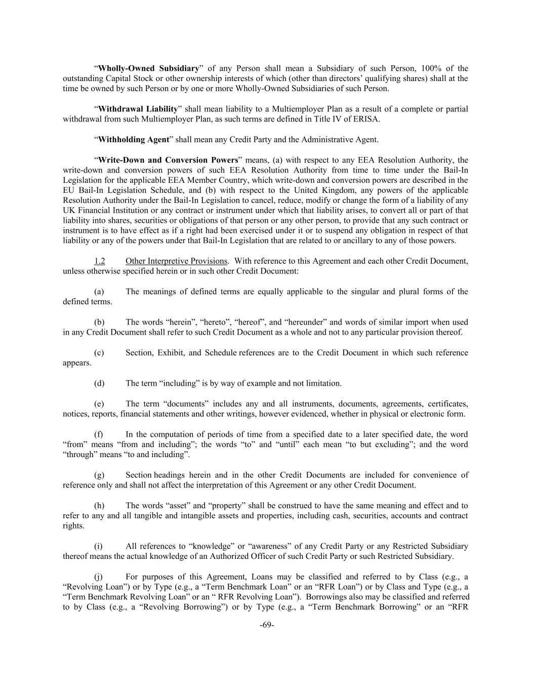 “Wholly-Owned Subsidiary” of any Person shall mean a Subsidiary of such Person, 100% of the outstanding Capital Stock or other ownership interests of which (other than directors’ qualifying shares) shall at the time be owned by such Person or by one or more Wholly-Owned Subsidiaries of such Person. “Withdrawal Liability” shall mean liability to a Multiemployer Plan as a result of a complete or partial withdrawal from such Multiemployer Plan, as such terms are defined in Title IV of ERISA. “Withholding Agent” shall mean any Credit Party and the Administrative Agent. “Write-Down and Conversion Powers” means, (a) with respect to any EEA Resolution Authority, the write-down and conversion powers of such EEA Resolution Authority from time to time under the Bail-In Legislation for the applicable EEA Member Country, which write-down and conversion powers are described in the EU Bail-In Legislation Schedule, and (b) with respect to the United Kingdom, any powers of the applicable Resolution Authority under the Bail-In Legislation to cancel, reduce, modify or change the form of a liability of any UK Financial Institution or any contract or instrument under which that liability arises, to convert all or part of that liability into shares, securities or obligations of that person or any other person, to provide that any such contract or instrument is to have effect as if a right had been exercised under it or to suspend any obligation in respect of that liability or any of the powers under that Bail-In Legislation that are related to or ancillary to any of those powers. 1.2 Other Interpretive Provisions. With reference to this Agreement and each other Credit Document, unless otherwise specified herein or in such other Credit Document: (a) The meanings of defined terms are equally applicable to the singular and plural forms of the defined terms. (b) The words “herein”, “hereto”, “hereof”, and “hereunder” and words of similar import when used in any Credit Document shall refer to such Credit Document as a whole and not to any particular provision thereof. (c) Section, Exhibit, and Schedule references are to the Credit Document in which such reference appears. (d) The term “including” is by way of example and not limitation. (e) The term “documents” includes any and all instruments, documents, agreements, certificates, notices, reports, financial statements and other writings, however evidenced, whether in physical or electronic form. (f) In the computation of periods of time from a specified date to a later specified date, the word “from” means “from and including”; the words “to” and “until” each mean “to but excluding”; and the word “through” means “to and including”. (g) Section headings herein and in the other Credit Documents are included for convenience of reference only and shall not affect the interpretation of this Agreement or any other Credit Document. (h) The words “asset” and “property” shall be construed to have the same meaning and effect and to refer to any and all tangible and intangible assets and properties, including cash, securities, accounts and contract rights. (i) All references to “knowledge” or “awareness” of any Credit Party or any Restricted Subsidiary thereof means the actual knowledge of an Authorized Officer of such Credit Party or such Restricted Subsidiary. (j) For purposes of this Agreement, Loans may be classified and referred to by Class (e.g., a “Revolving Loan”) or by Type (e.g., a “Term Benchmark Loan” or an “RFR Loan”) or by Class and Type (e.g., a “Term Benchmark Revolving Loan” or an “ RFR Revolving Loan”). Borrowings also may be classified and referred to by Class (e.g., a “Revolving Borrowing”) or by Type (e.g., a “Term Benchmark Borrowing” or an “RFR -69-