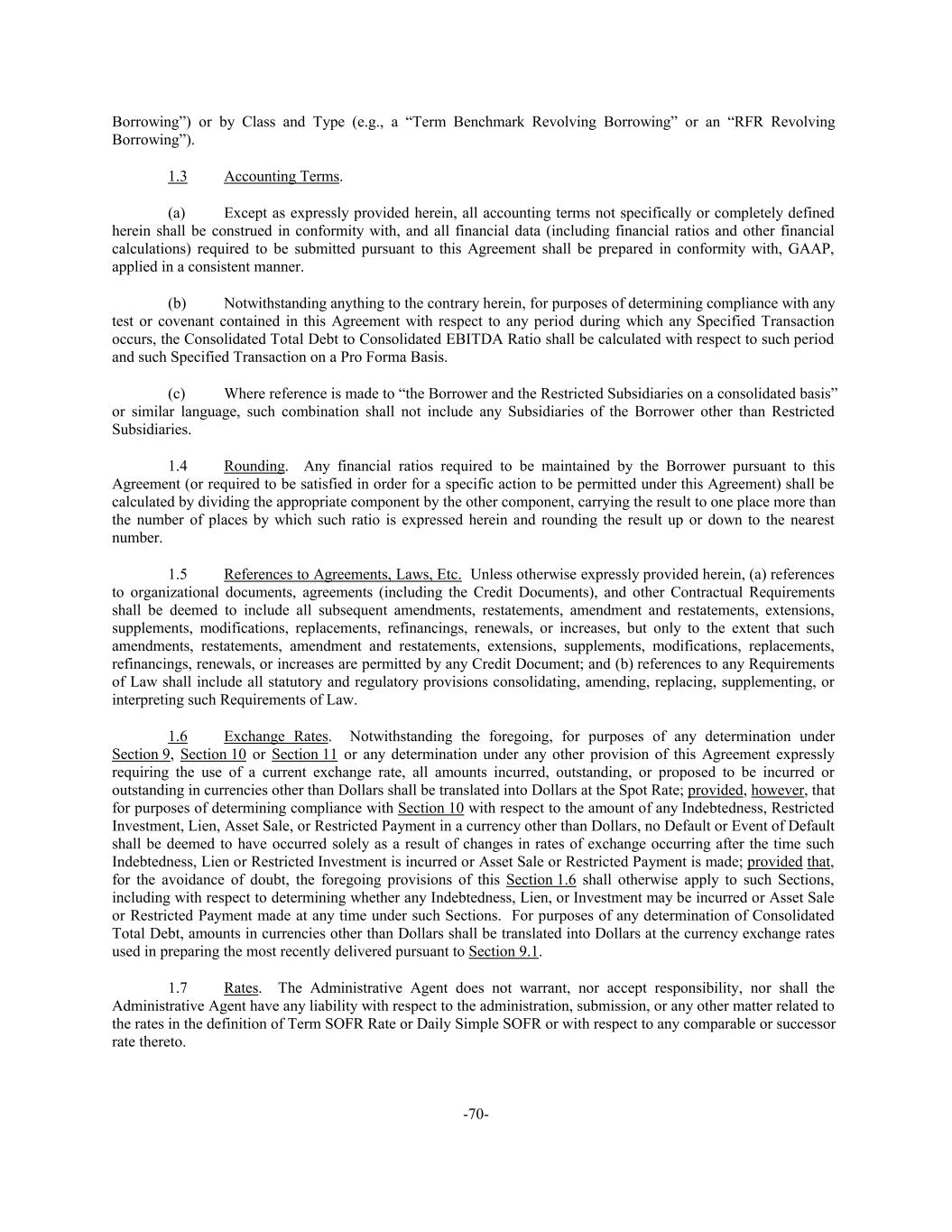 Borrowing”) or by Class and Type (e.g., a “Term Benchmark Revolving Borrowing” or an “RFR Revolving Borrowing”). 1.3 Accounting Terms. (a) Except as expressly provided herein, all accounting terms not specifically or completely defined herein shall be construed in conformity with, and all financial data (including financial ratios and other financial calculations) required to be submitted pursuant to this Agreement shall be prepared in conformity with, GAAP, applied in a consistent manner. (b) Notwithstanding anything to the contrary herein, for purposes of determining compliance with any test or covenant contained in this Agreement with respect to any period during which any Specified Transaction occurs, the Consolidated Total Debt to Consolidated EBITDA Ratio shall be calculated with respect to such period and such Specified Transaction on a Pro Forma Basis. (c) Where reference is made to “the Borrower and the Restricted Subsidiaries on a consolidated basis” or similar language, such combination shall not include any Subsidiaries of the Borrower other than Restricted Subsidiaries. 1.4 Rounding. Any financial ratios required to be maintained by the Borrower pursuant to this Agreement (or required to be satisfied in order for a specific action to be permitted under this Agreement) shall be calculated by dividing the appropriate component by the other component, carrying the result to one place more than the number of places by which such ratio is expressed herein and rounding the result up or down to the nearest number. 1.5 References to Agreements, Laws, Etc. Unless otherwise expressly provided herein, (a) references to organizational documents, agreements (including the Credit Documents), and other Contractual Requirements shall be deemed to include all subsequent amendments, restatements, amendment and restatements, extensions, supplements, modifications, replacements, refinancings, renewals, or increases, but only to the extent that such amendments, restatements, amendment and restatements, extensions, supplements, modifications, replacements, refinancings, renewals, or increases are permitted by any Credit Document; and (b) references to any Requirements of Law shall include all statutory and regulatory provisions consolidating, amending, replacing, supplementing, or interpreting such Requirements of Law. 1.6 Exchange Rates. Notwithstanding the foregoing, for purposes of any determination under Section 9, Section 10 or Section 11 or any determination under any other provision of this Agreement expressly requiring the use of a current exchange rate, all amounts incurred, outstanding, or proposed to be incurred or outstanding in currencies other than Dollars shall be translated into Dollars at the Spot Rate; provided, however, that for purposes of determining compliance with Section 10 with respect to the amount of any Indebtedness, Restricted Investment, Lien, Asset Sale, or Restricted Payment in a currency other than Dollars, no Default or Event of Default shall be deemed to have occurred solely as a result of changes in rates of exchange occurring after the time such Indebtedness, Lien or Restricted Investment is incurred or Asset Sale or Restricted Payment is made; provided that, for the avoidance of doubt, the foregoing provisions of this Section 1.6 shall otherwise apply to such Sections, including with respect to determining whether any Indebtedness, Lien, or Investment may be incurred or Asset Sale or Restricted Payment made at any time under such Sections. For purposes of any determination of Consolidated Total Debt, amounts in currencies other than Dollars shall be translated into Dollars at the currency exchange rates used in preparing the most recently delivered pursuant to Section 9.1. 1.7 Rates. The Administrative Agent does not warrant, nor accept responsibility, nor shall the Administrative Agent have any liability with respect to the administration, submission, or any other matter related to the rates in the definition of Term SOFR Rate or Daily Simple SOFR or with respect to any comparable or successor rate thereto. -70-