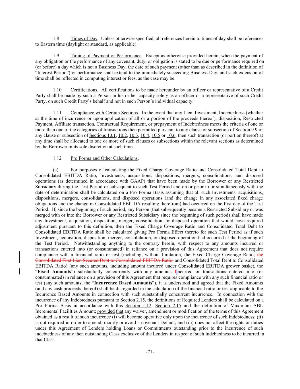 1.8 Times of Day. Unless otherwise specified, all references herein to times of day shall be references to Eastern time (daylight or standard, as applicable). 1.9 Timing of Payment or Performance. Except as otherwise provided herein, when the payment of any obligation or the performance of any covenant, duty, or obligation is stated to be due or performance required on (or before) a day which is not a Business Day, the date of such payment (other than as described in the definition of “Interest Period”) or performance shall extend to the immediately succeeding Business Day, and such extension of time shall be reflected in computing interest or fees, as the case may be. 1.10 Certifications. All certifications to be made hereunder by an officer or representative of a Credit Party shall be made by such a Person in his or her capacity solely as an officer or a representative of such Credit Party, on such Credit Party’s behalf and not in such Person’s individual capacity. 1.11 Compliance with Certain Sections. In the event that any Lien, Investment, Indebtedness (whether at the time of incurrence or upon application of all or a portion of the proceeds thereof), disposition, Restricted Payment, Affiliate transaction, Contractual Requirement, or prepayment of Indebtedness meets the criteria of one or more than one of the categories of transactions then permitted pursuant to any clause or subsection of Section 9.9 or any clause or subsection of Sections 10.1, 10.2, 10.3, 10.4, 10.5 or 10.6, then such transaction (or portion thereof) at any time shall be allocated to one or more of such clauses or subsections within the relevant sections as determined by the Borrower in its sole discretion at such time. 1.12 Pro Forma and Other Calculations. (a) For purposes of calculating the Fixed Charge Coverage Ratio and Consolidated Total Debt to Consolidated EBITDA Ratio, Investments, acquisitions, dispositions, mergers, consolidations, and disposed operations (as determined in accordance with GAAP) that have been made by the Borrower or any Restricted Subsidiary during the Test Period or subsequent to such Test Period and on or prior to or simultaneously with the date of determination shall be calculated on a Pro Forma Basis assuming that all such Investments, acquisitions, dispositions, mergers, consolidations, and disposed operations (and the change in any associated fixed charge obligations and the change in Consolidated EBITDA resulting therefrom) had occurred on the first day of the Test Period. If, since the beginning of such period, any Person (that subsequently became a Restricted Subsidiary or was merged with or into the Borrower or any Restricted Subsidiary since the beginning of such period) shall have made any Investment, acquisition, disposition, merger, consolidation, or disposed operation that would have required adjustment pursuant to this definition, then the Fixed Charge Coverage Ratio and Consolidated Total Debt to Consolidated EBITDA Ratio shall be calculated giving Pro Forma Effect thereto for such Test Period as if such Investment, acquisition, disposition, merger, consolidation, or disposed operation had occurred at the beginning of the Test Period. Notwithstanding anything to the contrary herein, with respect to any amounts incurred or transactions entered into (or consummated) in reliance on a provision of this Agreement that does not require compliance with a financial ratio or test (including, without limitation, the Fixed Charge Coverage Ratio, the Consolidated First Lien Secured Debt to Consolidated EBITDA Ratio and Consolidated Total Debt to Consolidated EBITDA Ratio) (any such amounts, including amount incurred under Consolidated EBITDA grower basket, the “Fixed Amounts”) substantially concurrently with any amounts Iincurred or transactions entered into (or consummated) in reliance on a provision of this Agreement that requires compliance with any such financial ratio or test (any such amounts, the “Incurrence Based Amounts”), it is understood and agreed that the Fixed Amounts (and any cash proceeds thereof) shall be disregarded in the calculation of the financial ratio or test applicable to the Incurrence Based Amounts in connection with such substantially concurrent incurrence. In connection with the incurrence of any Indebtedness pursuant to Section 2.15, the definitions of Required Lenders shall be calculated on a Pro Forma Basis in accordance with this Section 1.12, Section 2.15 and the definition of Maximum ABL Incremental Facilities Amount; provided that any waiver, amendment or modification of the terms of this Agreement obtained as a result of such incurrence (i) will become operative only upon the incurrence of such Indebtedness; (ii) is not required in order to amend, modify or avoid a covenant Default; and (iii) does not affect the rights or duties under this Agreement of Lenders holding Loans or Commitments outstanding prior to the incurrence of such indebtedness of any then outstanding Class exclusive of the Lenders in respect of such Indebtedness to be incurred in that Class. -71-