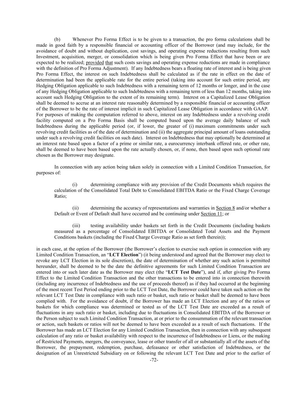 (b) Whenever Pro Forma Effect is to be given to a transaction, the pro forma calculations shall be made in good faith by a responsible financial or accounting officer of the Borrower (and may include, for the avoidance of doubt and without duplication, cost savings, and operating expense reductions resulting from such Investment, acquisition, merger, or consolidation which is being given Pro Forma Effect that have been or are expected to be realized; provided that such costs savings and operating expense reductions are made in compliance with the definition of Pro Forma Adjustment). If any Indebtedness bears a floating rate of interest and is being given Pro Forma Effect, the interest on such Indebtedness shall be calculated as if the rate in effect on the date of determination had been the applicable rate for the entire period (taking into account for such entire period, any Hedging Obligation applicable to such Indebtedness with a remaining term of 12 months or longer, and in the case of any Hedging Obligation applicable to such Indebtedness with a remaining term of less than 12 months, taking into account such Hedging Obligation to the extent of its remaining term). Interest on a Capitalized Lease Obligation shall be deemed to accrue at an interest rate reasonably determined by a responsible financial or accounting officer of the Borrower to be the rate of interest implicit in such Capitalized Lease Obligation in accordance with GAAP. For purposes of making the computation referred to above, interest on any Indebtedness under a revolving credit facility computed on a Pro Forma Basis shall be computed based upon the average daily balance of such Indebtedness during the applicable period (or, if lower, the greater of (i) maximum commitments under such revolving credit facilities as of the date of determination and (ii) the aggregate principal amount of loans outstanding under such a revolving credit facilities on such date). Interest on Indebtedness that may optionally be determined at an interest rate based upon a factor of a prime or similar rate, a eurocurrency interbank offered rate, or other rate, shall be deemed to have been based upon the rate actually chosen, or, if none, then based upon such optional rate chosen as the Borrower may designate. In connection with any action being taken solely in connection with a Limited Condition Transaction, for purposes of: (i) determining compliance with any provision of the Credit Documents which requires the calculation of the Consolidated Total Debt to Consolidated EBITDA Ratio or the Fixed Charge Coverage Ratio; (ii) determining the accuracy of representations and warranties in Section 8 and/or whether a Default or Event of Default shall have occurred and be continuing under Section 11; or (iii) testing availability under baskets set forth in the Credit Documents (including baskets measured as a percentage of Consolidated EBITDA or Consolidated Total Assets and the Payment Conditions baskets (including the Fixed Charge Coverage Ratio as set forth therein)); in each case, at the option of the Borrower (the Borrower’s election to exercise such option in connection with any Limited Condition Transaction, an “LCT Election”) (it being understood and agreed that the Borrower may elect to revoke any LCT Election in its sole discretion), the date of determination of whether any such action is permitted hereunder, shall be deemed to be the date the definitive agreements for such Limited Condition Transaction are entered into or such later date as the Borrower may elect (the “LCT Test Date”), and if, after giving Pro Forma Effect to the Limited Condition Transaction and the other transactions to be entered into in connection therewith (including any incurrence of Indebtedness and the use of proceeds thereof) as if they had occurred at the beginning of the most recent Test Period ending prior to the LCT Test Date, the Borrower could have taken such action on the relevant LCT Test Date in compliance with such ratio or basket, such ratio or basket shall be deemed to have been complied with. For the avoidance of doubt, if the Borrower has made an LCT Election and any of the ratios or baskets for which compliance was determined or tested as of the LCT Test Date are exceeded as a result of fluctuations in any such ratio or basket, including due to fluctuations in Consolidated EBITDA of the Borrower or the Person subject to such Limited Condition Transaction, at or prior to the consummation of the relevant transaction or action, such baskets or ratios will not be deemed to have been exceeded as a result of such fluctuations. If the Borrower has made an LCT Election for any Limited Condition Transaction, then in connection with any subsequent calculation of any ratio or basket availability with respect to the incurrence of Indebtedness or Liens, or the making of Restricted Payments, mergers, the conveyance, lease or other transfer of all or substantially all of the assets of the Borrower, the prepayment, redemption, purchase, defeasance or other satisfaction of Indebtedness, or the designation of an Unrestricted Subsidiary on or following the relevant LCT Test Date and prior to the earlier of -72-