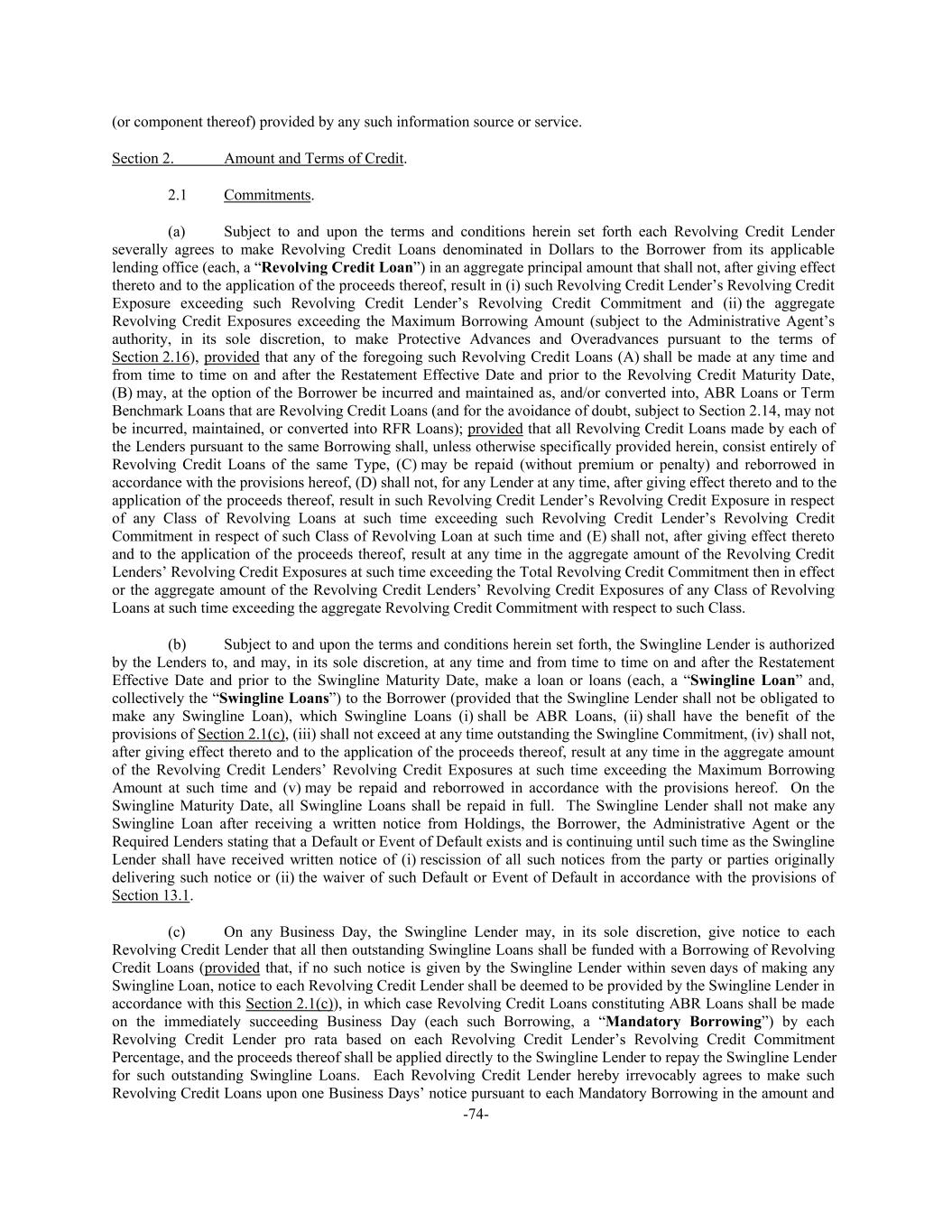 (or component thereof) provided by any such information source or service. Section 2. Amount and Terms of Credit. 2.1 Commitments. (a) Subject to and upon the terms and conditions herein set forth each Revolving Credit Lender severally agrees to make Revolving Credit Loans denominated in Dollars to the Borrower from its applicable lending office (each, a “Revolving Credit Loan”) in an aggregate principal amount that shall not, after giving effect thereto and to the application of the proceeds thereof, result in (i) such Revolving Credit Lender’s Revolving Credit Exposure exceeding such Revolving Credit Lender’s Revolving Credit Commitment and (ii) the aggregate Revolving Credit Exposures exceeding the Maximum Borrowing Amount (subject to the Administrative Agent’s authority, in its sole discretion, to make Protective Advances and Overadvances pursuant to the terms of Section 2.16), provided that any of the foregoing such Revolving Credit Loans (A) shall be made at any time and from time to time on and after the Restatement Effective Date and prior to the Revolving Credit Maturity Date, (B) may, at the option of the Borrower be incurred and maintained as, and/or converted into, ABR Loans or Term Benchmark Loans that are Revolving Credit Loans (and for the avoidance of doubt, subject to Section 2.14, may not be incurred, maintained, or converted into RFR Loans); provided that all Revolving Credit Loans made by each of the Lenders pursuant to the same Borrowing shall, unless otherwise specifically provided herein, consist entirely of Revolving Credit Loans of the same Type, (C) may be repaid (without premium or penalty) and reborrowed in accordance with the provisions hereof, (D) shall not, for any Lender at any time, after giving effect thereto and to the application of the proceeds thereof, result in such Revolving Credit Lender’s Revolving Credit Exposure in respect of any Class of Revolving Loans at such time exceeding such Revolving Credit Lender’s Revolving Credit Commitment in respect of such Class of Revolving Loan at such time and (E) shall not, after giving effect thereto and to the application of the proceeds thereof, result at any time in the aggregate amount of the Revolving Credit Lenders’ Revolving Credit Exposures at such time exceeding the Total Revolving Credit Commitment then in effect or the aggregate amount of the Revolving Credit Lenders’ Revolving Credit Exposures of any Class of Revolving Loans at such time exceeding the aggregate Revolving Credit Commitment with respect to such Class. (b) Subject to and upon the terms and conditions herein set forth, the Swingline Lender is authorized by the Lenders to, and may, in its sole discretion, at any time and from time to time on and after the Restatement Effective Date and prior to the Swingline Maturity Date, make a loan or loans (each, a “Swingline Loan” and, collectively the “Swingline Loans”) to the Borrower (provided that the Swingline Lender shall not be obligated to make any Swingline Loan), which Swingline Loans (i) shall be ABR Loans, (ii) shall have the benefit of the provisions of Section 2.1(c), (iii) shall not exceed at any time outstanding the Swingline Commitment, (iv) shall not, after giving effect thereto and to the application of the proceeds thereof, result at any time in the aggregate amount of the Revolving Credit Lenders’ Revolving Credit Exposures at such time exceeding the Maximum Borrowing Amount at such time and (v) may be repaid and reborrowed in accordance with the provisions hereof. On the Swingline Maturity Date, all Swingline Loans shall be repaid in full. The Swingline Lender shall not make any Swingline Loan after receiving a written notice from Holdings, the Borrower, the Administrative Agent or the Required Lenders stating that a Default or Event of Default exists and is continuing until such time as the Swingline Lender shall have received written notice of (i) rescission of all such notices from the party or parties originally delivering such notice or (ii) the waiver of such Default or Event of Default in accordance with the provisions of Section 13.1. (c) On any Business Day, the Swingline Lender may, in its sole discretion, give notice to each Revolving Credit Lender that all then outstanding Swingline Loans shall be funded with a Borrowing of Revolving Credit Loans (provided that, if no such notice is given by the Swingline Lender within seven days of making any Swingline Loan, notice to each Revolving Credit Lender shall be deemed to be provided by the Swingline Lender in accordance with this Section 2.1(c)), in which case Revolving Credit Loans constituting ABR Loans shall be made on the immediately succeeding Business Day (each such Borrowing, a “Mandatory Borrowing”) by each Revolving Credit Lender pro rata based on each Revolving Credit Lender’s Revolving Credit Commitment Percentage, and the proceeds thereof shall be applied directly to the Swingline Lender to repay the Swingline Lender for such outstanding Swingline Loans. Each Revolving Credit Lender hereby irrevocably agrees to make such Revolving Credit Loans upon one Business Days’ notice pursuant to each Mandatory Borrowing in the amount and -74-
