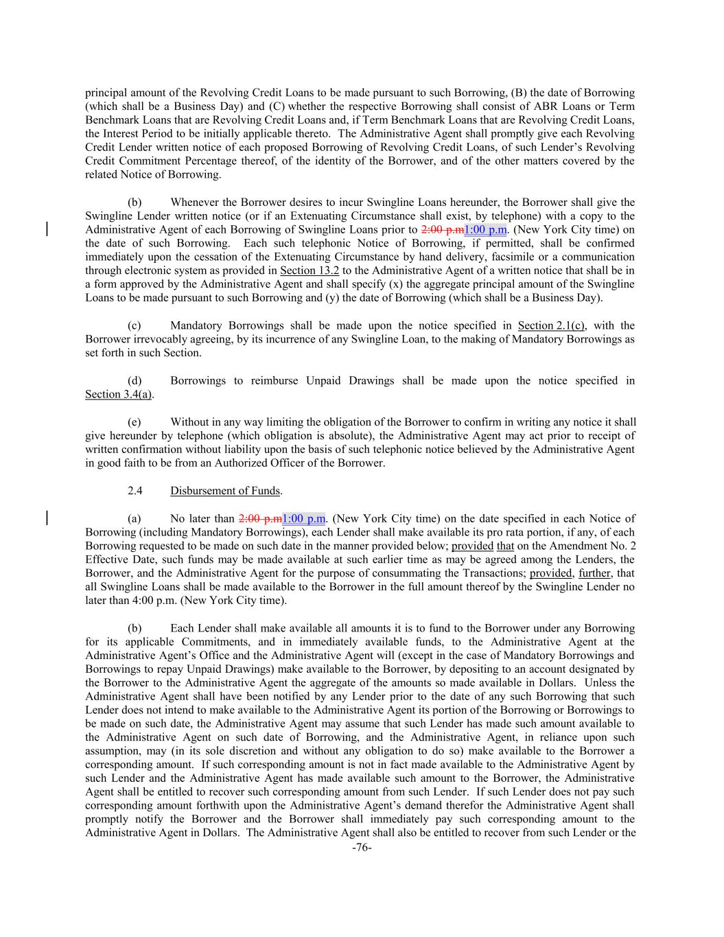 principal amount of the Revolving Credit Loans to be made pursuant to such Borrowing, (B) the date of Borrowing (which shall be a Business Day) and (C) whether the respective Borrowing shall consist of ABR Loans or Term Benchmark Loans that are Revolving Credit Loans and, if Term Benchmark Loans that are Revolving Credit Loans, the Interest Period to be initially applicable thereto. The Administrative Agent shall promptly give each Revolving Credit Lender written notice of each proposed Borrowing of Revolving Credit Loans, of such Lender’s Revolving Credit Commitment Percentage thereof, of the identity of the Borrower, and of the other matters covered by the related Notice of Borrowing. (b) Whenever the Borrower desires to incur Swingline Loans hereunder, the Borrower shall give the Swingline Lender written notice (or if an Extenuating Circumstance shall exist, by telephone) with a copy to the Administrative Agent of each Borrowing of Swingline Loans prior to 2:00 p.m1:00 p.m. (New York City time) on the date of such Borrowing. Each such telephonic Notice of Borrowing, if permitted, shall be confirmed immediately upon the cessation of the Extenuating Circumstance by hand delivery, facsimile or a communication through electronic system as provided in Section 13.2 to the Administrative Agent of a written notice that shall be in a form approved by the Administrative Agent and shall specify (x) the aggregate principal amount of the Swingline Loans to be made pursuant to such Borrowing and (y) the date of Borrowing (which shall be a Business Day). (c) Mandatory Borrowings shall be made upon the notice specified in Section 2.1(c), with the Borrower irrevocably agreeing, by its incurrence of any Swingline Loan, to the making of Mandatory Borrowings as set forth in such Section. (d) Borrowings to reimburse Unpaid Drawings shall be made upon the notice specified in Section 3.4(a). (e) Without in any way limiting the obligation of the Borrower to confirm in writing any notice it shall give hereunder by telephone (which obligation is absolute), the Administrative Agent may act prior to receipt of written confirmation without liability upon the basis of such telephonic notice believed by the Administrative Agent in good faith to be from an Authorized Officer of the Borrower. 2.4 Disbursement of Funds. (a) No later than 2:00 p.m1:00 p.m. (New York City time) on the date specified in each Notice of Borrowing (including Mandatory Borrowings), each Lender shall make available its pro rata portion, if any, of each Borrowing requested to be made on such date in the manner provided below; provided that on the Amendment No. 2 Effective Date, such funds may be made available at such earlier time as may be agreed among the Lenders, the Borrower, and the Administrative Agent for the purpose of consummating the Transactions; provided, further, that all Swingline Loans shall be made available to the Borrower in the full amount thereof by the Swingline Lender no later than 4:00 p.m. (New York City time). (b) Each Lender shall make available all amounts it is to fund to the Borrower under any Borrowing for its applicable Commitments, and in immediately available funds, to the Administrative Agent at the Administrative Agent’s Office and the Administrative Agent will (except in the case of Mandatory Borrowings and Borrowings to repay Unpaid Drawings) make available to the Borrower, by depositing to an account designated by the Borrower to the Administrative Agent the aggregate of the amounts so made available in Dollars. Unless the Administrative Agent shall have been notified by any Lender prior to the date of any such Borrowing that such Lender does not intend to make available to the Administrative Agent its portion of the Borrowing or Borrowings to be made on such date, the Administrative Agent may assume that such Lender has made such amount available to the Administrative Agent on such date of Borrowing, and the Administrative Agent, in reliance upon such assumption, may (in its sole discretion and without any obligation to do so) make available to the Borrower a corresponding amount. If such corresponding amount is not in fact made available to the Administrative Agent by such Lender and the Administrative Agent has made available such amount to the Borrower, the Administrative Agent shall be entitled to recover such corresponding amount from such Lender. If such Lender does not pay such corresponding amount forthwith upon the Administrative Agent’s demand therefor the Administrative Agent shall promptly notify the Borrower and the Borrower shall immediately pay such corresponding amount to the Administrative Agent in Dollars. The Administrative Agent shall also be entitled to recover from such Lender or the -76-