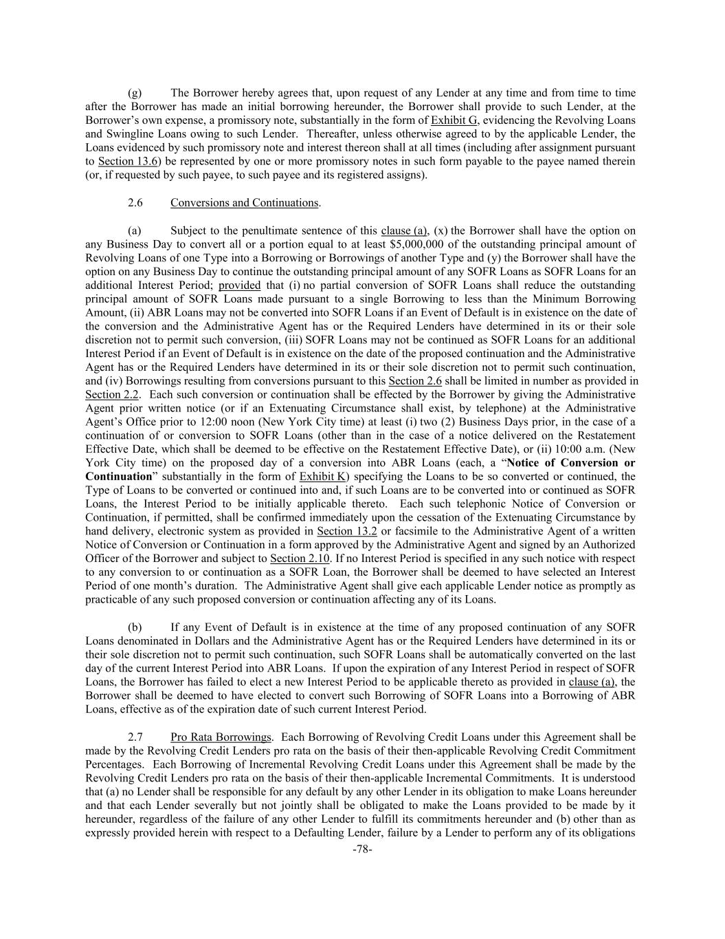 (g) The Borrower hereby agrees that, upon request of any Lender at any time and from time to time after the Borrower has made an initial borrowing hereunder, the Borrower shall provide to such Lender, at the Borrower’s own expense, a promissory note, substantially in the form of Exhibit G, evidencing the Revolving Loans and Swingline Loans owing to such Lender. Thereafter, unless otherwise agreed to by the applicable Lender, the Loans evidenced by such promissory note and interest thereon shall at all times (including after assignment pursuant to Section 13.6) be represented by one or more promissory notes in such form payable to the payee named therein (or, if requested by such payee, to such payee and its registered assigns). 2.6 Conversions and Continuations. (a) Subject to the penultimate sentence of this clause (a), (x) the Borrower shall have the option on any Business Day to convert all or a portion equal to at least $5,000,000 of the outstanding principal amount of Revolving Loans of one Type into a Borrowing or Borrowings of another Type and (y) the Borrower shall have the option on any Business Day to continue the outstanding principal amount of any SOFR Loans as SOFR Loans for an additional Interest Period; provided that (i) no partial conversion of SOFR Loans shall reduce the outstanding principal amount of SOFR Loans made pursuant to a single Borrowing to less than the Minimum Borrowing Amount, (ii) ABR Loans may not be converted into SOFR Loans if an Event of Default is in existence on the date of the conversion and the Administrative Agent has or the Required Lenders have determined in its or their sole discretion not to permit such conversion, (iii) SOFR Loans may not be continued as SOFR Loans for an additional Interest Period if an Event of Default is in existence on the date of the proposed continuation and the Administrative Agent has or the Required Lenders have determined in its or their sole discretion not to permit such continuation, and (iv) Borrowings resulting from conversions pursuant to this Section 2.6 shall be limited in number as provided in Section 2.2. Each such conversion or continuation shall be effected by the Borrower by giving the Administrative Agent prior written notice (or if an Extenuating Circumstance shall exist, by telephone) at the Administrative Agent’s Office prior to 12:00 noon (New York City time) at least (i) two (2) Business Days prior, in the case of a continuation of or conversion to SOFR Loans (other than in the case of a notice delivered on the Restatement Effective Date, which shall be deemed to be effective on the Restatement Effective Date), or (ii) 10:00 a.m. (New York City time) on the proposed day of a conversion into ABR Loans (each, a “Notice of Conversion or Continuation” substantially in the form of Exhibit K) specifying the Loans to be so converted or continued, the Type of Loans to be converted or continued into and, if such Loans are to be converted into or continued as SOFR Loans, the Interest Period to be initially applicable thereto. Each such telephonic Notice of Conversion or Continuation, if permitted, shall be confirmed immediately upon the cessation of the Extenuating Circumstance by hand delivery, electronic system as provided in Section 13.2 or facsimile to the Administrative Agent of a written Notice of Conversion or Continuation in a form approved by the Administrative Agent and signed by an Authorized Officer of the Borrower and subject to Section 2.10. If no Interest Period is specified in any such notice with respect to any conversion to or continuation as a SOFR Loan, the Borrower shall be deemed to have selected an Interest Period of one month’s duration. The Administrative Agent shall give each applicable Lender notice as promptly as practicable of any such proposed conversion or continuation affecting any of its Loans. (b) If any Event of Default is in existence at the time of any proposed continuation of any SOFR Loans denominated in Dollars and the Administrative Agent has or the Required Lenders have determined in its or their sole discretion not to permit such continuation, such SOFR Loans shall be automatically converted on the last day of the current Interest Period into ABR Loans. If upon the expiration of any Interest Period in respect of SOFR Loans, the Borrower has failed to elect a new Interest Period to be applicable thereto as provided in clause (a), the Borrower shall be deemed to have elected to convert such Borrowing of SOFR Loans into a Borrowing of ABR Loans, effective as of the expiration date of such current Interest Period. 2.7 Pro Rata Borrowings. Each Borrowing of Revolving Credit Loans under this Agreement shall be made by the Revolving Credit Lenders pro rata on the basis of their then-applicable Revolving Credit Commitment Percentages. Each Borrowing of Incremental Revolving Credit Loans under this Agreement shall be made by the Revolving Credit Lenders pro rata on the basis of their then-applicable Incremental Commitments. It is understood that (a) no Lender shall be responsible for any default by any other Lender in its obligation to make Loans hereunder and that each Lender severally but not jointly shall be obligated to make the Loans provided to be made by it hereunder, regardless of the failure of any other Lender to fulfill its commitments hereunder and (b) other than as expressly provided herein with respect to a Defaulting Lender, failure by a Lender to perform any of its obligations -78-