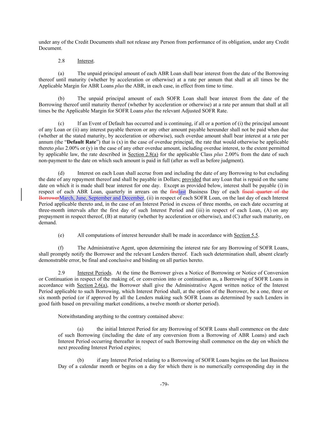 under any of the Credit Documents shall not release any Person from performance of its obligation, under any Credit Document. 2.8 Interest. (a) The unpaid principal amount of each ABR Loan shall bear interest from the date of the Borrowing thereof until maturity (whether by acceleration or otherwise) at a rate per annum that shall at all times be the Applicable Margin for ABR Loans plus the ABR, in each case, in effect from time to time. (b) The unpaid principal amount of each SOFR Loan shall bear interest from the date of the Borrowing thereof until maturity thereof (whether by acceleration or otherwise) at a rate per annum that shall at all times be the Applicable Margin for SOFR Loans plus the relevant Adjusted SOFR Rate. (c) If an Event of Default has occurred and is continuing, if all or a portion of (i) the principal amount of any Loan or (ii) any interest payable thereon or any other amount payable hereunder shall not be paid when due (whether at the stated maturity, by acceleration or otherwise), such overdue amount shall bear interest at a rate per annum (the “Default Rate”) that is (x) in the case of overdue principal, the rate that would otherwise be applicable thereto plus 2.00% or (y) in the case of any other overdue amount, including overdue interest, to the extent permitted by applicable law, the rate described in Section 2.8(a) for the applicable Class plus 2.00% from the date of such non-payment to the date on which such amount is paid in full (after as well as before judgment). (d) Interest on each Loan shall accrue from and including the date of any Borrowing to but excluding the date of any repayment thereof and shall be payable in Dollars; provided that any Loan that is repaid on the same date on which it is made shall bear interest for one day. Except as provided below, interest shall be payable (i) in respect of each ABR Loan, quarterly in arrears on the firstlast Business Day of each fiscal quarter of the BorrowerMarch, June, September and December, (ii) in respect of each SOFR Loan, on the last day of each Interest Period applicable thereto and, in the case of an Interest Period in excess of three months, on each date occurring at three-month intervals after the first day of such Interest Period and (iii) in respect of each Loan, (A) on any prepayment in respect thereof, (B) at maturity (whether by acceleration or otherwise), and (C) after such maturity, on demand. (e) All computations of interest hereunder shall be made in accordance with Section 5.5. (f) The Administrative Agent, upon determining the interest rate for any Borrowing of SOFR Loans, shall promptly notify the Borrower and the relevant Lenders thereof. Each such determination shall, absent clearly demonstrable error, be final and conclusive and binding on all parties hereto. 2.9 Interest Periods. At the time the Borrower gives a Notice of Borrowing or Notice of Conversion or Continuation in respect of the making of, or conversion into or continuation as, a Borrowing of SOFR Loans in accordance with Section 2.6(a), the Borrower shall give the Administrative Agent written notice of the Interest Period applicable to such Borrowing, which Interest Period shall, at the option of the Borrower, be a one, three or six month period (or if approved by all the Lenders making such SOFR Loans as determined by such Lenders in good faith based on prevailing market conditions, a twelve month or shorter period). Notwithstanding anything to the contrary contained above: (a) the initial Interest Period for any Borrowing of SOFR Loans shall commence on the date of such Borrowing (including the date of any conversion from a Borrowing of ABR Loans) and each Interest Period occurring thereafter in respect of such Borrowing shall commence on the day on which the next preceding Interest Period expires; (b) if any Interest Period relating to a Borrowing of SOFR Loans begins on the last Business Day of a calendar month or begins on a day for which there is no numerically corresponding day in the -79-