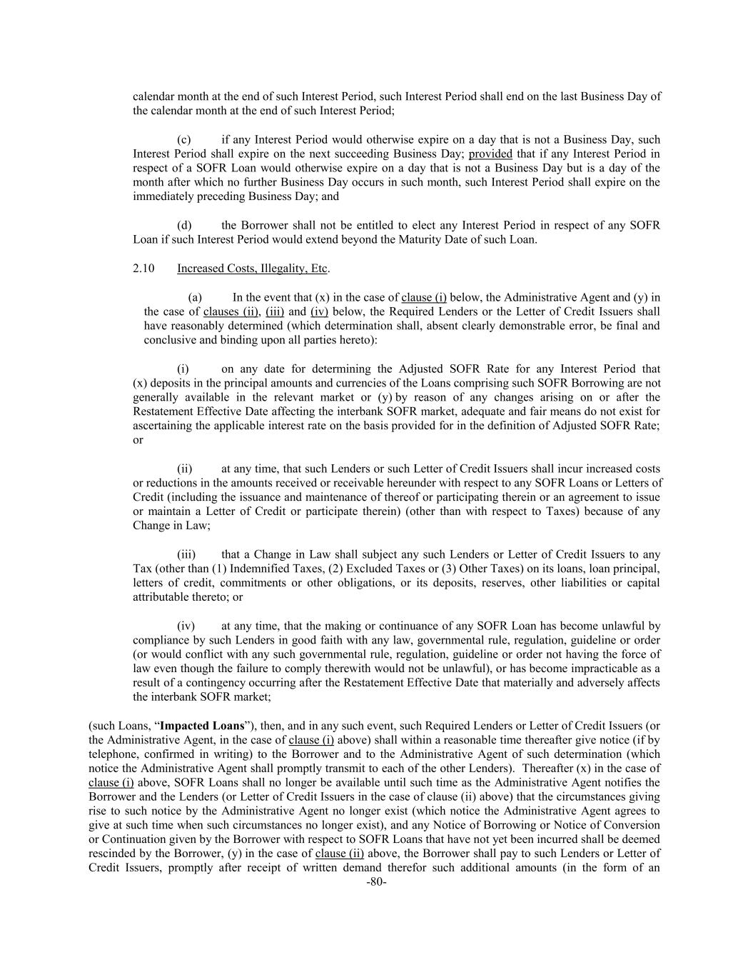 calendar month at the end of such Interest Period, such Interest Period shall end on the last Business Day of the calendar month at the end of such Interest Period; (c) if any Interest Period would otherwise expire on a day that is not a Business Day, such Interest Period shall expire on the next succeeding Business Day; provided that if any Interest Period in respect of a SOFR Loan would otherwise expire on a day that is not a Business Day but is a day of the month after which no further Business Day occurs in such month, such Interest Period shall expire on the immediately preceding Business Day; and (d) the Borrower shall not be entitled to elect any Interest Period in respect of any SOFR Loan if such Interest Period would extend beyond the Maturity Date of such Loan. 2.10 Increased Costs, Illegality, Etc. (a) In the event that (x) in the case of clause (i) below, the Administrative Agent and (y) in the case of clauses (ii), (iii) and (iv) below, the Required Lenders or the Letter of Credit Issuers shall have reasonably determined (which determination shall, absent clearly demonstrable error, be final and conclusive and binding upon all parties hereto): (i) on any date for determining the Adjusted SOFR Rate for any Interest Period that (x) deposits in the principal amounts and currencies of the Loans comprising such SOFR Borrowing are not generally available in the relevant market or (y) by reason of any changes arising on or after the Restatement Effective Date affecting the interbank SOFR market, adequate and fair means do not exist for ascertaining the applicable interest rate on the basis provided for in the definition of Adjusted SOFR Rate; or (ii) at any time, that such Lenders or such Letter of Credit Issuers shall incur increased costs or reductions in the amounts received or receivable hereunder with respect to any SOFR Loans or Letters of Credit (including the issuance and maintenance of thereof or participating therein or an agreement to issue or maintain a Letter of Credit or participate therein) (other than with respect to Taxes) because of any Change in Law; (iii) that a Change in Law shall subject any such Lenders or Letter of Credit Issuers to any Tax (other than (1) Indemnified Taxes, (2) Excluded Taxes or (3) Other Taxes) on its loans, loan principal, letters of credit, commitments or other obligations, or its deposits, reserves, other liabilities or capital attributable thereto; or (iv) at any time, that the making or continuance of any SOFR Loan has become unlawful by compliance by such Lenders in good faith with any law, governmental rule, regulation, guideline or order (or would conflict with any such governmental rule, regulation, guideline or order not having the force of law even though the failure to comply therewith would not be unlawful), or has become impracticable as a result of a contingency occurring after the Restatement Effective Date that materially and adversely affects the interbank SOFR market; (such Loans, “Impacted Loans”), then, and in any such event, such Required Lenders or Letter of Credit Issuers (or the Administrative Agent, in the case of clause (i) above) shall within a reasonable time thereafter give notice (if by telephone, confirmed in writing) to the Borrower and to the Administrative Agent of such determination (which notice the Administrative Agent shall promptly transmit to each of the other Lenders). Thereafter (x) in the case of clause (i) above, SOFR Loans shall no longer be available until such time as the Administrative Agent notifies the Borrower and the Lenders (or Letter of Credit Issuers in the case of clause (ii) above) that the circumstances giving rise to such notice by the Administrative Agent no longer exist (which notice the Administrative Agent agrees to give at such time when such circumstances no longer exist), and any Notice of Borrowing or Notice of Conversion or Continuation given by the Borrower with respect to SOFR Loans that have not yet been incurred shall be deemed rescinded by the Borrower, (y) in the case of clause (ii) above, the Borrower shall pay to such Lenders or Letter of Credit Issuers, promptly after receipt of written demand therefor such additional amounts (in the form of an -80-