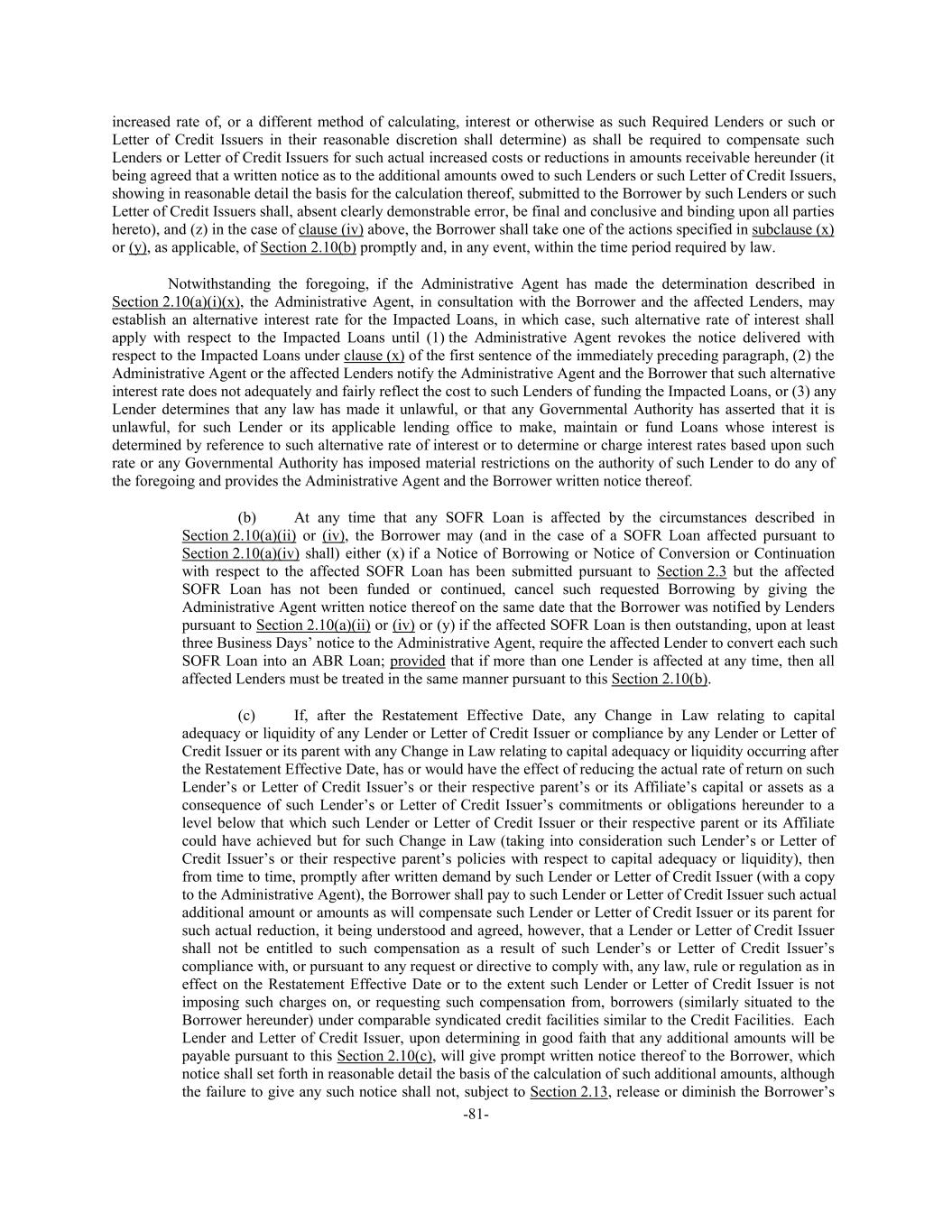 increased rate of, or a different method of calculating, interest or otherwise as such Required Lenders or such or Letter of Credit Issuers in their reasonable discretion shall determine) as shall be required to compensate such Lenders or Letter of Credit Issuers for such actual increased costs or reductions in amounts receivable hereunder (it being agreed that a written notice as to the additional amounts owed to such Lenders or such Letter of Credit Issuers, showing in reasonable detail the basis for the calculation thereof, submitted to the Borrower by such Lenders or such Letter of Credit Issuers shall, absent clearly demonstrable error, be final and conclusive and binding upon all parties hereto), and (z) in the case of clause (iv) above, the Borrower shall take one of the actions specified in subclause (x) or (y), as applicable, of Section 2.10(b) promptly and, in any event, within the time period required by law. Notwithstanding the foregoing, if the Administrative Agent has made the determination described in Section 2.10(a)(i)(x), the Administrative Agent, in consultation with the Borrower and the affected Lenders, may establish an alternative interest rate for the Impacted Loans, in which case, such alternative rate of interest shall apply with respect to the Impacted Loans until (1) the Administrative Agent revokes the notice delivered with respect to the Impacted Loans under clause (x) of the first sentence of the immediately preceding paragraph, (2) the Administrative Agent or the affected Lenders notify the Administrative Agent and the Borrower that such alternative interest rate does not adequately and fairly reflect the cost to such Lenders of funding the Impacted Loans, or (3) any Lender determines that any law has made it unlawful, or that any Governmental Authority has asserted that it is unlawful, for such Lender or its applicable lending office to make, maintain or fund Loans whose interest is determined by reference to such alternative rate of interest or to determine or charge interest rates based upon such rate or any Governmental Authority has imposed material restrictions on the authority of such Lender to do any of the foregoing and provides the Administrative Agent and the Borrower written notice thereof. (b) At any time that any SOFR Loan is affected by the circumstances described in Section 2.10(a)(ii) or (iv), the Borrower may (and in the case of a SOFR Loan affected pursuant to Section 2.10(a)(iv) shall) either (x) if a Notice of Borrowing or Notice of Conversion or Continuation with respect to the affected SOFR Loan has been submitted pursuant to Section 2.3 but the affected SOFR Loan has not been funded or continued, cancel such requested Borrowing by giving the Administrative Agent written notice thereof on the same date that the Borrower was notified by Lenders pursuant to Section 2.10(a)(ii) or (iv) or (y) if the affected SOFR Loan is then outstanding, upon at least three Business Days’ notice to the Administrative Agent, require the affected Lender to convert each such SOFR Loan into an ABR Loan; provided that if more than one Lender is affected at any time, then all affected Lenders must be treated in the same manner pursuant to this Section 2.10(b). (c) If, after the Restatement Effective Date, any Change in Law relating to capital adequacy or liquidity of any Lender or Letter of Credit Issuer or compliance by any Lender or Letter of Credit Issuer or its parent with any Change in Law relating to capital adequacy or liquidity occurring after the Restatement Effective Date, has or would have the effect of reducing the actual rate of return on such Lender’s or Letter of Credit Issuer’s or their respective parent’s or its Affiliate’s capital or assets as a consequence of such Lender’s or Letter of Credit Issuer’s commitments or obligations hereunder to a level below that which such Lender or Letter of Credit Issuer or their respective parent or its Affiliate could have achieved but for such Change in Law (taking into consideration such Lender’s or Letter of Credit Issuer’s or their respective parent’s policies with respect to capital adequacy or liquidity), then from time to time, promptly after written demand by such Lender or Letter of Credit Issuer (with a copy to the Administrative Agent), the Borrower shall pay to such Lender or Letter of Credit Issuer such actual additional amount or amounts as will compensate such Lender or Letter of Credit Issuer or its parent for such actual reduction, it being understood and agreed, however, that a Lender or Letter of Credit Issuer shall not be entitled to such compensation as a result of such Lender’s or Letter of Credit Issuer’s compliance with, or pursuant to any request or directive to comply with, any law, rule or regulation as in effect on the Restatement Effective Date or to the extent such Lender or Letter of Credit Issuer is not imposing such charges on, or requesting such compensation from, borrowers (similarly situated to the Borrower hereunder) under comparable syndicated credit facilities similar to the Credit Facilities. Each Lender and Letter of Credit Issuer, upon determining in good faith that any additional amounts will be payable pursuant to this Section 2.10(c), will give prompt written notice thereof to the Borrower, which notice shall set forth in reasonable detail the basis of the calculation of such additional amounts, although the failure to give any such notice shall not, subject to Section 2.13, release or diminish the Borrower’s -81-