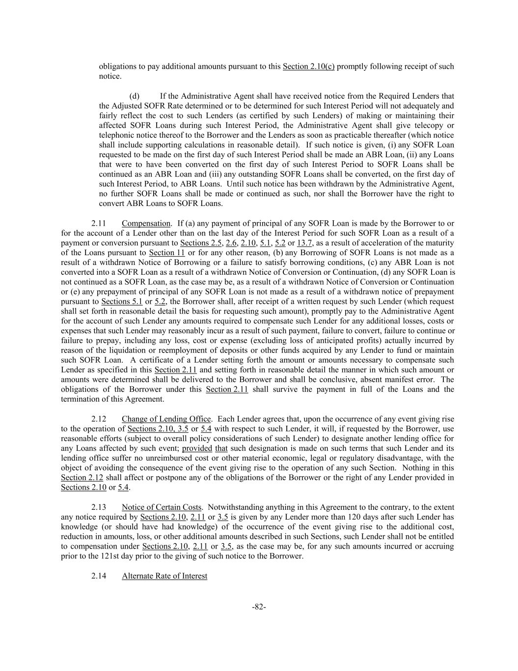 obligations to pay additional amounts pursuant to this Section 2.10(c) promptly following receipt of such notice. (d) If the Administrative Agent shall have received notice from the Required Lenders that the Adjusted SOFR Rate determined or to be determined for such Interest Period will not adequately and fairly reflect the cost to such Lenders (as certified by such Lenders) of making or maintaining their affected SOFR Loans during such Interest Period, the Administrative Agent shall give telecopy or telephonic notice thereof to the Borrower and the Lenders as soon as practicable thereafter (which notice shall include supporting calculations in reasonable detail). If such notice is given, (i) any SOFR Loan requested to be made on the first day of such Interest Period shall be made an ABR Loan, (ii) any Loans that were to have been converted on the first day of such Interest Period to SOFR Loans shall be continued as an ABR Loan and (iii) any outstanding SOFR Loans shall be converted, on the first day of such Interest Period, to ABR Loans. Until such notice has been withdrawn by the Administrative Agent, no further SOFR Loans shall be made or continued as such, nor shall the Borrower have the right to convert ABR Loans to SOFR Loans. 2.11 Compensation. If (a) any payment of principal of any SOFR Loan is made by the Borrower to or for the account of a Lender other than on the last day of the Interest Period for such SOFR Loan as a result of a payment or conversion pursuant to Sections 2.5, 2.6, 2.10, 5.1, 5.2 or 13.7, as a result of acceleration of the maturity of the Loans pursuant to Section 11 or for any other reason, (b) any Borrowing of SOFR Loans is not made as a result of a withdrawn Notice of Borrowing or a failure to satisfy borrowing conditions, (c) any ABR Loan is not converted into a SOFR Loan as a result of a withdrawn Notice of Conversion or Continuation, (d) any SOFR Loan is not continued as a SOFR Loan, as the case may be, as a result of a withdrawn Notice of Conversion or Continuation or (e) any prepayment of principal of any SOFR Loan is not made as a result of a withdrawn notice of prepayment pursuant to Sections 5.1 or 5.2, the Borrower shall, after receipt of a written request by such Lender (which request shall set forth in reasonable detail the basis for requesting such amount), promptly pay to the Administrative Agent for the account of such Lender any amounts required to compensate such Lender for any additional losses, costs or expenses that such Lender may reasonably incur as a result of such payment, failure to convert, failure to continue or failure to prepay, including any loss, cost or expense (excluding loss of anticipated profits) actually incurred by reason of the liquidation or reemployment of deposits or other funds acquired by any Lender to fund or maintain such SOFR Loan. A certificate of a Lender setting forth the amount or amounts necessary to compensate such Lender as specified in this Section 2.11 and setting forth in reasonable detail the manner in which such amount or amounts were determined shall be delivered to the Borrower and shall be conclusive, absent manifest error. The obligations of the Borrower under this Section 2.11 shall survive the payment in full of the Loans and the termination of this Agreement. 2.12 Change of Lending Office. Each Lender agrees that, upon the occurrence of any event giving rise to the operation of Sections 2.10, 3.5 or 5.4 with respect to such Lender, it will, if requested by the Borrower, use reasonable efforts (subject to overall policy considerations of such Lender) to designate another lending office for any Loans affected by such event; provided that such designation is made on such terms that such Lender and its lending office suffer no unreimbursed cost or other material economic, legal or regulatory disadvantage, with the object of avoiding the consequence of the event giving rise to the operation of any such Section. Nothing in this Section 2.12 shall affect or postpone any of the obligations of the Borrower or the right of any Lender provided in Sections 2.10 or 5.4. 2.13 Notice of Certain Costs. Notwithstanding anything in this Agreement to the contrary, to the extent any notice required by Sections 2.10, 2.11 or 3.5 is given by any Lender more than 120 days after such Lender has knowledge (or should have had knowledge) of the occurrence of the event giving rise to the additional cost, reduction in amounts, loss, or other additional amounts described in such Sections, such Lender shall not be entitled to compensation under Sections 2.10, 2.11 or 3.5, as the case may be, for any such amounts incurred or accruing prior to the 121st day prior to the giving of such notice to the Borrower. 2.14 Alternate Rate of Interest -82-