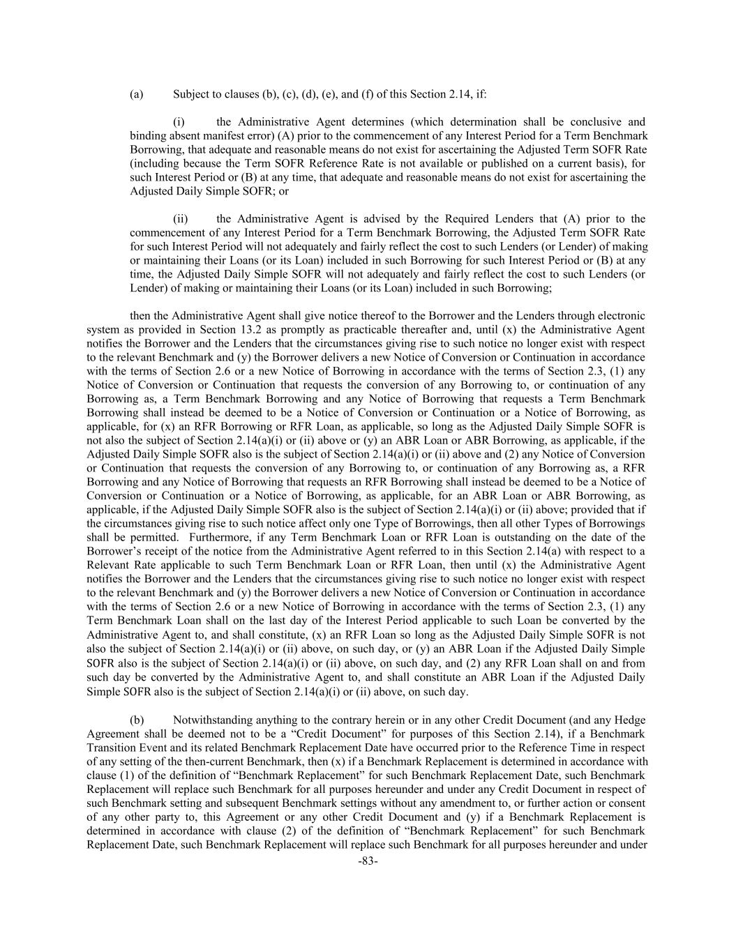 (a) Subject to clauses (b), (c), (d), (e), and (f) of this Section 2.14, if: (i) the Administrative Agent determines (which determination shall be conclusive and binding absent manifest error) (A) prior to the commencement of any Interest Period for a Term Benchmark Borrowing, that adequate and reasonable means do not exist for ascertaining the Adjusted Term SOFR Rate (including because the Term SOFR Reference Rate is not available or published on a current basis), for such Interest Period or (B) at any time, that adequate and reasonable means do not exist for ascertaining the Adjusted Daily Simple SOFR; or (ii) the Administrative Agent is advised by the Required Lenders that (A) prior to the commencement of any Interest Period for a Term Benchmark Borrowing, the Adjusted Term SOFR Rate for such Interest Period will not adequately and fairly reflect the cost to such Lenders (or Lender) of making or maintaining their Loans (or its Loan) included in such Borrowing for such Interest Period or (B) at any time, the Adjusted Daily Simple SOFR will not adequately and fairly reflect the cost to such Lenders (or Lender) of making or maintaining their Loans (or its Loan) included in such Borrowing; then the Administrative Agent shall give notice thereof to the Borrower and the Lenders through electronic system as provided in Section 13.2 as promptly as practicable thereafter and, until (x) the Administrative Agent notifies the Borrower and the Lenders that the circumstances giving rise to such notice no longer exist with respect to the relevant Benchmark and (y) the Borrower delivers a new Notice of Conversion or Continuation in accordance with the terms of Section 2.6 or a new Notice of Borrowing in accordance with the terms of Section 2.3, (1) any Notice of Conversion or Continuation that requests the conversion of any Borrowing to, or continuation of any Borrowing as, a Term Benchmark Borrowing and any Notice of Borrowing that requests a Term Benchmark Borrowing shall instead be deemed to be a Notice of Conversion or Continuation or a Notice of Borrowing, as applicable, for (x) an RFR Borrowing or RFR Loan, as applicable, so long as the Adjusted Daily Simple SOFR is not also the subject of Section 2.14(a)(i) or (ii) above or (y) an ABR Loan or ABR Borrowing, as applicable, if the Adjusted Daily Simple SOFR also is the subject of Section 2.14(a)(i) or (ii) above and (2) any Notice of Conversion or Continuation that requests the conversion of any Borrowing to, or continuation of any Borrowing as, a RFR Borrowing and any Notice of Borrowing that requests an RFR Borrowing shall instead be deemed to be a Notice of Conversion or Continuation or a Notice of Borrowing, as applicable, for an ABR Loan or ABR Borrowing, as applicable, if the Adjusted Daily Simple SOFR also is the subject of Section 2.14(a)(i) or (ii) above; provided that if the circumstances giving rise to such notice affect only one Type of Borrowings, then all other Types of Borrowings shall be permitted. Furthermore, if any Term Benchmark Loan or RFR Loan is outstanding on the date of the Borrower’s receipt of the notice from the Administrative Agent referred to in this Section 2.14(a) with respect to a Relevant Rate applicable to such Term Benchmark Loan or RFR Loan, then until (x) the Administrative Agent notifies the Borrower and the Lenders that the circumstances giving rise to such notice no longer exist with respect to the relevant Benchmark and (y) the Borrower delivers a new Notice of Conversion or Continuation in accordance with the terms of Section 2.6 or a new Notice of Borrowing in accordance with the terms of Section 2.3, (1) any Term Benchmark Loan shall on the last day of the Interest Period applicable to such Loan be converted by the Administrative Agent to, and shall constitute, (x) an RFR Loan so long as the Adjusted Daily Simple SOFR is not also the subject of Section 2.14(a)(i) or (ii) above, on such day, or (y) an ABR Loan if the Adjusted Daily Simple SOFR also is the subject of Section 2.14(a)(i) or (ii) above, on such day, and (2) any RFR Loan shall on and from such day be converted by the Administrative Agent to, and shall constitute an ABR Loan if the Adjusted Daily Simple SOFR also is the subject of Section 2.14(a)(i) or (ii) above, on such day. (b) Notwithstanding anything to the contrary herein or in any other Credit Document (and any Hedge Agreement shall be deemed not to be a “Credit Document” for purposes of this Section 2.14), if a Benchmark Transition Event and its related Benchmark Replacement Date have occurred prior to the Reference Time in respect of any setting of the then-current Benchmark, then (x) if a Benchmark Replacement is determined in accordance with clause (1) of the definition of “Benchmark Replacement” for such Benchmark Replacement Date, such Benchmark Replacement will replace such Benchmark for all purposes hereunder and under any Credit Document in respect of such Benchmark setting and subsequent Benchmark settings without any amendment to, or further action or consent of any other party to, this Agreement or any other Credit Document and (y) if a Benchmark Replacement is determined in accordance with clause (2) of the definition of “Benchmark Replacement” for such Benchmark Replacement Date, such Benchmark Replacement will replace such Benchmark for all purposes hereunder and under -83-