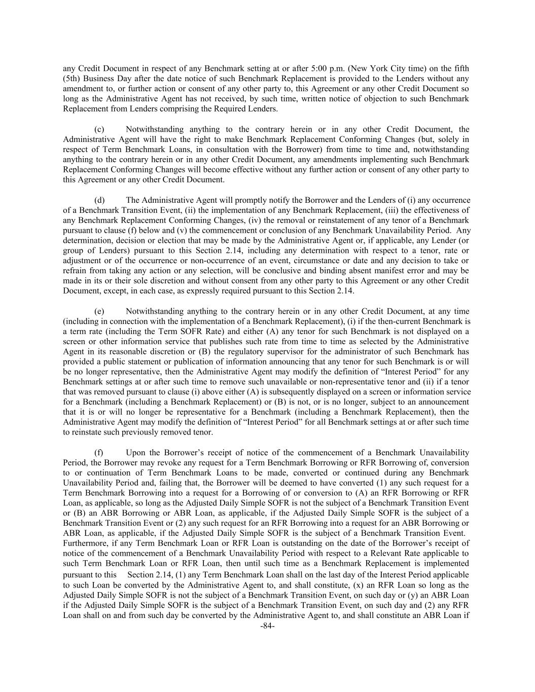 any Credit Document in respect of any Benchmark setting at or after 5:00 p.m. (New York City time) on the fifth (5th) Business Day after the date notice of such Benchmark Replacement is provided to the Lenders without any amendment to, or further action or consent of any other party to, this Agreement or any other Credit Document so long as the Administrative Agent has not received, by such time, written notice of objection to such Benchmark Replacement from Lenders comprising the Required Lenders. (c) Notwithstanding anything to the contrary herein or in any other Credit Document, the Administrative Agent will have the right to make Benchmark Replacement Conforming Changes (but, solely in respect of Term Benchmark Loans, in consultation with the Borrower) from time to time and, notwithstanding anything to the contrary herein or in any other Credit Document, any amendments implementing such Benchmark Replacement Conforming Changes will become effective without any further action or consent of any other party to this Agreement or any other Credit Document. (d) The Administrative Agent will promptly notify the Borrower and the Lenders of (i) any occurrence of a Benchmark Transition Event, (ii) the implementation of any Benchmark Replacement, (iii) the effectiveness of any Benchmark Replacement Conforming Changes, (iv) the removal or reinstatement of any tenor of a Benchmark pursuant to clause (f) below and (v) the commencement or conclusion of any Benchmark Unavailability Period. Any determination, decision or election that may be made by the Administrative Agent or, if applicable, any Lender (or group of Lenders) pursuant to this Section 2.14, including any determination with respect to a tenor, rate or adjustment or of the occurrence or non-occurrence of an event, circumstance or date and any decision to take or refrain from taking any action or any selection, will be conclusive and binding absent manifest error and may be made in its or their sole discretion and without consent from any other party to this Agreement or any other Credit Document, except, in each case, as expressly required pursuant to this Section 2.14. (e) Notwithstanding anything to the contrary herein or in any other Credit Document, at any time (including in connection with the implementation of a Benchmark Replacement), (i) if the then-current Benchmark is a term rate (including the Term SOFR Rate) and either (A) any tenor for such Benchmark is not displayed on a screen or other information service that publishes such rate from time to time as selected by the Administrative Agent in its reasonable discretion or (B) the regulatory supervisor for the administrator of such Benchmark has provided a public statement or publication of information announcing that any tenor for such Benchmark is or will be no longer representative, then the Administrative Agent may modify the definition of “Interest Period” for any Benchmark settings at or after such time to remove such unavailable or non-representative tenor and (ii) if a tenor that was removed pursuant to clause (i) above either (A) is subsequently displayed on a screen or information service for a Benchmark (including a Benchmark Replacement) or (B) is not, or is no longer, subject to an announcement that it is or will no longer be representative for a Benchmark (including a Benchmark Replacement), then the Administrative Agent may modify the definition of “Interest Period” for all Benchmark settings at or after such time to reinstate such previously removed tenor. (f) Upon the Borrower’s receipt of notice of the commencement of a Benchmark Unavailability Period, the Borrower may revoke any request for a Term Benchmark Borrowing or RFR Borrowing of, conversion to or continuation of Term Benchmark Loans to be made, converted or continued during any Benchmark Unavailability Period and, failing that, the Borrower will be deemed to have converted (1) any such request for a Term Benchmark Borrowing into a request for a Borrowing of or conversion to (A) an RFR Borrowing or RFR Loan, as applicable, so long as the Adjusted Daily Simple SOFR is not the subject of a Benchmark Transition Event or (B) an ABR Borrowing or ABR Loan, as applicable, if the Adjusted Daily Simple SOFR is the subject of a Benchmark Transition Event or (2) any such request for an RFR Borrowing into a request for an ABR Borrowing or ABR Loan, as applicable, if the Adjusted Daily Simple SOFR is the subject of a Benchmark Transition Event. Furthermore, if any Term Benchmark Loan or RFR Loan is outstanding on the date of the Borrower’s receipt of notice of the commencement of a Benchmark Unavailability Period with respect to a Relevant Rate applicable to such Term Benchmark Loan or RFR Loan, then until such time as a Benchmark Replacement is implemented pursuant to this Section 2.14, (1) any Term Benchmark Loan shall on the last day of the Interest Period applicable to such Loan be converted by the Administrative Agent to, and shall constitute, (x) an RFR Loan so long as the Adjusted Daily Simple SOFR is not the subject of a Benchmark Transition Event, on such day or (y) an ABR Loan if the Adjusted Daily Simple SOFR is the subject of a Benchmark Transition Event, on such day and (2) any RFR Loan shall on and from such day be converted by the Administrative Agent to, and shall constitute an ABR Loan if -84-