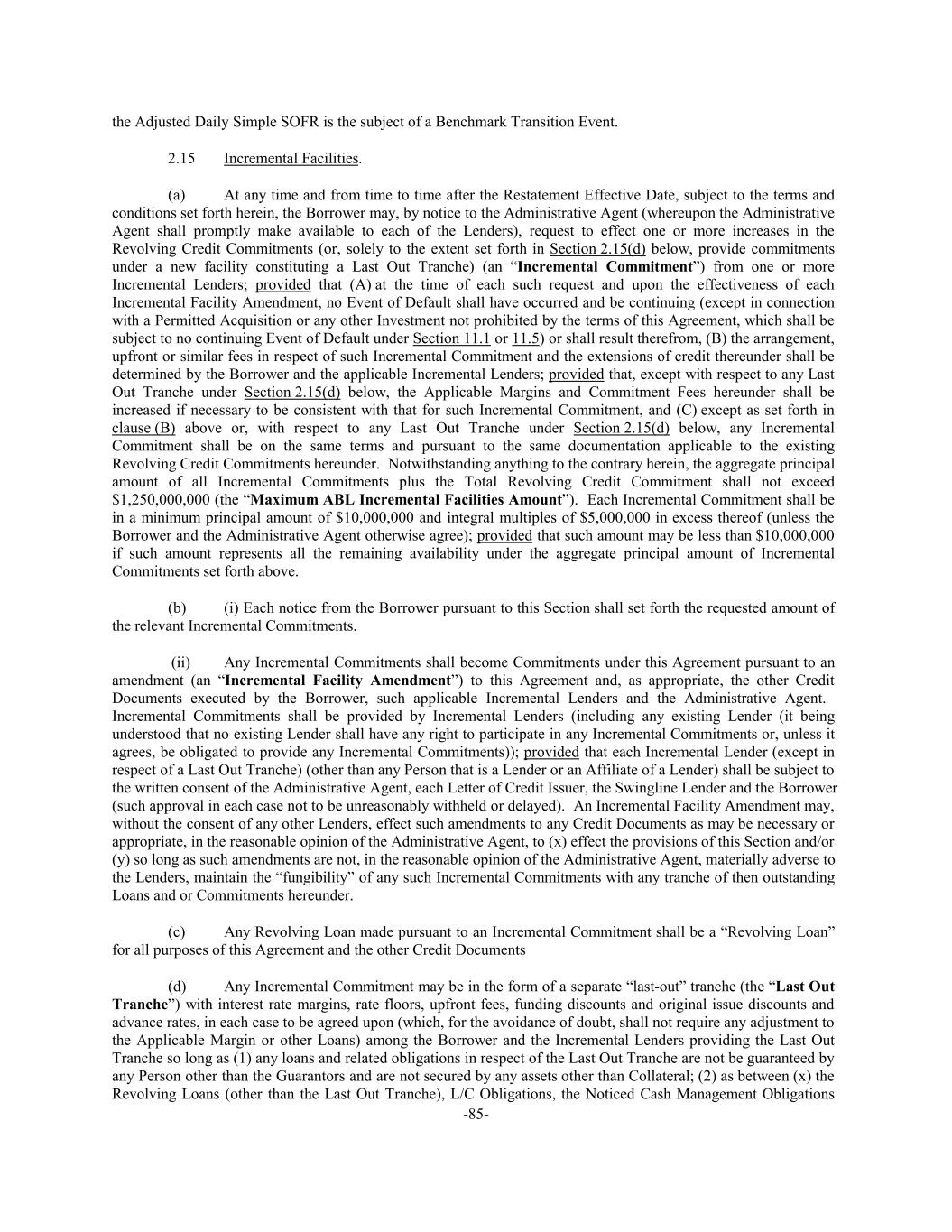 the Adjusted Daily Simple SOFR is the subject of a Benchmark Transition Event. 2.15 Incremental Facilities. (a) At any time and from time to time after the Restatement Effective Date, subject to the terms and conditions set forth herein, the Borrower may, by notice to the Administrative Agent (whereupon the Administrative Agent shall promptly make available to each of the Lenders), request to effect one or more increases in the Revolving Credit Commitments (or, solely to the extent set forth in Section 2.15(d) below, provide commitments under a new facility constituting a Last Out Tranche) (an “Incremental Commitment”) from one or more Incremental Lenders; provided that (A) at the time of each such request and upon the effectiveness of each Incremental Facility Amendment, no Event of Default shall have occurred and be continuing (except in connection with a Permitted Acquisition or any other Investment not prohibited by the terms of this Agreement, which shall be subject to no continuing Event of Default under Section 11.1 or 11.5) or shall result therefrom, (B) the arrangement, upfront or similar fees in respect of such Incremental Commitment and the extensions of credit thereunder shall be determined by the Borrower and the applicable Incremental Lenders; provided that, except with respect to any Last Out Tranche under Section 2.15(d) below, the Applicable Margins and Commitment Fees hereunder shall be increased if necessary to be consistent with that for such Incremental Commitment, and (C) except as set forth in clause (B) above or, with respect to any Last Out Tranche under Section 2.15(d) below, any Incremental Commitment shall be on the same terms and pursuant to the same documentation applicable to the existing Revolving Credit Commitments hereunder. Notwithstanding anything to the contrary herein, the aggregate principal amount of all Incremental Commitments plus the Total Revolving Credit Commitment shall not exceed $1,250,000,000 (the “Maximum ABL Incremental Facilities Amount”). Each Incremental Commitment shall be in a minimum principal amount of $10,000,000 and integral multiples of $5,000,000 in excess thereof (unless the Borrower and the Administrative Agent otherwise agree); provided that such amount may be less than $10,000,000 if such amount represents all the remaining availability under the aggregate principal amount of Incremental Commitments set forth above. (b) (i) Each notice from the Borrower pursuant to this Section shall set forth the requested amount of the relevant Incremental Commitments. (ii) Any Incremental Commitments shall become Commitments under this Agreement pursuant to an amendment (an “Incremental Facility Amendment”) to this Agreement and, as appropriate, the other Credit Documents executed by the Borrower, such applicable Incremental Lenders and the Administrative Agent. Incremental Commitments shall be provided by Incremental Lenders (including any existing Lender (it being understood that no existing Lender shall have any right to participate in any Incremental Commitments or, unless it agrees, be obligated to provide any Incremental Commitments)); provided that each Incremental Lender (except in respect of a Last Out Tranche) (other than any Person that is a Lender or an Affiliate of a Lender) shall be subject to the written consent of the Administrative Agent, each Letter of Credit Issuer, the Swingline Lender and the Borrower (such approval in each case not to be unreasonably withheld or delayed). An Incremental Facility Amendment may, without the consent of any other Lenders, effect such amendments to any Credit Documents as may be necessary or appropriate, in the reasonable opinion of the Administrative Agent, to (x) effect the provisions of this Section and/or (y) so long as such amendments are not, in the reasonable opinion of the Administrative Agent, materially adverse to the Lenders, maintain the “fungibility” of any such Incremental Commitments with any tranche of then outstanding Loans and or Commitments hereunder. (c) Any Revolving Loan made pursuant to an Incremental Commitment shall be a “Revolving Loan” for all purposes of this Agreement and the other Credit Documents (d) Any Incremental Commitment may be in the form of a separate “last-out” tranche (the “Last Out Tranche”) with interest rate margins, rate floors, upfront fees, funding discounts and original issue discounts and advance rates, in each case to be agreed upon (which, for the avoidance of doubt, shall not require any adjustment to the Applicable Margin or other Loans) among the Borrower and the Incremental Lenders providing the Last Out Tranche so long as (1) any loans and related obligations in respect of the Last Out Tranche are not be guaranteed by any Person other than the Guarantors and are not secured by any assets other than Collateral; (2) as between (x) the Revolving Loans (other than the Last Out Tranche), L/C Obligations, the Noticed Cash Management Obligations -85-