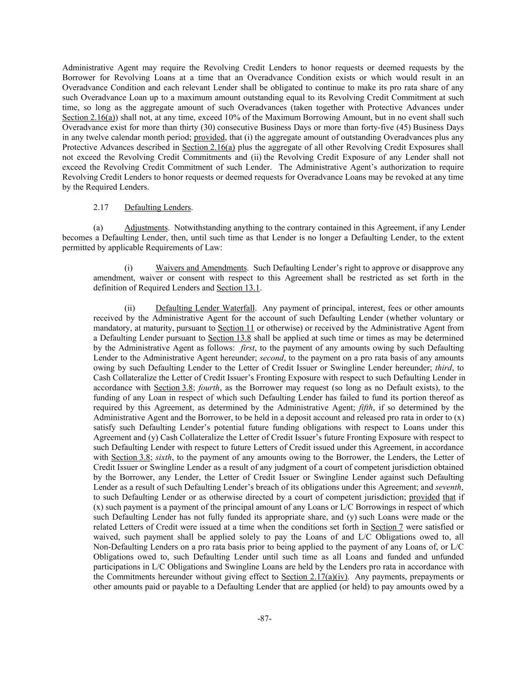 Administrative Agent may require the Revolving Credit Lenders to honor requests or deemed requests by the Borrower for Revolving Loans at a time that an Overadvance Condition exists or which would result in an Overadvance Condition and each relevant Lender shall be obligated to continue to make its pro rata share of any such Overadvance Loan up to a maximum amount outstanding equal to its Revolving Credit Commitment at such time, so long as the aggregate amount of such Overadvances (taken together with Protective Advances under Section 2.16(a)) shall not, at any time, exceed 10% of the Maximum Borrowing Amount, but in no event shall such Overadvance exist for more than thirty (30) consecutive Business Days or more than forty-five (45) Business Days in any twelve calendar month period; provided, that (i) the aggregate amount of outstanding Overadvances plus any Protective Advances described in Section 2.16(a) plus the aggregate of all other Revolving Credit Exposures shall not exceed the Revolving Credit Commitments and (ii) the Revolving Credit Exposure of any Lender shall not exceed the Revolving Credit Commitment of such Lender. The Administrative Agent’s authorization to require Revolving Credit Lenders to honor requests or deemed requests for Overadvance Loans may be revoked at any time by the Required Lenders. 2.17 Defaulting Lenders. (a) Adjustments. Notwithstanding anything to the contrary contained in this Agreement, if any Lender becomes a Defaulting Lender, then, until such time as that Lender is no longer a Defaulting Lender, to the extent permitted by applicable Requirements of Law: (i) Waivers and Amendments. Such Defaulting Lender’s right to approve or disapprove any amendment, waiver or consent with respect to this Agreement shall be restricted as set forth in the definition of Required Lenders and Section 13.1. (ii) Defaulting Lender Waterfall. Any payment of principal, interest, fees or other amounts received by the Administrative Agent for the account of such Defaulting Lender (whether voluntary or mandatory, at maturity, pursuant to Section 11 or otherwise) or received by the Administrative Agent from a Defaulting Lender pursuant to Section 13.8 shall be applied at such time or times as may be determined by the Administrative Agent as follows: first, to the payment of any amounts owing by such Defaulting Lender to the Administrative Agent hereunder; second, to the payment on a pro rata basis of any amounts owing by such Defaulting Lender to the Letter of Credit Issuer or Swingline Lender hereunder; third, to Cash Collateralize the Letter of Credit Issuer’s Fronting Exposure with respect to such Defaulting Lender in accordance with Section 3.8; fourth, as the Borrower may request (so long as no Default exists), to the funding of any Loan in respect of which such Defaulting Lender has failed to fund its portion thereof as required by this Agreement, as determined by the Administrative Agent; fifth, if so determined by the Administrative Agent and the Borrower, to be held in a deposit account and released pro rata in order to (x) satisfy such Defaulting Lender’s potential future funding obligations with respect to Loans under this Agreement and (y) Cash Collateralize the Letter of Credit Issuer’s future Fronting Exposure with respect to such Defaulting Lender with respect to future Letters of Credit issued under this Agreement, in accordance with Section 3.8; sixth, to the payment of any amounts owing to the Borrower, the Lenders, the Letter of Credit Issuer or Swingline Lender as a result of any judgment of a court of competent jurisdiction obtained by the Borrower, any Lender, the Letter of Credit Issuer or Swingline Lender against such Defaulting Lender as a result of such Defaulting Lender’s breach of its obligations under this Agreement; and seventh, to such Defaulting Lender or as otherwise directed by a court of competent jurisdiction; provided that if (x) such payment is a payment of the principal amount of any Loans or L/C Borrowings in respect of which such Defaulting Lender has not fully funded its appropriate share, and (y) such Loans were made or the related Letters of Credit were issued at a time when the conditions set forth in Section 7 were satisfied or waived, such payment shall be applied solely to pay the Loans of and L/C Obligations owed to, all Non-Defaulting Lenders on a pro rata basis prior to being applied to the payment of any Loans of, or L/C Obligations owed to, such Defaulting Lender until such time as all Loans and funded and unfunded participations in L/C Obligations and Swingline Loans are held by the Lenders pro rata in accordance with the Commitments hereunder without giving effect to Section 2.17(a)(iv). Any payments, prepayments or other amounts paid or payable to a Defaulting Lender that are applied (or held) to pay amounts owed by a -87-