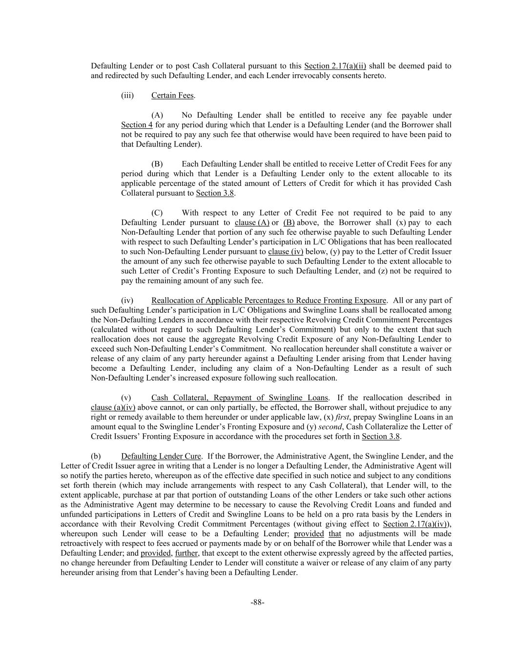 Defaulting Lender or to post Cash Collateral pursuant to this Section 2.17(a)(ii) shall be deemed paid to and redirected by such Defaulting Lender, and each Lender irrevocably consents hereto. (iii) Certain Fees. (A) No Defaulting Lender shall be entitled to receive any fee payable under Section 4 for any period during which that Lender is a Defaulting Lender (and the Borrower shall not be required to pay any such fee that otherwise would have been required to have been paid to that Defaulting Lender). (B) Each Defaulting Lender shall be entitled to receive Letter of Credit Fees for any period during which that Lender is a Defaulting Lender only to the extent allocable to its applicable percentage of the stated amount of Letters of Credit for which it has provided Cash Collateral pursuant to Section 3.8. (C) With respect to any Letter of Credit Fee not required to be paid to any Defaulting Lender pursuant to clause (A) or (B) above, the Borrower shall (x) pay to each Non-Defaulting Lender that portion of any such fee otherwise payable to such Defaulting Lender with respect to such Defaulting Lender’s participation in L/C Obligations that has been reallocated to such Non-Defaulting Lender pursuant to clause (iv) below, (y) pay to the Letter of Credit Issuer the amount of any such fee otherwise payable to such Defaulting Lender to the extent allocable to such Letter of Credit’s Fronting Exposure to such Defaulting Lender, and (z) not be required to pay the remaining amount of any such fee. (iv) Reallocation of Applicable Percentages to Reduce Fronting Exposure. All or any part of such Defaulting Lender’s participation in L/C Obligations and Swingline Loans shall be reallocated among the Non-Defaulting Lenders in accordance with their respective Revolving Credit Commitment Percentages (calculated without regard to such Defaulting Lender’s Commitment) but only to the extent that such reallocation does not cause the aggregate Revolving Credit Exposure of any Non-Defaulting Lender to exceed such Non-Defaulting Lender’s Commitment. No reallocation hereunder shall constitute a waiver or release of any claim of any party hereunder against a Defaulting Lender arising from that Lender having become a Defaulting Lender, including any claim of a Non-Defaulting Lender as a result of such Non-Defaulting Lender’s increased exposure following such reallocation. (v) Cash Collateral, Repayment of Swingline Loans. If the reallocation described in clause (a)(iv) above cannot, or can only partially, be effected, the Borrower shall, without prejudice to any right or remedy available to them hereunder or under applicable law, (x) first, prepay Swingline Loans in an amount equal to the Swingline Lender’s Fronting Exposure and (y) second, Cash Collateralize the Letter of Credit Issuers’ Fronting Exposure in accordance with the procedures set forth in Section 3.8. (b) Defaulting Lender Cure. If the Borrower, the Administrative Agent, the Swingline Lender, and the Letter of Credit Issuer agree in writing that a Lender is no longer a Defaulting Lender, the Administrative Agent will so notify the parties hereto, whereupon as of the effective date specified in such notice and subject to any conditions set forth therein (which may include arrangements with respect to any Cash Collateral), that Lender will, to the extent applicable, purchase at par that portion of outstanding Loans of the other Lenders or take such other actions as the Administrative Agent may determine to be necessary to cause the Revolving Credit Loans and funded and unfunded participations in Letters of Credit and Swingline Loans to be held on a pro rata basis by the Lenders in accordance with their Revolving Credit Commitment Percentages (without giving effect to Section 2.17(a)(iv)), whereupon such Lender will cease to be a Defaulting Lender; provided that no adjustments will be made retroactively with respect to fees accrued or payments made by or on behalf of the Borrower while that Lender was a Defaulting Lender; and provided, further, that except to the extent otherwise expressly agreed by the affected parties, no change hereunder from Defaulting Lender to Lender will constitute a waiver or release of any claim of any party hereunder arising from that Lender’s having been a Defaulting Lender. -88-