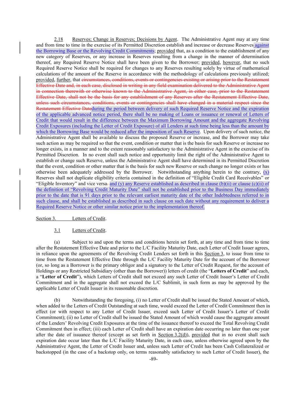 2.18 Reserves; Change in Reserves; Decisions by Agent. The Administrative Agent may at any time and from time to time in the exercise of its Permitted Discretion establish and increase or decrease Reserves against the Borrowing Base or the Revolving Credit Commitments; provided that, as a condition to the establishment of any new category of Reserves, or any increase in Reserves resulting from a change in the manner of determination thereof, any Required Reserve Notice shall have been given to the Borrower; provided, however, that no such Required Reserve Notice shall be required for changes to any Reserves resulting solely by virtue of mathematical calculations of the amount of the Reserve in accordance with the methodology of calculations previously utilized; provided, further, that circumstances, conditions, events or contingencies existing or arising prior to the Restatement Effective Date and, in each case, disclosed in writing in any field examination delivered to the Administrative Agent in connection therewith or otherwise known to the Administrative Agent, in either case, prior to the Restatement Effective Date, shall not be the basis for any establishment of any Reserves after the Restatement Effective Date, unless such circumstances, conditions, events or contingencies shall have changed in a material respect since the Restatement Effective Dateduring the period between delivery of such Required Reserve Notice and the expiration of the applicable advanced notice period, there shall be no making of Loans or issuance or renewal of Letters of Credit that would result in the difference between the Maximum Borrowing Amount and the aggregate Revolving Credit Exposures (including the Letter of Credit Exposure) of all Lenders at such time being less than the amount by which the Borrowing Base would be reduced after the imposition of such Reserve. Upon delivery of such notice, the Administrative Agent shall be available to discuss the proposed Reserve or increase, and the Borrower may take such action as may be required so that the event, condition or matter that is the basis for such Reserve or increase no longer exists, in a manner and to the extent reasonably satisfactory to the Administrative Agent in the exercise of its Permitted Discretion. In no event shall such notice and opportunity limit the right of the Administrative Agent to establish or change such Reserve, unless the Administrative Agent shall have determined in its Permitted Discretion that the event, condition or other matter that is the basis for such new Reserve or such change no longer exists or has otherwise been adequately addressed by the Borrower. Notwithstanding anything herein to the contrary, (x) Reserves shall not duplicate eligibility criteria contained in the definition of “Eligible Credit Card Receivables” or “Eligible Inventory” and vice versa. and (y) any Reserve established as described in clause (b)(ii) or clause (c)(ii) of the definition of “Revolving Credit Maturity Date” shall not be established prior to the Business Day immediately prior to the date that is 91 days prior to the relevant earliest maturity date of the other Indebtedness referred to in such clause, and shall be established as described in such clause on such date without any requirement to deliver a Required Reserve Notice or other similar notice prior to the implementation thereof. Section 3. Letters of Credit. 3.1 Letters of Credit. (a) Subject to and upon the terms and conditions herein set forth, at any time and from time to time after the Restatement Effective Date and prior to the L/C Facility Maturity Date, each Letter of Credit Issuer agrees, in reliance upon the agreements of the Revolving Credit Lenders set forth in this Section 3, to issue from time to time from the Restatement Effective Date through the L/C Facility Maturity Date for the account of the Borrower (or, so long as a Borrower is the primary obligor and a signatory to the Letter of Credit Request, for the account of Holdings or any Restricted Subsidiary (other than the Borrower)) letters of credit (the “Letters of Credit” and each, a “Letter of Credit”), which Letters of Credit shall not exceed any such Letter of Credit Issuer’s Letter of Credit Commitment and in the aggregate shall not exceed the L/C Sublimit, in such form as may be approved by the applicable Letter of Credit Issuer in its reasonable discretion. (b) Notwithstanding the foregoing, (i) no Letter of Credit shall be issued the Stated Amount of which, when added to the Letters of Credit Outstanding at such time, would exceed the Letter of Credit Commitment then in effect (or with respect to any Letter of Credit Issuer, exceed such Letter of Credit Issuer’s Letter of Credit Commitment); (ii) no Letter of Credit shall be issued the Stated Amount of which would cause the aggregate amount of the Lenders’ Revolving Credit Exposures at the time of the issuance thereof to exceed the Total Revolving Credit Commitment then in effect; (iii) each Letter of Credit shall have an expiration date occurring no later than one year after the date of issuance thereof (except as set forth in Section 3.2(d)), provided that in no event shall such expiration date occur later than the L/C Facility Maturity Date, in each case, unless otherwise agreed upon by the Administrative Agent, the Letter of Credit Issuer and, unless such Letter of Credit has been Cash Collateralized or backstopped (in the case of a backstop only, on terms reasonably satisfactory to such Letter of Credit Issuer), the -89-