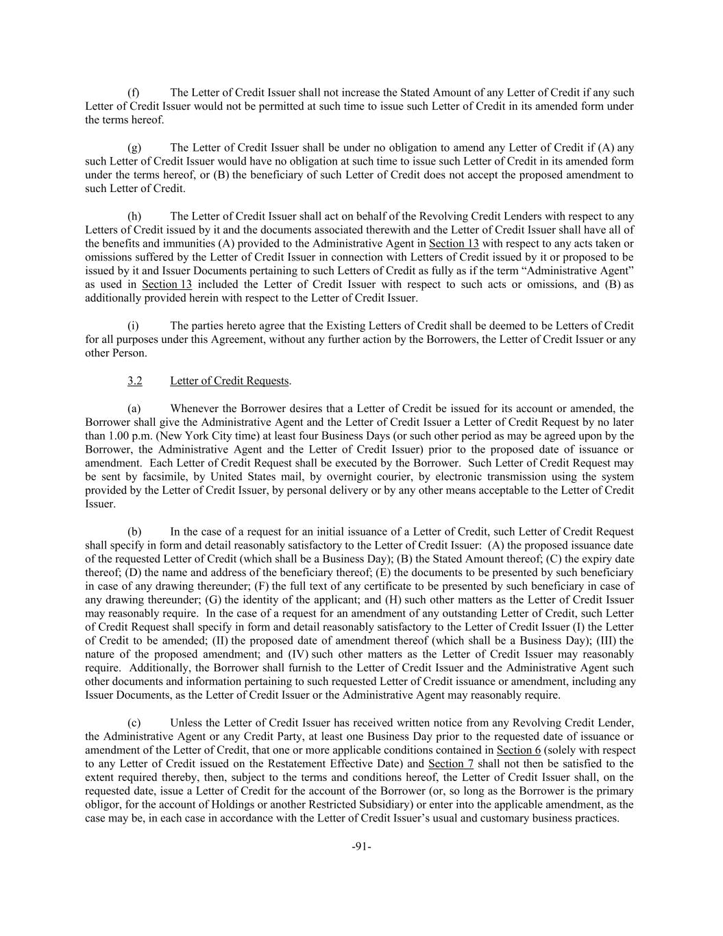(f) The Letter of Credit Issuer shall not increase the Stated Amount of any Letter of Credit if any such Letter of Credit Issuer would not be permitted at such time to issue such Letter of Credit in its amended form under the terms hereof. (g) The Letter of Credit Issuer shall be under no obligation to amend any Letter of Credit if (A) any such Letter of Credit Issuer would have no obligation at such time to issue such Letter of Credit in its amended form under the terms hereof, or (B) the beneficiary of such Letter of Credit does not accept the proposed amendment to such Letter of Credit. (h) The Letter of Credit Issuer shall act on behalf of the Revolving Credit Lenders with respect to any Letters of Credit issued by it and the documents associated therewith and the Letter of Credit Issuer shall have all of the benefits and immunities (A) provided to the Administrative Agent in Section 13 with respect to any acts taken or omissions suffered by the Letter of Credit Issuer in connection with Letters of Credit issued by it or proposed to be issued by it and Issuer Documents pertaining to such Letters of Credit as fully as if the term “Administrative Agent” as used in Section 13 included the Letter of Credit Issuer with respect to such acts or omissions, and (B) as additionally provided herein with respect to the Letter of Credit Issuer. (i) The parties hereto agree that the Existing Letters of Credit shall be deemed to be Letters of Credit for all purposes under this Agreement, without any further action by the Borrowers, the Letter of Credit Issuer or any other Person. 3.2 Letter of Credit Requests. (a) Whenever the Borrower desires that a Letter of Credit be issued for its account or amended, the Borrower shall give the Administrative Agent and the Letter of Credit Issuer a Letter of Credit Request by no later than 1.00 p.m. (New York City time) at least four Business Days (or such other period as may be agreed upon by the Borrower, the Administrative Agent and the Letter of Credit Issuer) prior to the proposed date of issuance or amendment. Each Letter of Credit Request shall be executed by the Borrower. Such Letter of Credit Request may be sent by facsimile, by United States mail, by overnight courier, by electronic transmission using the system provided by the Letter of Credit Issuer, by personal delivery or by any other means acceptable to the Letter of Credit Issuer. (b) In the case of a request for an initial issuance of a Letter of Credit, such Letter of Credit Request shall specify in form and detail reasonably satisfactory to the Letter of Credit Issuer: (A) the proposed issuance date of the requested Letter of Credit (which shall be a Business Day); (B) the Stated Amount thereof; (C) the expiry date thereof; (D) the name and address of the beneficiary thereof; (E) the documents to be presented by such beneficiary in case of any drawing thereunder; (F) the full text of any certificate to be presented by such beneficiary in case of any drawing thereunder; (G) the identity of the applicant; and (H) such other matters as the Letter of Credit Issuer may reasonably require. In the case of a request for an amendment of any outstanding Letter of Credit, such Letter of Credit Request shall specify in form and detail reasonably satisfactory to the Letter of Credit Issuer (I) the Letter of Credit to be amended; (II) the proposed date of amendment thereof (which shall be a Business Day); (III) the nature of the proposed amendment; and (IV) such other matters as the Letter of Credit Issuer may reasonably require. Additionally, the Borrower shall furnish to the Letter of Credit Issuer and the Administrative Agent such other documents and information pertaining to such requested Letter of Credit issuance or amendment, including any Issuer Documents, as the Letter of Credit Issuer or the Administrative Agent may reasonably require. (c) Unless the Letter of Credit Issuer has received written notice from any Revolving Credit Lender, the Administrative Agent or any Credit Party, at least one Business Day prior to the requested date of issuance or amendment of the Letter of Credit, that one or more applicable conditions contained in Section 6 (solely with respect to any Letter of Credit issued on the Restatement Effective Date) and Section 7 shall not then be satisfied to the extent required thereby, then, subject to the terms and conditions hereof, the Letter of Credit Issuer shall, on the requested date, issue a Letter of Credit for the account of the Borrower (or, so long as the Borrower is the primary obligor, for the account of Holdings or another Restricted Subsidiary) or enter into the applicable amendment, as the case may be, in each case in accordance with the Letter of Credit Issuer’s usual and customary business practices. -91-
