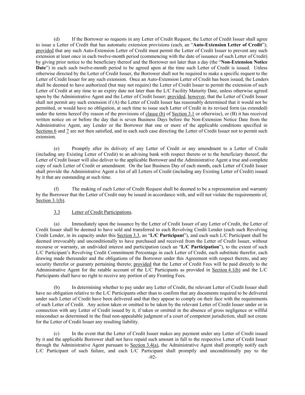 (d) If the Borrower so requests in any Letter of Credit Request, the Letter of Credit Issuer shall agree to issue a Letter of Credit that has automatic extension provisions (each, an “Auto-Extension Letter of Credit”); provided that any such Auto-Extension Letter of Credit must permit the Letter of Credit Issuer to prevent any such extension at least once in each twelve-month period (commencing with the date of issuance of such Letter of Credit) by giving prior notice to the beneficiary thereof and the Borrower not later than a day (the “Non-Extension Notice Date”) in each such twelve-month period to be agreed upon at the time such Letter of Credit is issued. Unless otherwise directed by the Letter of Credit Issuer, the Borrower shall not be required to make a specific request to the Letter of Credit Issuer for any such extension. Once an Auto-Extension Letter of Credit has been issued, the Lenders shall be deemed to have authorized (but may not require) the Letter of Credit Issuer to permit the extension of such Letter of Credit at any time to an expiry date not later than the L/C Facility Maturity Date, unless otherwise agreed upon by the Administrative Agent and the Letter of Credit Issuer; provided, however, that the Letter of Credit Issuer shall not permit any such extension if (A) the Letter of Credit Issuer has reasonably determined that it would not be permitted, or would have no obligation, at such time to issue such Letter of Credit in its revised form (as extended) under the terms hereof (by reason of the provisions of clause (b) of Section 3.1 or otherwise), or (B) it has received written notice on or before the day that is seven Business Days before the Non-Extension Notice Date from the Administrative Agent, any Lender or the Borrower that one or more of the applicable conditions specified in Sections 6 and 7 are not then satisfied, and in each such case directing the Letter of Credit Issuer not to permit such extension. (e) Promptly after its delivery of any Letter of Credit or any amendment to a Letter of Credit (including any Existing Letter of Credit) to an advising bank with respect thereto or to the beneficiary thereof, the Letter of Credit Issuer will also deliver to the applicable Borrower and the Administrative Agent a true and complete copy of such Letter of Credit or amendment. On the last Business Day of each month, each Letter of Credit Issuer shall provide the Administrative Agent a list of all Letters of Credit (including any Existing Letter of Credit) issued by it that are outstanding at such time. (f) The making of each Letter of Credit Request shall be deemed to be a representation and warranty by the Borrower that the Letter of Credit may be issued in accordance with, and will not violate the requirements of, Section 3.1(b). 3.3 Letter of Credit Participations. (a) Immediately upon the issuance by the Letter of Credit Issuer of any Letter of Credit, the Letter of Credit Issuer shall be deemed to have sold and transferred to each Revolving Credit Lender (each such Revolving Credit Lender, in its capacity under this Section 3.3, an “L/C Participant”), and each such L/C Participant shall be deemed irrevocably and unconditionally to have purchased and received from the Letter of Credit Issuer, without recourse or warranty, an undivided interest and participation (each an “L/C Participation”), to the extent of such L/C Participant’s Revolving Credit Commitment Percentage in each Letter of Credit, each substitute therefor, each drawing made thereunder and the obligations of the Borrower under this Agreement with respect thereto, and any security therefor or guaranty pertaining thereto; provided that the Letter of Credit Fees will be paid directly to the Administrative Agent for the ratable account of the L/C Participants as provided in Section 4.1(b) and the L/C Participants shall have no right to receive any portion of any Fronting Fees. (b) In determining whether to pay under any Letter of Credit, the relevant Letter of Credit Issuer shall have no obligation relative to the L/C Participants other than to confirm that any documents required to be delivered under such Letter of Credit have been delivered and that they appear to comply on their face with the requirements of such Letter of Credit. Any action taken or omitted to be taken by the relevant Letter of Credit Issuer under or in connection with any Letter of Credit issued by it, if taken or omitted in the absence of gross negligence or willful misconduct as determined in the final non-appealable judgment of a court of competent jurisdiction, shall not create for the Letter of Credit Issuer any resulting liability. (c) In the event that the Letter of Credit Issuer makes any payment under any Letter of Credit issued by it and the applicable Borrower shall not have repaid such amount in full to the respective Letter of Credit Issuer through the Administrative Agent pursuant to Section 3.4(a), the Administrative Agent shall promptly notify each L/C Participant of such failure, and each L/C Participant shall promptly and unconditionally pay to the -92-