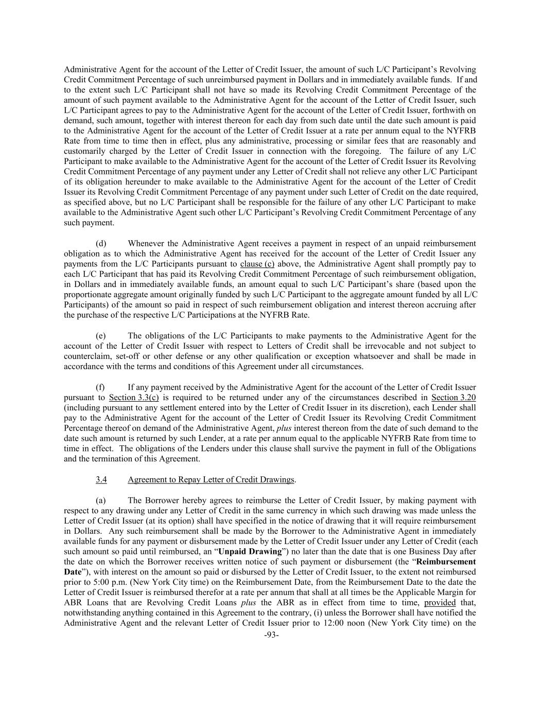 Administrative Agent for the account of the Letter of Credit Issuer, the amount of such L/C Participant’s Revolving Credit Commitment Percentage of such unreimbursed payment in Dollars and in immediately available funds. If and to the extent such L/C Participant shall not have so made its Revolving Credit Commitment Percentage of the amount of such payment available to the Administrative Agent for the account of the Letter of Credit Issuer, such L/C Participant agrees to pay to the Administrative Agent for the account of the Letter of Credit Issuer, forthwith on demand, such amount, together with interest thereon for each day from such date until the date such amount is paid to the Administrative Agent for the account of the Letter of Credit Issuer at a rate per annum equal to the NYFRB Rate from time to time then in effect, plus any administrative, processing or similar fees that are reasonably and customarily charged by the Letter of Credit Issuer in connection with the foregoing. The failure of any L/C Participant to make available to the Administrative Agent for the account of the Letter of Credit Issuer its Revolving Credit Commitment Percentage of any payment under any Letter of Credit shall not relieve any other L/C Participant of its obligation hereunder to make available to the Administrative Agent for the account of the Letter of Credit Issuer its Revolving Credit Commitment Percentage of any payment under such Letter of Credit on the date required, as specified above, but no L/C Participant shall be responsible for the failure of any other L/C Participant to make available to the Administrative Agent such other L/C Participant’s Revolving Credit Commitment Percentage of any such payment. (d) Whenever the Administrative Agent receives a payment in respect of an unpaid reimbursement obligation as to which the Administrative Agent has received for the account of the Letter of Credit Issuer any payments from the L/C Participants pursuant to clause (c) above, the Administrative Agent shall promptly pay to each L/C Participant that has paid its Revolving Credit Commitment Percentage of such reimbursement obligation, in Dollars and in immediately available funds, an amount equal to such L/C Participant’s share (based upon the proportionate aggregate amount originally funded by such L/C Participant to the aggregate amount funded by all L/C Participants) of the amount so paid in respect of such reimbursement obligation and interest thereon accruing after the purchase of the respective L/C Participations at the NYFRB Rate. (e) The obligations of the L/C Participants to make payments to the Administrative Agent for the account of the Letter of Credit Issuer with respect to Letters of Credit shall be irrevocable and not subject to counterclaim, set-off or other defense or any other qualification or exception whatsoever and shall be made in accordance with the terms and conditions of this Agreement under all circumstances. (f) If any payment received by the Administrative Agent for the account of the Letter of Credit Issuer pursuant to Section 3.3(c) is required to be returned under any of the circumstances described in Section 3.20 (including pursuant to any settlement entered into by the Letter of Credit Issuer in its discretion), each Lender shall pay to the Administrative Agent for the account of the Letter of Credit Issuer its Revolving Credit Commitment Percentage thereof on demand of the Administrative Agent, plus interest thereon from the date of such demand to the date such amount is returned by such Lender, at a rate per annum equal to the applicable NYFRB Rate from time to time in effect. The obligations of the Lenders under this clause shall survive the payment in full of the Obligations and the termination of this Agreement. 3.4 Agreement to Repay Letter of Credit Drawings. (a) The Borrower hereby agrees to reimburse the Letter of Credit Issuer, by making payment with respect to any drawing under any Letter of Credit in the same currency in which such drawing was made unless the Letter of Credit Issuer (at its option) shall have specified in the notice of drawing that it will require reimbursement in Dollars. Any such reimbursement shall be made by the Borrower to the Administrative Agent in immediately available funds for any payment or disbursement made by the Letter of Credit Issuer under any Letter of Credit (each such amount so paid until reimbursed, an “Unpaid Drawing”) no later than the date that is one Business Day after the date on which the Borrower receives written notice of such payment or disbursement (the “Reimbursement Date”), with interest on the amount so paid or disbursed by the Letter of Credit Issuer, to the extent not reimbursed prior to 5:00 p.m. (New York City time) on the Reimbursement Date, from the Reimbursement Date to the date the Letter of Credit Issuer is reimbursed therefor at a rate per annum that shall at all times be the Applicable Margin for ABR Loans that are Revolving Credit Loans plus the ABR as in effect from time to time, provided that, notwithstanding anything contained in this Agreement to the contrary, (i) unless the Borrower shall have notified the Administrative Agent and the relevant Letter of Credit Issuer prior to 12:00 noon (New York City time) on the -93-