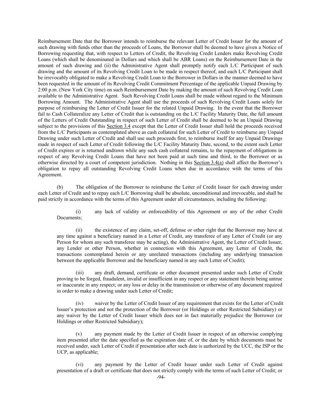Reimbursement Date that the Borrower intends to reimburse the relevant Letter of Credit Issuer for the amount of such drawing with funds other than the proceeds of Loans, the Borrower shall be deemed to have given a Notice of Borrowing requesting that, with respect to Letters of Credit, the Revolving Credit Lenders make Revolving Credit Loans (which shall be denominated in Dollars and which shall be ABR Loans) on the Reimbursement Date in the amount of such drawing and (ii) the Administrative Agent shall promptly notify each L/C Participant of such drawing and the amount of its Revolving Credit Loan to be made in respect thereof, and each L/C Participant shall be irrevocably obligated to make a Revolving Credit Loan to the Borrower in Dollars in the manner deemed to have been requested in the amount of its Revolving Credit Commitment Percentage of the applicable Unpaid Drawing by 2:00 p.m. (New York City time) on such Reimbursement Date by making the amount of such Revolving Credit Loan available to the Administrative Agent. Such Revolving Credit Loans shall be made without regard to the Minimum Borrowing Amount. The Administrative Agent shall use the proceeds of such Revolving Credit Loans solely for purpose of reimbursing the Letter of Credit Issuer for the related Unpaid Drawing. In the event that the Borrower fail to Cash Collateralize any Letter of Credit that is outstanding on the L/C Facility Maturity Date, the full amount of the Letters of Credit Outstanding in respect of such Letter of Credit shall be deemed to be an Unpaid Drawing subject to the provisions of this Section 3.4 except that the Letter of Credit Issuer shall hold the proceeds received from the L/C Participants as contemplated above as cash collateral for such Letter of Credit to reimburse any Unpaid Drawing under such Letter of Credit and shall use such proceeds first, to reimburse itself for any Unpaid Drawings made in respect of such Letter of Credit following the L/C Facility Maturity Date, second, to the extent such Letter of Credit expires or is returned undrawn while any such cash collateral remains, to the repayment of obligations in respect of any Revolving Credit Loans that have not been paid at such time and third, to the Borrower or as otherwise directed by a court of competent jurisdiction. Nothing in this Section 3.4(a) shall affect the Borrower’s obligation to repay all outstanding Revolving Credit Loans when due in accordance with the terms of this Agreement. (b) The obligation of the Borrower to reimburse the Letter of Credit Issuer for each drawing under each Letter of Credit and to repay each L/C Borrowing shall be absolute, unconditional and irrevocable, and shall be paid strictly in accordance with the terms of this Agreement under all circumstances, including the following: (i) any lack of validity or enforceability of this Agreement or any of the other Credit Documents; (ii) the existence of any claim, set-off, defense or other right that the Borrower may have at any time against a beneficiary named in a Letter of Credit, any transferee of any Letter of Credit (or any Person for whom any such transferee may be acting), the Administrative Agent, the Letter of Credit Issuer, any Lender or other Person, whether in connection with this Agreement, any Letter of Credit, the transactions contemplated herein or any unrelated transactions (including any underlying transaction between the applicable Borrower and the beneficiary named in any such Letter of Credit); (iii) any draft, demand, certificate or other document presented under such Letter of Credit proving to be forged, fraudulent, invalid or insufficient in any respect or any statement therein being untrue or inaccurate in any respect; or any loss or delay in the transmission or otherwise of any document required in order to make a drawing under such Letter of Credit; (iv) waiver by the Letter of Credit Issuer of any requirement that exists for the Letter of Credit Issuer’s protection and not the protection of the Borrower (or Holdings or other Restricted Subsidiary) or any waiver by the Letter of Credit Issuer which does not in fact materially prejudice the Borrower (or Holdings or other Restricted Subsidiary); (v) any payment made by the Letter of Credit Issuer in respect of an otherwise complying item presented after the date specified as the expiration date of, or the date by which documents must be received under, such Letter of Credit if presentation after such date is authorized by the UCC, the ISP or the UCP, as applicable; (vi) any payment by the Letter of Credit Issuer under such Letter of Credit against presentation of a draft or certificate that does not strictly comply with the terms of such Letter of Credit; or -94-