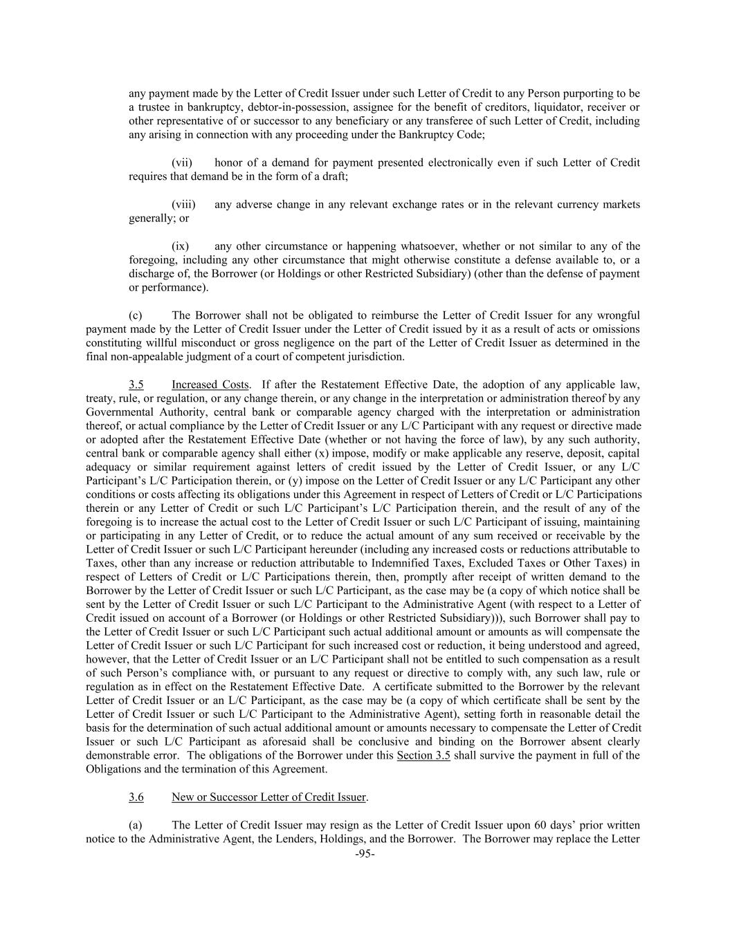 any payment made by the Letter of Credit Issuer under such Letter of Credit to any Person purporting to be a trustee in bankruptcy, debtor-in-possession, assignee for the benefit of creditors, liquidator, receiver or other representative of or successor to any beneficiary or any transferee of such Letter of Credit, including any arising in connection with any proceeding under the Bankruptcy Code; (vii) honor of a demand for payment presented electronically even if such Letter of Credit requires that demand be in the form of a draft; (viii) any adverse change in any relevant exchange rates or in the relevant currency markets generally; or (ix) any other circumstance or happening whatsoever, whether or not similar to any of the foregoing, including any other circumstance that might otherwise constitute a defense available to, or a discharge of, the Borrower (or Holdings or other Restricted Subsidiary) (other than the defense of payment or performance). (c) The Borrower shall not be obligated to reimburse the Letter of Credit Issuer for any wrongful payment made by the Letter of Credit Issuer under the Letter of Credit issued by it as a result of acts or omissions constituting willful misconduct or gross negligence on the part of the Letter of Credit Issuer as determined in the final non-appealable judgment of a court of competent jurisdiction. 3.5 Increased Costs. If after the Restatement Effective Date, the adoption of any applicable law, treaty, rule, or regulation, or any change therein, or any change in the interpretation or administration thereof by any Governmental Authority, central bank or comparable agency charged with the interpretation or administration thereof, or actual compliance by the Letter of Credit Issuer or any L/C Participant with any request or directive made or adopted after the Restatement Effective Date (whether or not having the force of law), by any such authority, central bank or comparable agency shall either (x) impose, modify or make applicable any reserve, deposit, capital adequacy or similar requirement against letters of credit issued by the Letter of Credit Issuer, or any L/C Participant’s L/C Participation therein, or (y) impose on the Letter of Credit Issuer or any L/C Participant any other conditions or costs affecting its obligations under this Agreement in respect of Letters of Credit or L/C Participations therein or any Letter of Credit or such L/C Participant’s L/C Participation therein, and the result of any of the foregoing is to increase the actual cost to the Letter of Credit Issuer or such L/C Participant of issuing, maintaining or participating in any Letter of Credit, or to reduce the actual amount of any sum received or receivable by the Letter of Credit Issuer or such L/C Participant hereunder (including any increased costs or reductions attributable to Taxes, other than any increase or reduction attributable to Indemnified Taxes, Excluded Taxes or Other Taxes) in respect of Letters of Credit or L/C Participations therein, then, promptly after receipt of written demand to the Borrower by the Letter of Credit Issuer or such L/C Participant, as the case may be (a copy of which notice shall be sent by the Letter of Credit Issuer or such L/C Participant to the Administrative Agent (with respect to a Letter of Credit issued on account of a Borrower (or Holdings or other Restricted Subsidiary))), such Borrower shall pay to the Letter of Credit Issuer or such L/C Participant such actual additional amount or amounts as will compensate the Letter of Credit Issuer or such L/C Participant for such increased cost or reduction, it being understood and agreed, however, that the Letter of Credit Issuer or an L/C Participant shall not be entitled to such compensation as a result of such Person’s compliance with, or pursuant to any request or directive to comply with, any such law, rule or regulation as in effect on the Restatement Effective Date. A certificate submitted to the Borrower by the relevant Letter of Credit Issuer or an L/C Participant, as the case may be (a copy of which certificate shall be sent by the Letter of Credit Issuer or such L/C Participant to the Administrative Agent), setting forth in reasonable detail the basis for the determination of such actual additional amount or amounts necessary to compensate the Letter of Credit Issuer or such L/C Participant as aforesaid shall be conclusive and binding on the Borrower absent clearly demonstrable error. The obligations of the Borrower under this Section 3.5 shall survive the payment in full of the Obligations and the termination of this Agreement. 3.6 New or Successor Letter of Credit Issuer. (a) The Letter of Credit Issuer may resign as the Letter of Credit Issuer upon 60 days’ prior written notice to the Administrative Agent, the Lenders, Holdings, and the Borrower. The Borrower may replace the Letter -95-