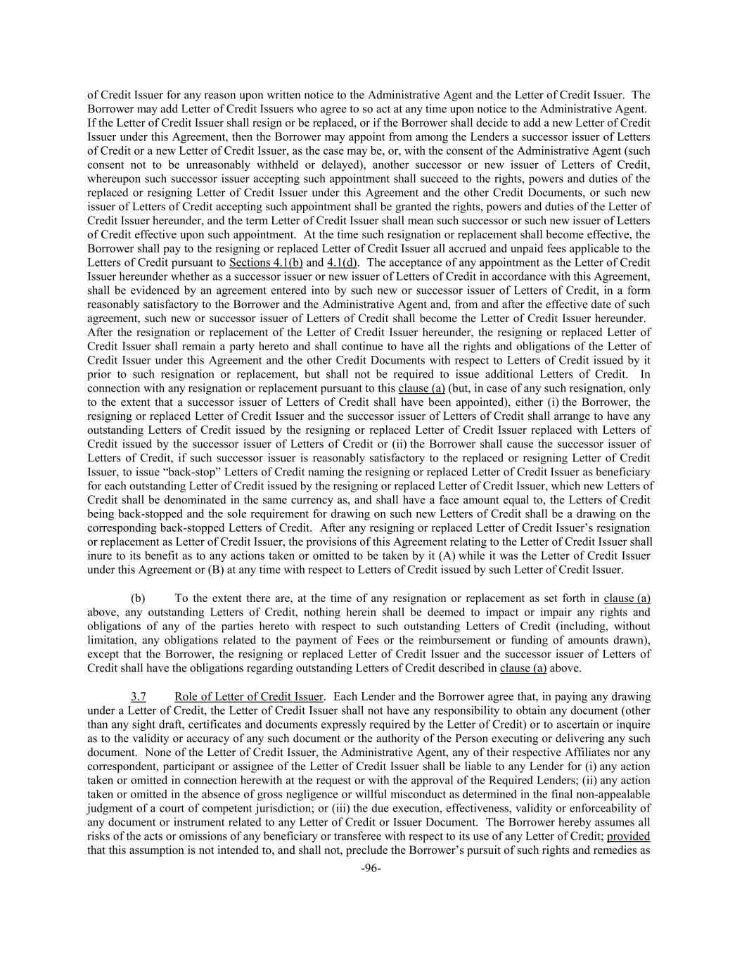 of Credit Issuer for any reason upon written notice to the Administrative Agent and the Letter of Credit Issuer. The Borrower may add Letter of Credit Issuers who agree to so act at any time upon notice to the Administrative Agent. If the Letter of Credit Issuer shall resign or be replaced, or if the Borrower shall decide to add a new Letter of Credit Issuer under this Agreement, then the Borrower may appoint from among the Lenders a successor issuer of Letters of Credit or a new Letter of Credit Issuer, as the case may be, or, with the consent of the Administrative Agent (such consent not to be unreasonably withheld or delayed), another successor or new issuer of Letters of Credit, whereupon such successor issuer accepting such appointment shall succeed to the rights, powers and duties of the replaced or resigning Letter of Credit Issuer under this Agreement and the other Credit Documents, or such new issuer of Letters of Credit accepting such appointment shall be granted the rights, powers and duties of the Letter of Credit Issuer hereunder, and the term Letter of Credit Issuer shall mean such successor or such new issuer of Letters of Credit effective upon such appointment. At the time such resignation or replacement shall become effective, the Borrower shall pay to the resigning or replaced Letter of Credit Issuer all accrued and unpaid fees applicable to the Letters of Credit pursuant to Sections 4.1(b) and 4.1(d). The acceptance of any appointment as the Letter of Credit Issuer hereunder whether as a successor issuer or new issuer of Letters of Credit in accordance with this Agreement, shall be evidenced by an agreement entered into by such new or successor issuer of Letters of Credit, in a form reasonably satisfactory to the Borrower and the Administrative Agent and, from and after the effective date of such agreement, such new or successor issuer of Letters of Credit shall become the Letter of Credit Issuer hereunder. After the resignation or replacement of the Letter of Credit Issuer hereunder, the resigning or replaced Letter of Credit Issuer shall remain a party hereto and shall continue to have all the rights and obligations of the Letter of Credit Issuer under this Agreement and the other Credit Documents with respect to Letters of Credit issued by it prior to such resignation or replacement, but shall not be required to issue additional Letters of Credit. In connection with any resignation or replacement pursuant to this clause (a) (but, in case of any such resignation, only to the extent that a successor issuer of Letters of Credit shall have been appointed), either (i) the Borrower, the resigning or replaced Letter of Credit Issuer and the successor issuer of Letters of Credit shall arrange to have any outstanding Letters of Credit issued by the resigning or replaced Letter of Credit Issuer replaced with Letters of Credit issued by the successor issuer of Letters of Credit or (ii) the Borrower shall cause the successor issuer of Letters of Credit, if such successor issuer is reasonably satisfactory to the replaced or resigning Letter of Credit Issuer, to issue “back-stop” Letters of Credit naming the resigning or replaced Letter of Credit Issuer as beneficiary for each outstanding Letter of Credit issued by the resigning or replaced Letter of Credit Issuer, which new Letters of Credit shall be denominated in the same currency as, and shall have a face amount equal to, the Letters of Credit being back-stopped and the sole requirement for drawing on such new Letters of Credit shall be a drawing on the corresponding back-stopped Letters of Credit. After any resigning or replaced Letter of Credit Issuer’s resignation or replacement as Letter of Credit Issuer, the provisions of this Agreement relating to the Letter of Credit Issuer shall inure to its benefit as to any actions taken or omitted to be taken by it (A) while it was the Letter of Credit Issuer under this Agreement or (B) at any time with respect to Letters of Credit issued by such Letter of Credit Issuer. (b) To the extent there are, at the time of any resignation or replacement as set forth in clause (a) above, any outstanding Letters of Credit, nothing herein shall be deemed to impact or impair any rights and obligations of any of the parties hereto with respect to such outstanding Letters of Credit (including, without limitation, any obligations related to the payment of Fees or the reimbursement or funding of amounts drawn), except that the Borrower, the resigning or replaced Letter of Credit Issuer and the successor issuer of Letters of Credit shall have the obligations regarding outstanding Letters of Credit described in clause (a) above. 3.7 Role of Letter of Credit Issuer. Each Lender and the Borrower agree that, in paying any drawing under a Letter of Credit, the Letter of Credit Issuer shall not have any responsibility to obtain any document (other than any sight draft, certificates and documents expressly required by the Letter of Credit) or to ascertain or inquire as to the validity or accuracy of any such document or the authority of the Person executing or delivering any such document. None of the Letter of Credit Issuer, the Administrative Agent, any of their respective Affiliates nor any correspondent, participant or assignee of the Letter of Credit Issuer shall be liable to any Lender for (i) any action taken or omitted in connection herewith at the request or with the approval of the Required Lenders; (ii) any action taken or omitted in the absence of gross negligence or willful misconduct as determined in the final non-appealable judgment of a court of competent jurisdiction; or (iii) the due execution, effectiveness, validity or enforceability of any document or instrument related to any Letter of Credit or Issuer Document. The Borrower hereby assumes all risks of the acts or omissions of any beneficiary or transferee with respect to its use of any Letter of Credit; provided that this assum
