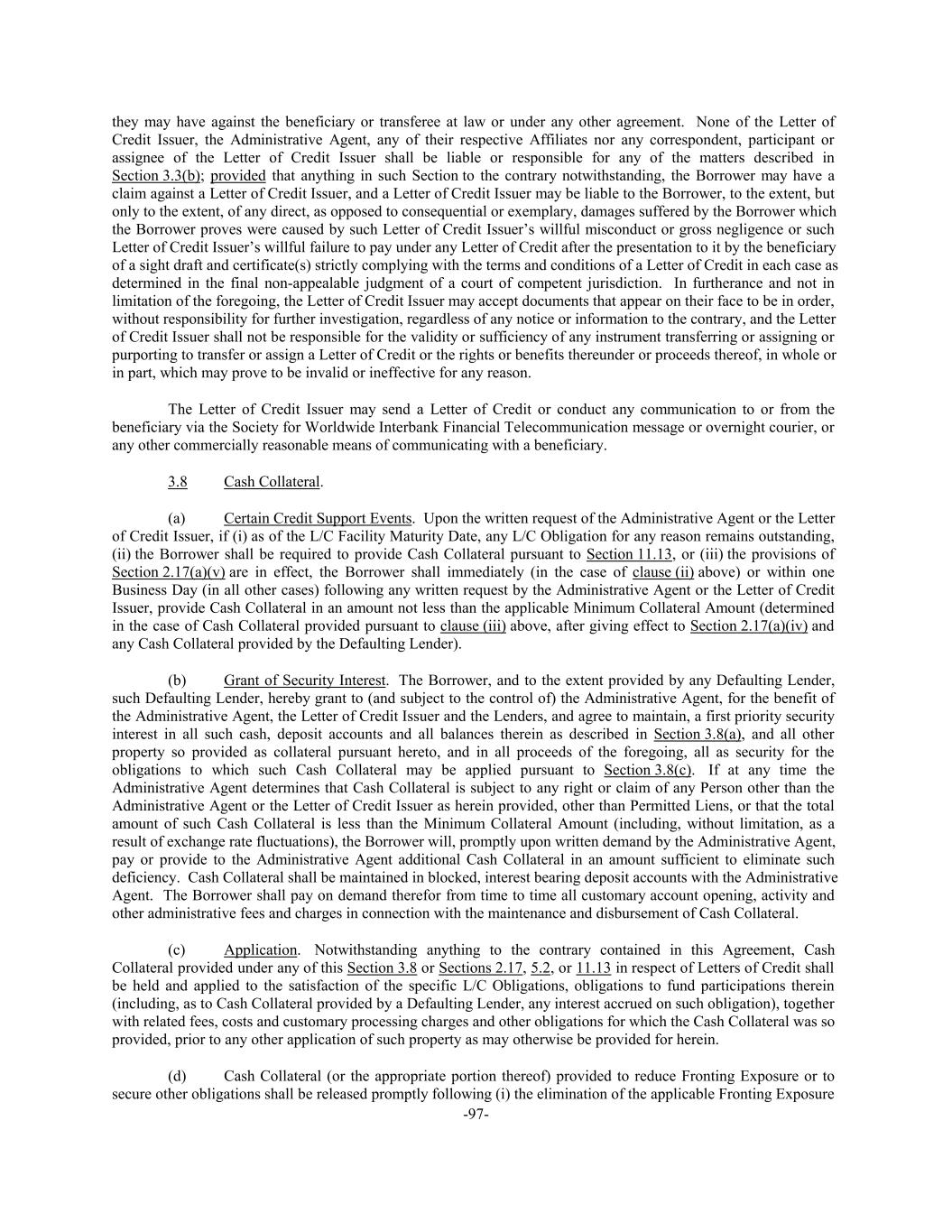 they may have against the beneficiary or transferee at law or under any other agreement. None of the Letter of Credit Issuer, the Administrative Agent, any of their respective Affiliates nor any correspondent, participant or assignee of the Letter of Credit Issuer shall be liable or responsible for any of the matters described in Section 3.3(b); provided that anything in such Section to the contrary notwithstanding, the Borrower may have a claim against a Letter of Credit Issuer, and a Letter of Credit Issuer may be liable to the Borrower, to the extent, but only to the extent, of any direct, as opposed to consequential or exemplary, damages suffered by the Borrower which the Borrower proves were caused by such Letter of Credit Issuer’s willful misconduct or gross negligence or such Letter of Credit Issuer’s willful failure to pay under any Letter of Credit after the presentation to it by the beneficiary of a sight draft and certificate(s) strictly complying with the terms and conditions of a Letter of Credit in each case as determined in the final non-appealable judgment of a court of competent jurisdiction. In furtherance and not in limitation of the foregoing, the Letter of Credit Issuer may accept documents that appear on their face to be in order, without responsibility for further investigation, regardless of any notice or information to the contrary, and the Letter of Credit Issuer shall not be responsible for the validity or sufficiency of any instrument transferring or assigning or purporting to transfer or assign a Letter of Credit or the rights or benefits thereunder or proceeds thereof, in whole or in part, which may prove to be invalid or ineffective for any reason. The Letter of Credit Issuer may send a Letter of Credit or conduct any communication to or from the beneficiary via the Society for Worldwide Interbank Financial Telecommunication message or overnight courier, or any other commercially reasonable means of communicating with a beneficiary. 3.8 Cash Collateral. (a) Certain Credit Support Events. Upon the written request of the Administrative Agent or the Letter of Credit Issuer, if (i) as of the L/C Facility Maturity Date, any L/C Obligation for any reason remains outstanding, (ii) the Borrower shall be required to provide Cash Collateral pursuant to Section 11.13, or (iii) the provisions of Section 2.17(a)(v) are in effect, the Borrower shall immediately (in the case of clause (ii) above) or within one Business Day (in all other cases) following any written request by the Administrative Agent or the Letter of Credit Issuer, provide Cash Collateral in an amount not less than the applicable Minimum Collateral Amount (determined in the case of Cash Collateral provided pursuant to clause (iii) above, after giving effect to Section 2.17(a)(iv) and any Cash Collateral provided by the Defaulting Lender). (b) Grant of Security Interest. The Borrower, and to the extent provided by any Defaulting Lender, such Defaulting Lender, hereby grant to (and subject to the control of) the Administrative Agent, for the benefit of the Administrative Agent, the Letter of Credit Issuer and the Lenders, and agree to maintain, a first priority security interest in all such cash, deposit accounts and all balances therein as described in Section 3.8(a), and all other property so provided as collateral pursuant hereto, and in all proceeds of the foregoing, all as security for the obligations to which such Cash Collateral may be applied pursuant to Section 3.8(c). If at any time the Administrative Agent determines that Cash Collateral is subject to any right or claim of any Person other than the Administrative Agent or the Letter of Credit Issuer as herein provided, other than Permitted Liens, or that the total amount of such Cash Collateral is less than the Minimum Collateral Amount (including, without limitation, as a result of exchange rate fluctuations), the Borrower will, promptly upon written demand by the Administrative Agent, pay or provide to the Administrative Agent additional Cash Collateral in an amount sufficient to eliminate such deficiency. Cash Collateral shall be maintained in blocked, interest bearing deposit accounts with the Administrative Agent. The Borrower shall pay on demand therefor from time to time all customary account opening, activity and other administrative fees and charges in connection with the maintenance and disbursement of Cash Collateral. (c) Application. Notwithstanding anything to the contrary contained in this Agreement, Cash Collateral provided under any of this Section 3.8 or Sections 2.17, 5.2, or 11.13 in respect of Letters of Credit shall be held and applied to the satisfaction of the specific L/C Obligations, obligations to fund participations therein (including, as to Cash Collateral provided by a Defaulting Lender, any interest accrued on such obligation), together with related fees, costs and customary processing charges and other obligations for which the Cash Collateral was so provided, prior to any other application of such property as may otherwise be provided for herein. (d) Cash Collateral (or the appropriate portion thereof) provided to reduce Fronting Exposure or to secure other obligations shall be released promptly following (i) the elimination of the applicable Fronting Exposure -97-