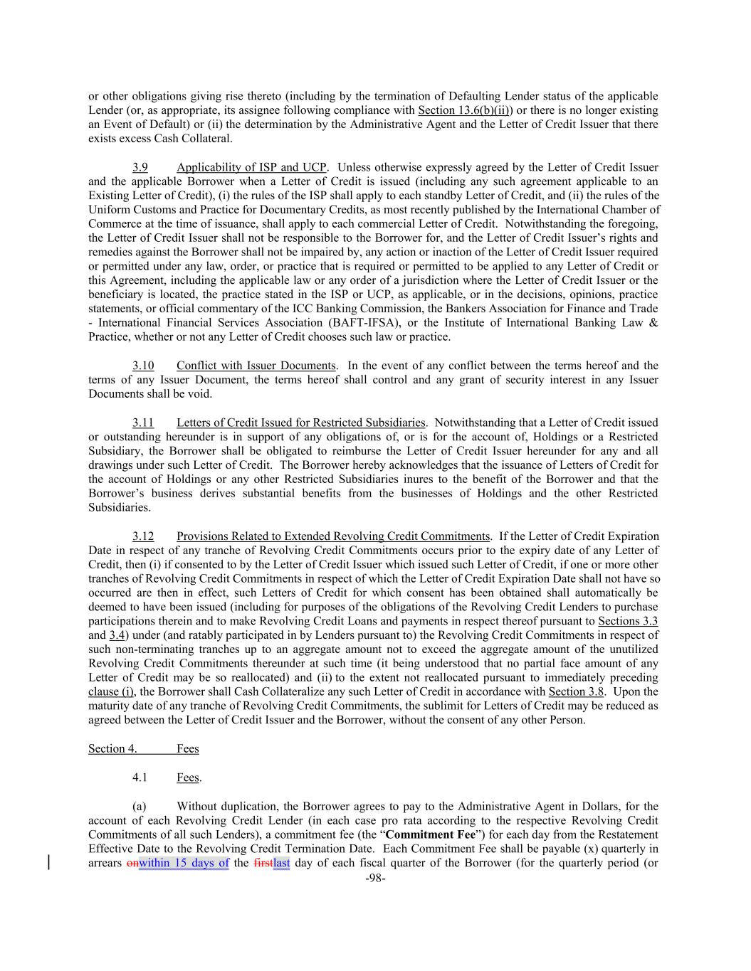 or other obligations giving rise thereto (including by the termination of Defaulting Lender status of the applicable Lender (or, as appropriate, its assignee following compliance with Section 13.6(b)(ii)) or there is no longer existing an Event of Default) or (ii) the determination by the Administrative Agent and the Letter of Credit Issuer that there exists excess Cash Collateral. 3.9 Applicability of ISP and UCP. Unless otherwise expressly agreed by the Letter of Credit Issuer and the applicable Borrower when a Letter of Credit is issued (including any such agreement applicable to an Existing Letter of Credit), (i) the rules of the ISP shall apply to each standby Letter of Credit, and (ii) the rules of the Uniform Customs and Practice for Documentary Credits, as most recently published by the International Chamber of Commerce at the time of issuance, shall apply to each commercial Letter of Credit. Notwithstanding the foregoing, the Letter of Credit Issuer shall not be responsible to the Borrower for, and the Letter of Credit Issuer’s rights and remedies against the Borrower shall not be impaired by, any action or inaction of the Letter of Credit Issuer required or permitted under any law, order, or practice that is required or permitted to be applied to any Letter of Credit or this Agreement, including the applicable law or any order of a jurisdiction where the Letter of Credit Issuer or the beneficiary is located, the practice stated in the ISP or UCP, as applicable, or in the decisions, opinions, practice statements, or official commentary of the ICC Banking Commission, the Bankers Association for Finance and Trade - International Financial Services Association (BAFT-IFSA), or the Institute of International Banking Law & Practice, whether or not any Letter of Credit chooses such law or practice. 3.10 Conflict with Issuer Documents. In the event of any conflict between the terms hereof and the terms of any Issuer Document, the terms hereof shall control and any grant of security interest in any Issuer Documents shall be void. 3.11 Letters of Credit Issued for Restricted Subsidiaries. Notwithstanding that a Letter of Credit issued or outstanding hereunder is in support of any obligations of, or is for the account of, Holdings or a Restricted Subsidiary, the Borrower shall be obligated to reimburse the Letter of Credit Issuer hereunder for any and all drawings under such Letter of Credit. The Borrower hereby acknowledges that the issuance of Letters of Credit for the account of Holdings or any other Restricted Subsidiaries inures to the benefit of the Borrower and that the Borrower’s business derives substantial benefits from the businesses of Holdings and the other Restricted Subsidiaries. 3.12 Provisions Related to Extended Revolving Credit Commitments. If the Letter of Credit Expiration Date in respect of any tranche of Revolving Credit Commitments occurs prior to the expiry date of any Letter of Credit, then (i) if consented to by the Letter of Credit Issuer which issued such Letter of Credit, if one or more other tranches of Revolving Credit Commitments in respect of which the Letter of Credit Expiration Date shall not have so occurred are then in effect, such Letters of Credit for which consent has been obtained shall automatically be deemed to have been issued (including for purposes of the obligations of the Revolving Credit Lenders to purchase participations therein and to make Revolving Credit Loans and payments in respect thereof pursuant to Sections 3.3 and 3.4) under (and ratably participated in by Lenders pursuant to) the Revolving Credit Commitments in respect of such non-terminating tranches up to an aggregate amount not to exceed the aggregate amount of the unutilized Revolving Credit Commitments thereunder at such time (it being understood that no partial face amount of any Letter of Credit may be so reallocated) and (ii) to the extent not reallocated pursuant to immediately preceding clause (i), the Borrower shall Cash Collateralize any such Letter of Credit in accordance with Section 3.8. Upon the maturity date of any tranche of Revolving Credit Commitments, the sublimit for Letters of Credit may be reduced as agreed between the Letter of Credit Issuer and the Borrower, without the consent of any other Person. Section 4. Fees 4.1 Fees. (a) Without duplication, the Borrower agrees to pay to the Administrative Agent in Dollars, for the account of each Revolving Credit Lender (in each case pro rata according to the respective Revolving Credit Commitments of all such Lenders), a commitment fee (the “Commitment Fee”) for each day from the Restatement Effective Date to the Revolving Credit Termination Date. Each Commitment Fee shall be payable (x) quarterly in arrears onwithin 15 days of the firstlast day of each fiscal quarter of the Borrower (for the quarterly period (or -98-