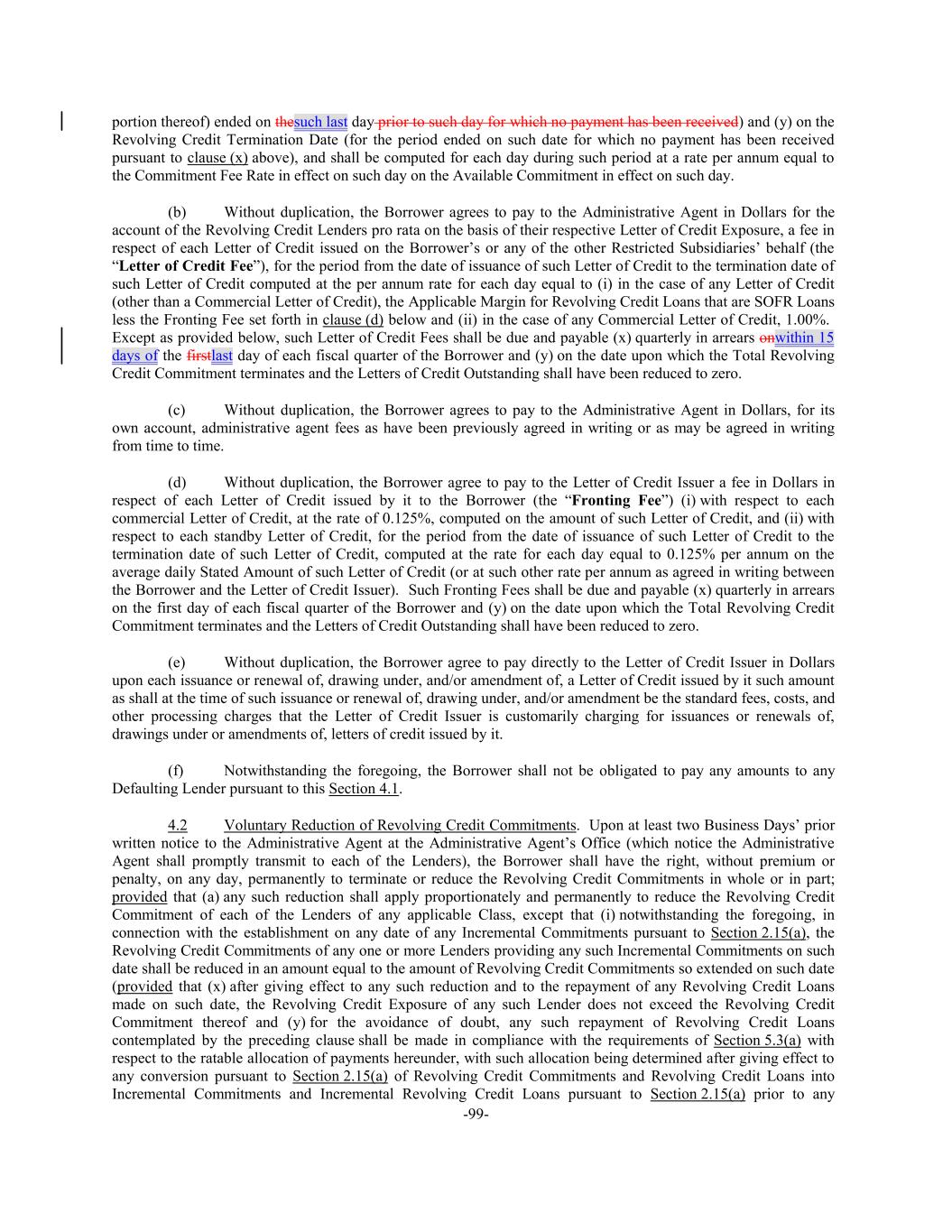 portion thereof) ended on thesuch last day prior to such day for which no payment has been received) and (y) on the Revolving Credit Termination Date (for the period ended on such date for which no payment has been received pursuant to clause (x) above), and shall be computed for each day during such period at a rate per annum equal to the Commitment Fee Rate in effect on such day on the Available Commitment in effect on such day. (b) Without duplication, the Borrower agrees to pay to the Administrative Agent in Dollars for the account of the Revolving Credit Lenders pro rata on the basis of their respective Letter of Credit Exposure, a fee in respect of each Letter of Credit issued on the Borrower’s or any of the other Restricted Subsidiaries’ behalf (the “Letter of Credit Fee”), for the period from the date of issuance of such Letter of Credit to the termination date of such Letter of Credit computed at the per annum rate for each day equal to (i) in the case of any Letter of Credit (other than a Commercial Letter of Credit), the Applicable Margin for Revolving Credit Loans that are SOFR Loans less the Fronting Fee set forth in clause (d) below and (ii) in the case of any Commercial Letter of Credit, 1.00%. Except as provided below, such Letter of Credit Fees shall be due and payable (x) quarterly in arrears onwithin 15 days of the firstlast day of each fiscal quarter of the Borrower and (y) on the date upon which the Total Revolving Credit Commitment terminates and the Letters of Credit Outstanding shall have been reduced to zero. (c) Without duplication, the Borrower agrees to pay to the Administrative Agent in Dollars, for its own account, administrative agent fees as have been previously agreed in writing or as may be agreed in writing from time to time. (d) Without duplication, the Borrower agree to pay to the Letter of Credit Issuer a fee in Dollars in respect of each Letter of Credit issued by it to the Borrower (the “Fronting Fee”) (i) with respect to each commercial Letter of Credit, at the rate of 0.125%, computed on the amount of such Letter of Credit, and (ii) with respect to each standby Letter of Credit, for the period from the date of issuance of such Letter of Credit to the termination date of such Letter of Credit, computed at the rate for each day equal to 0.125% per annum on the average daily Stated Amount of such Letter of Credit (or at such other rate per annum as agreed in writing between the Borrower and the Letter of Credit Issuer). Such Fronting Fees shall be due and payable (x) quarterly in arrears on the first day of each fiscal quarter of the Borrower and (y) on the date upon which the Total Revolving Credit Commitment terminates and the Letters of Credit Outstanding shall have been reduced to zero. (e) Without duplication, the Borrower agree to pay directly to the Letter of Credit Issuer in Dollars upon each issuance or renewal of, drawing under, and/or amendment of, a Letter of Credit issued by it such amount as shall at the time of such issuance or renewal of, drawing under, and/or amendment be the standard fees, costs, and other processing charges that the Letter of Credit Issuer is customarily charging for issuances or renewals of, drawings under or amendments of, letters of credit issued by it. (f) Notwithstanding the foregoing, the Borrower shall not be obligated to pay any amounts to any Defaulting Lender pursuant to this Section 4.1. 4.2 Voluntary Reduction of Revolving Credit Commitments. Upon at least two Business Days’ prior written notice to the Administrative Agent at the Administrative Agent’s Office (which notice the Administrative Agent shall promptly transmit to each of the Lenders), the Borrower shall have the right, without premium or penalty, on any day, permanently to terminate or reduce the Revolving Credit Commitments in whole or in part; provided that (a) any such reduction shall apply proportionately and permanently to reduce the Revolving Credit Commitment of each of the Lenders of any applicable Class, except that (i) notwithstanding the foregoing, in connection with the establishment on any date of any Incremental Commitments pursuant to Section 2.15(a), the Revolving Credit Commitments of any one or more Lenders providing any such Incremental Commitments on such date shall be reduced in an amount equal to the amount of Revolving Credit Commitments so extended on such date (provided that (x) after giving effect to any such reduction and to the repayment of any Revolving Credit Loans made on such date, the Revolving Credit Exposure of any such Lender does not exceed the Revolving Credit Commitment thereof and (y) for the avoidance of doubt, any such repayment of Revolving Credit Loans contemplated by the preceding clause shall be made in compliance with the requirements of Section 5.3(a) with respect to the ratable allocation of payments hereunder, with such allocation being determined after giving effect to any conversion pursuant to Section 2.15(a) of Revolving Credit Commitments and Revolving Credit Loans into Incremental Commitments and Incremental Revolving Credit Loans pursuant to Section 2.15(a) prior to any -99-
