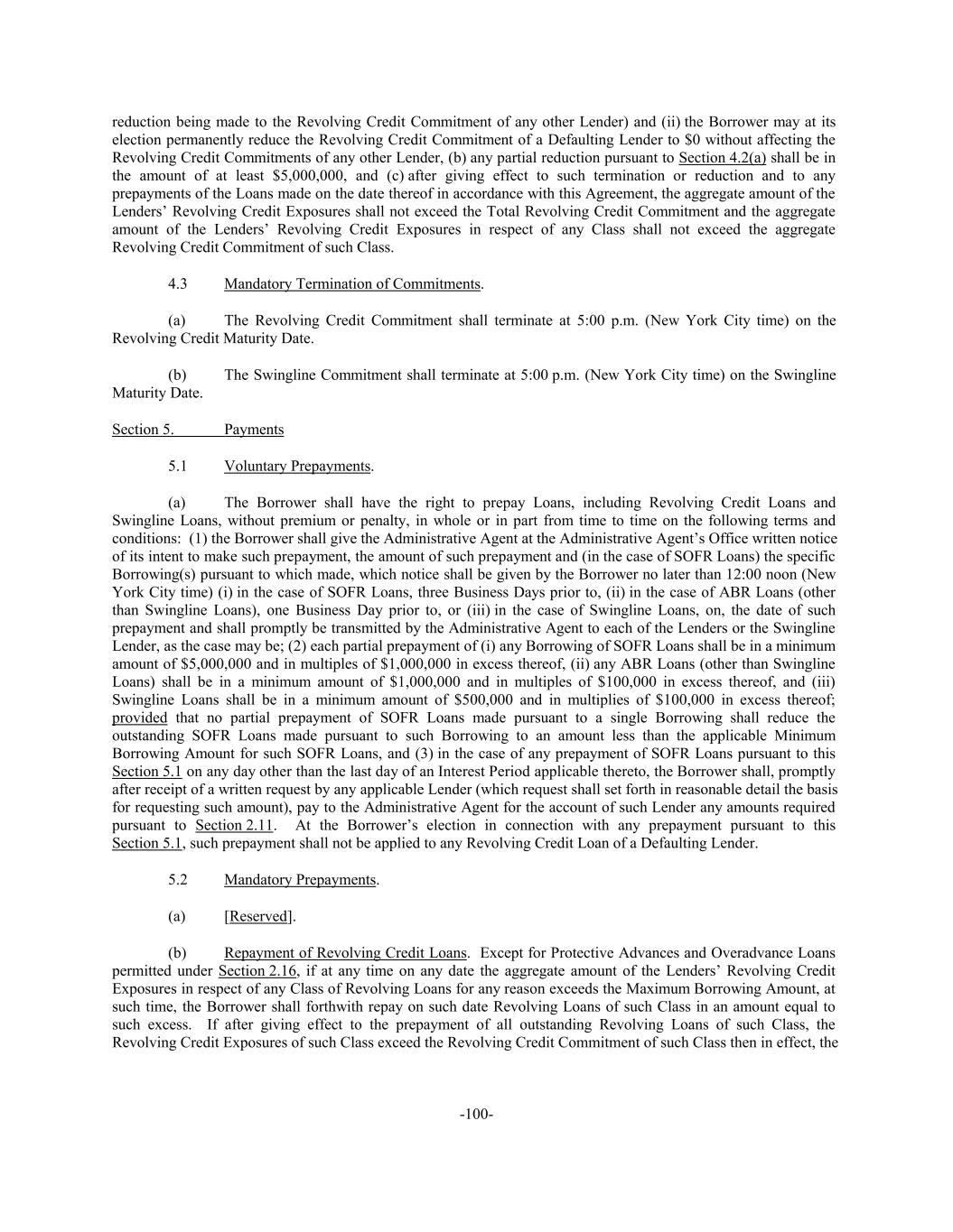 reduction being made to the Revolving Credit Commitment of any other Lender) and (ii) the Borrower may at its election permanently reduce the Revolving Credit Commitment of a Defaulting Lender to $0 without affecting the Revolving Credit Commitments of any other Lender, (b) any partial reduction pursuant to Section 4.2(a) shall be in the amount of at least $5,000,000, and (c) after giving effect to such termination or reduction and to any prepayments of the Loans made on the date thereof in accordance with this Agreement, the aggregate amount of the Lenders’ Revolving Credit Exposures shall not exceed the Total Revolving Credit Commitment and the aggregate amount of the Lenders’ Revolving Credit Exposures in respect of any Class shall not exceed the aggregate Revolving Credit Commitment of such Class. 4.3 Mandatory Termination of Commitments. (a) The Revolving Credit Commitment shall terminate at 5:00 p.m. (New York City time) on the Revolving Credit Maturity Date. (b) The Swingline Commitment shall terminate at 5:00 p.m. (New York City time) on the Swingline Maturity Date. Section 5. Payments 5.1 Voluntary Prepayments. (a) The Borrower shall have the right to prepay Loans, including Revolving Credit Loans and Swingline Loans, without premium or penalty, in whole or in part from time to time on the following terms and conditions: (1) the Borrower shall give the Administrative Agent at the Administrative Agent’s Office written notice of its intent to make such prepayment, the amount of such prepayment and (in the case of SOFR Loans) the specific Borrowing(s) pursuant to which made, which notice shall be given by the Borrower no later than 12:00 noon (New York City time) (i) in the case of SOFR Loans, three Business Days prior to, (ii) in the case of ABR Loans (other than Swingline Loans), one Business Day prior to, or (iii) in the case of Swingline Loans, on, the date of such prepayment and shall promptly be transmitted by the Administrative Agent to each of the Lenders or the Swingline Lender, as the case may be; (2) each partial prepayment of (i) any Borrowing of SOFR Loans shall be in a minimum amount of $5,000,000 and in multiples of $1,000,000 in excess thereof, (ii) any ABR Loans (other than Swingline Loans) shall be in a minimum amount of $1,000,000 and in multiples of $100,000 in excess thereof, and (iii) Swingline Loans shall be in a minimum amount of $500,000 and in multiplies of $100,000 in excess thereof; provided that no partial prepayment of SOFR Loans made pursuant to a single Borrowing shall reduce the outstanding SOFR Loans made pursuant to such Borrowing to an amount less than the applicable Minimum Borrowing Amount for such SOFR Loans, and (3) in the case of any prepayment of SOFR Loans pursuant to this Section 5.1 on any day other than the last day of an Interest Period applicable thereto, the Borrower shall, promptly after receipt of a written request by any applicable Lender (which request shall set forth in reasonable detail the basis for requesting such amount), pay to the Administrative Agent for the account of such Lender any amounts required pursuant to Section 2.11. At the Borrower’s election in connection with any prepayment pursuant to this Section 5.1, such prepayment shall not be applied to any Revolving Credit Loan of a Defaulting Lender. 5.2 Mandatory Prepayments. (a) [Reserved]. (b) Repayment of Revolving Credit Loans. Except for Protective Advances and Overadvance Loans permitted under Section 2.16, if at any time on any date the aggregate amount of the Lenders’ Revolving Credit Exposures in respect of any Class of Revolving Loans for any reason exceeds the Maximum Borrowing Amount, at such time, the Borrower shall forthwith repay on such date Revolving Loans of such Class in an amount equal to such excess. If after giving effect to the prepayment of all outstanding Revolving Loans of such Class, the Revolving Credit Exposures of such Class exceed the Revolving Credit Commitment of such Class then in effect, the -100-
