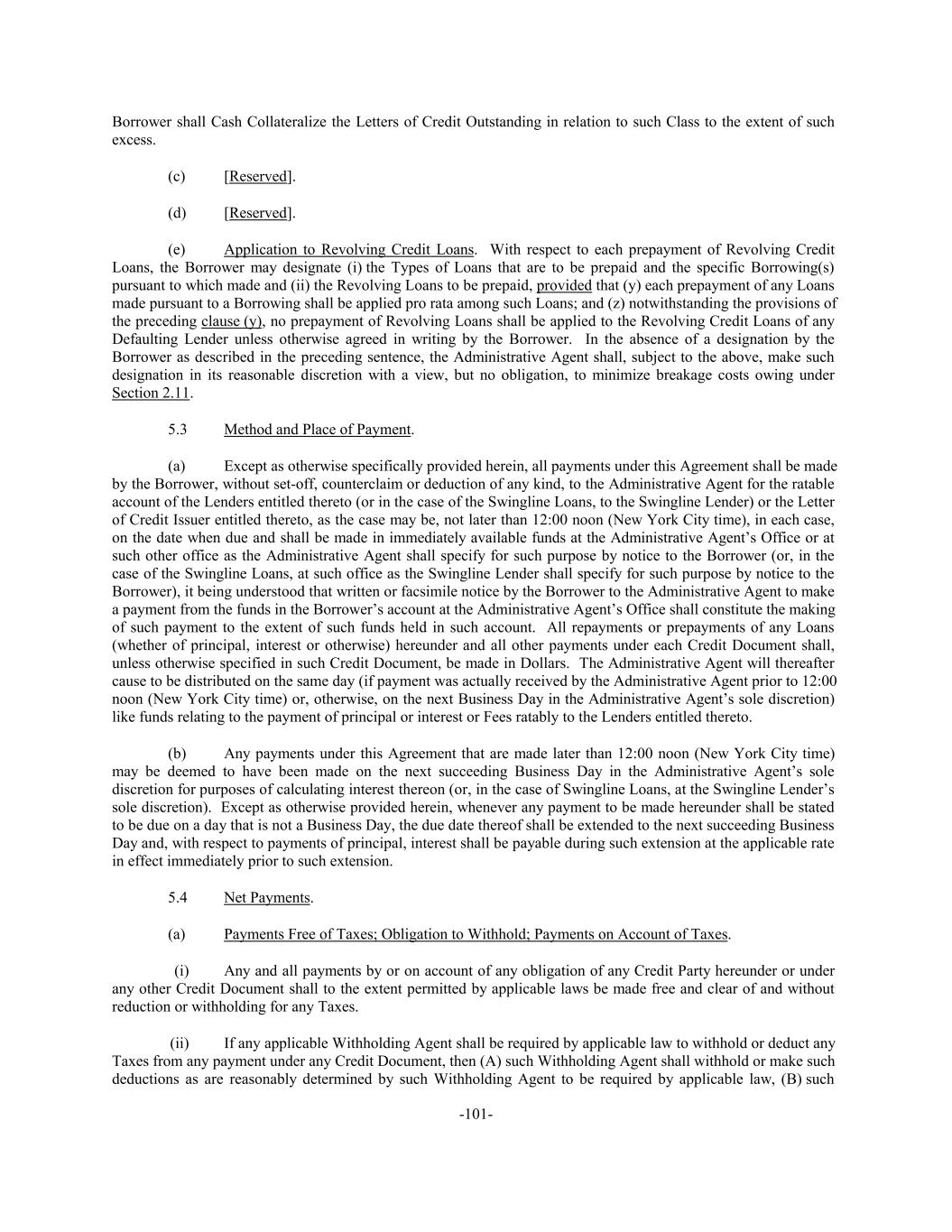 Borrower shall Cash Collateralize the Letters of Credit Outstanding in relation to such Class to the extent of such excess. (c) [Reserved]. (d) [Reserved]. (e) Application to Revolving Credit Loans. With respect to each prepayment of Revolving Credit Loans, the Borrower may designate (i) the Types of Loans that are to be prepaid and the specific Borrowing(s) pursuant to which made and (ii) the Revolving Loans to be prepaid, provided that (y) each prepayment of any Loans made pursuant to a Borrowing shall be applied pro rata among such Loans; and (z) notwithstanding the provisions of the preceding clause (y), no prepayment of Revolving Loans shall be applied to the Revolving Credit Loans of any Defaulting Lender unless otherwise agreed in writing by the Borrower. In the absence of a designation by the Borrower as described in the preceding sentence, the Administrative Agent shall, subject to the above, make such designation in its reasonable discretion with a view, but no obligation, to minimize breakage costs owing under Section 2.11. 5.3 Method and Place of Payment. (a) Except as otherwise specifically provided herein, all payments under this Agreement shall be made by the Borrower, without set-off, counterclaim or deduction of any kind, to the Administrative Agent for the ratable account of the Lenders entitled thereto (or in the case of the Swingline Loans, to the Swingline Lender) or the Letter of Credit Issuer entitled thereto, as the case may be, not later than 12:00 noon (New York City time), in each case, on the date when due and shall be made in immediately available funds at the Administrative Agent’s Office or at such other office as the Administrative Agent shall specify for such purpose by notice to the Borrower (or, in the case of the Swingline Loans, at such office as the Swingline Lender shall specify for such purpose by notice to the Borrower), it being understood that written or facsimile notice by the Borrower to the Administrative Agent to make a payment from the funds in the Borrower’s account at the Administrative Agent’s Office shall constitute the making of such payment to the extent of such funds held in such account. All repayments or prepayments of any Loans (whether of principal, interest or otherwise) hereunder and all other payments under each Credit Document shall, unless otherwise specified in such Credit Document, be made in Dollars. The Administrative Agent will thereafter cause to be distributed on the same day (if payment was actually received by the Administrative Agent prior to 12:00 noon (New York City time) or, otherwise, on the next Business Day in the Administrative Agent’s sole discretion) like funds relating to the payment of principal or interest or Fees ratably to the Lenders entitled thereto. (b) Any payments under this Agreement that are made later than 12:00 noon (New York City time) may be deemed to have been made on the next succeeding Business Day in the Administrative Agent’s sole discretion for purposes of calculating interest thereon (or, in the case of Swingline Loans, at the Swingline Lender’s sole discretion). Except as otherwise provided herein, whenever any payment to be made hereunder shall be stated to be due on a day that is not a Business Day, the due date thereof shall be extended to the next succeeding Business Day and, with respect to payments of principal, interest shall be payable during such extension at the applicable rate in effect immediately prior to such extension. 5.4 Net Payments. (a) Payments Free of Taxes; Obligation to Withhold; Payments on Account of Taxes. (i) Any and all payments by or on account of any obligation of any Credit Party hereunder or under any other Credit Document shall to the extent permitted by applicable laws be made free and clear of and without reduction or withholding for any Taxes. (ii) If any applicable Withholding Agent shall be required by applicable law to withhold or deduct any Taxes from any payment under any Credit Document, then (A) such Withholding Agent shall withhold or make such deductions as are reasonably determined by such Withholding Agent to be required by applicable law, (B) such -101-