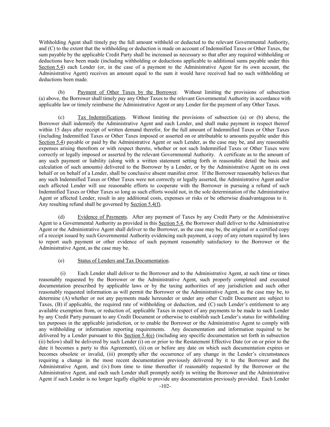 Withholding Agent shall timely pay the full amount withheld or deducted to the relevant Governmental Authority, and (C) to the extent that the withholding or deduction is made on account of Indemnified Taxes or Other Taxes, the sum payable by the applicable Credit Party shall be increased as necessary so that after any required withholding or deductions have been made (including withholding or deductions applicable to additional sums payable under this Section 5.4) each Lender (or, in the case of a payment to the Administrative Agent for its own account, the Administrative Agent) receives an amount equal to the sum it would have received had no such withholding or deductions been made. (b) Payment of Other Taxes by the Borrower. Without limiting the provisions of subsection (a) above, the Borrower shall timely pay any Other Taxes to the relevant Governmental Authority in accordance with applicable law or timely reimburse the Administrative Agent or any Lender for the payment of any Other Taxes. (c) Tax Indemnifications. Without limiting the provisions of subsection (a) or (b) above, the Borrower shall indemnify the Administrative Agent and each Lender, and shall make payment in respect thereof within 15 days after receipt of written demand therefor, for the full amount of Indemnified Taxes or Other Taxes (including Indemnified Taxes or Other Taxes imposed or asserted on or attributable to amounts payable under this Section 5.4) payable or paid by the Administrative Agent or such Lender, as the case may be, and any reasonable expenses arising therefrom or with respect thereto, whether or not such Indemnified Taxes or Other Taxes were correctly or legally imposed or asserted by the relevant Governmental Authority. A certificate as to the amount of any such payment or liability (along with a written statement setting forth in reasonable detail the basis and calculation of such amounts) delivered to the Borrower by a Lender, or by the Administrative Agent on its own behalf or on behalf of a Lender, shall be conclusive absent manifest error. If the Borrower reasonably believes that any such Indemnified Taxes or Other Taxes were not correctly or legally asserted, the Administrative Agent and/or each affected Lender will use reasonable efforts to cooperate with the Borrower in pursuing a refund of such Indemnified Taxes or Other Taxes so long as such efforts would not, in the sole determination of the Administrative Agent or affected Lender, result in any additional costs, expenses or risks or be otherwise disadvantageous to it. Any resulting refund shall be governed by Section 5.4(f). (d) Evidence of Payments. After any payment of Taxes by any Credit Party or the Administrative Agent to a Governmental Authority as provided in this Section 5.4, the Borrower shall deliver to the Administrative Agent or the Administrative Agent shall deliver to the Borrower, as the case may be, the original or a certified copy of a receipt issued by such Governmental Authority evidencing such payment, a copy of any return required by laws to report such payment or other evidence of such payment reasonably satisfactory to the Borrower or the Administrative Agent, as the case may be. (e) Status of Lenders and Tax Documentation. (i) Each Lender shall deliver to the Borrower and to the Administrative Agent, at such time or times reasonably requested by the Borrower or the Administrative Agent, such properly completed and executed documentation prescribed by applicable laws or by the taxing authorities of any jurisdiction and such other reasonably requested information as will permit the Borrower or the Administrative Agent, as the case may be, to determine (A) whether or not any payments made hereunder or under any other Credit Document are subject to Taxes, (B) if applicable, the required rate of withholding or deduction, and (C) such Lender’s entitlement to any available exemption from, or reduction of, applicable Taxes in respect of any payments to be made to such Lender by any Credit Party pursuant to any Credit Document or otherwise to establish such Lender’s status for withholding tax purposes in the applicable jurisdiction, or to enable the Borrower or the Administrative Agent to comply with any withholding or information reporting requirements. Any documentation and information required to be delivered by a Lender pursuant to this Section 5.4(e) (including any specific documentation set forth in subsection (ii) below) shall be delivered by such Lender (i) on or prior to the Restatement Effective Date (or on or prior to the date it becomes a party to this Agreement), (ii) on or before any date on which such documentation expires or becomes obsolete or invalid, (iii) promptly after the occurrence of any change in the Lender’s circumstances requiring a change in the most recent documentation previously delivered by it to the Borrower and the Administrative Agent, and (iv) from time to time thereafter if reasonably requested by the Borrower or the Administrative Agent, and each such Lender shall promptly notify in writing the Borrower and the Administrative Agent if such Lender is no longer legally eligible to provide any documentation previously provided. Each Lender -102-