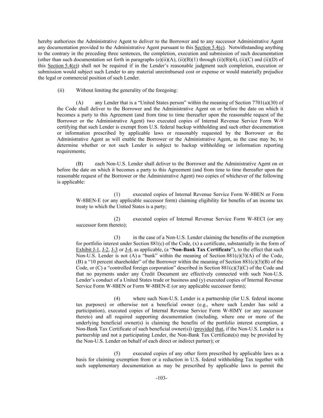 hereby authorizes the Administrative Agent to deliver to the Borrower and to any successor Administrative Agent any documentation provided to the Administrative Agent pursuant to this Section 5.4(e). Notwithstanding anything to the contrary in the preceding three sentences, the completion, execution and submission of such documentation (other than such documentation set forth in paragraphs (e)(ii)(A), (ii)(B)(1) through (ii)(B)(4), (ii)(C) and (ii)(D) of this Section 5.4(e)) shall not be required if in the Lender’s reasonable judgment such completion, execution or submission would subject such Lender to any material unreimbursed cost or expense or would materially prejudice the legal or commercial position of such Lender. (ii) Without limiting the generality of the foregoing: (A) any Lender that is a “United States person” within the meaning of Section 7701(a)(30) of the Code shall deliver to the Borrower and the Administrative Agent on or before the date on which it becomes a party to this Agreement (and from time to time thereafter upon the reasonable request of the Borrower or the Administrative Agent) two executed copies of Internal Revenue Service Form W-9 certifying that such Lender is exempt from U.S. federal backup withholding and such other documentation or information prescribed by applicable laws or reasonably requested by the Borrower or the Administrative Agent as will enable the Borrower or the Administrative Agent, as the case may be, to determine whether or not such Lender is subject to backup withholding or information reporting requirements; (B) each Non-U.S. Lender shall deliver to the Borrower and the Administrative Agent on or before the date on which it becomes a party to this Agreement (and from time to time thereafter upon the reasonable request of the Borrower or the Administrative Agent) two copies of whichever of the following is applicable: (1) executed copies of Internal Revenue Service Form W-8BEN or Form W-8BEN-E (or any applicable successor form) claiming eligibility for benefits of an income tax treaty to which the United States is a party; (2) executed copies of Internal Revenue Service Form W-8ECI (or any successor form thereto); (3) in the case of a Non-U.S. Lender claiming the benefits of the exemption for portfolio interest under Section 881(c) of the Code, (x) a certificate, substantially in the form of Exhibit J-1, J-2, J-3 or J-4, as applicable, (a “Non-Bank Tax Certificate”), to the effect that such Non-U.S. Lender is not (A) a “bank” within the meaning of Section 881(c)(3)(A) of the Code, (B) a “10 percent shareholder” of the Borrower within the meaning of Section 881(c)(3)(B) of the Code, or (C) a “controlled foreign corporation” described in Section 881(c)(3)(C) of the Code and that no payments under any Credit Document are effectively connected with such Non-U.S. Lender’s conduct of a United States trade or business and (y) executed copies of Internal Revenue Service Form W-8BEN or Form W-8BEN-E (or any applicable successor form); (4) where such Non-U.S. Lender is a partnership (for U.S. federal income tax purposes) or otherwise not a beneficial owner (e.g., where such Lender has sold a participation), executed copies of Internal Revenue Service Form W-8IMY (or any successor thereto) and all required supporting documentation (including, where one or more of the underlying beneficial owner(s) is claiming the benefits of the portfolio interest exemption, a Non-Bank Tax Certificate of such beneficial owner(s)) (provided that, if the Non-U.S. Lender is a partnership and not a participating Lender, the Non-Bank Tax Certificate(s) may be provided by the Non-U.S. Lender on behalf of each direct or indirect partner); or (5) executed copies of any other form prescribed by applicable laws as a basis for claiming exemption from or a reduction in U.S. federal withholding Tax together with such supplementary documentation as may be prescribed by applicable laws to permit the -103-