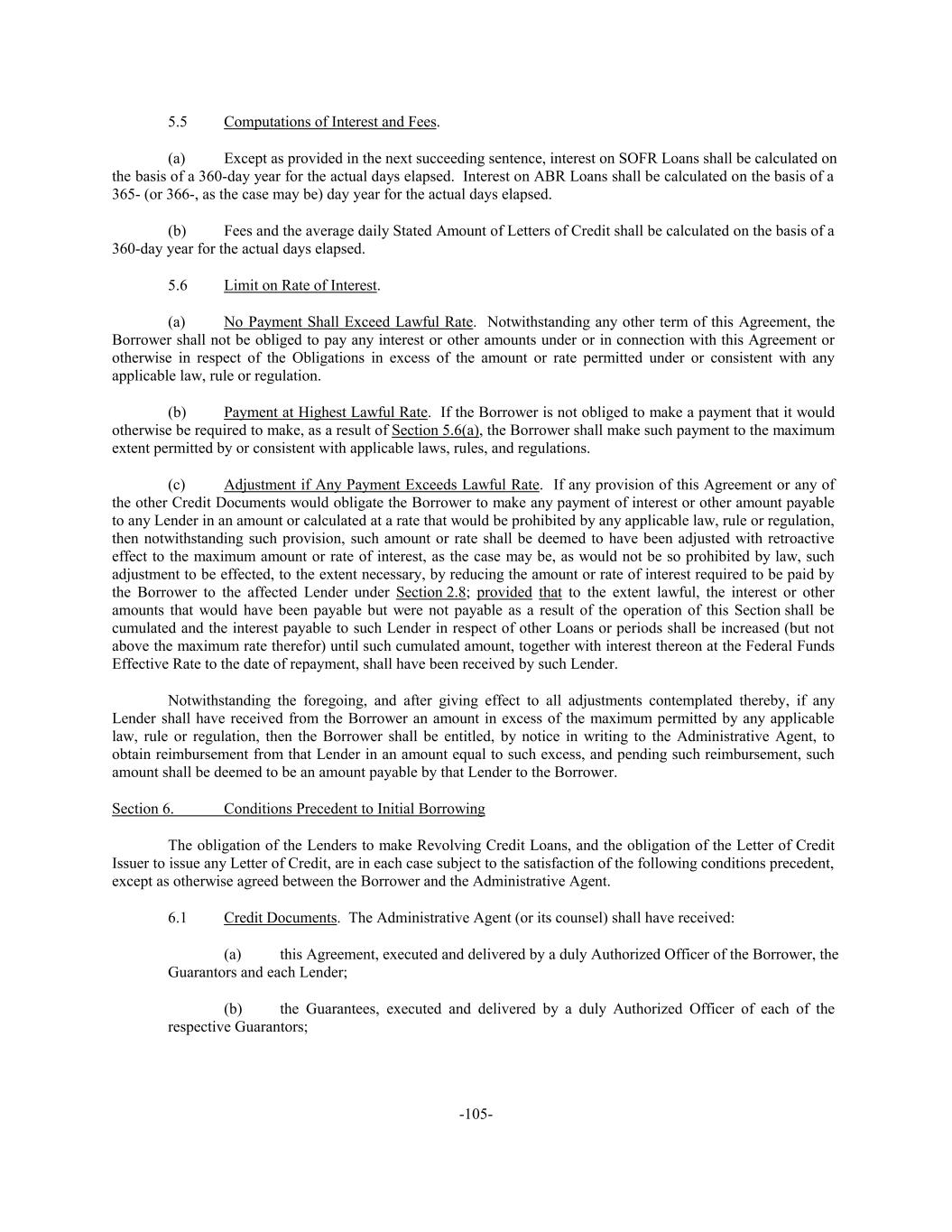 5.5 Computations of Interest and Fees. (a) Except as provided in the next succeeding sentence, interest on SOFR Loans shall be calculated on the basis of a 360-day year for the actual days elapsed. Interest on ABR Loans shall be calculated on the basis of a 365- (or 366-, as the case may be) day year for the actual days elapsed. (b) Fees and the average daily Stated Amount of Letters of Credit shall be calculated on the basis of a 360-day year for the actual days elapsed. 5.6 Limit on Rate of Interest. (a) No Payment Shall Exceed Lawful Rate. Notwithstanding any other term of this Agreement, the Borrower shall not be obliged to pay any interest or other amounts under or in connection with this Agreement or otherwise in respect of the Obligations in excess of the amount or rate permitted under or consistent with any applicable law, rule or regulation. (b) Payment at Highest Lawful Rate. If the Borrower is not obliged to make a payment that it would otherwise be required to make, as a result of Section 5.6(a), the Borrower shall make such payment to the maximum extent permitted by or consistent with applicable laws, rules, and regulations. (c) Adjustment if Any Payment Exceeds Lawful Rate. If any provision of this Agreement or any of the other Credit Documents would obligate the Borrower to make any payment of interest or other amount payable to any Lender in an amount or calculated at a rate that would be prohibited by any applicable law, rule or regulation, then notwithstanding such provision, such amount or rate shall be deemed to have been adjusted with retroactive effect to the maximum amount or rate of interest, as the case may be, as would not be so prohibited by law, such adjustment to be effected, to the extent necessary, by reducing the amount or rate of interest required to be paid by the Borrower to the affected Lender under Section 2.8; provided that to the extent lawful, the interest or other amounts that would have been payable but were not payable as a result of the operation of this Section shall be cumulated and the interest payable to such Lender in respect of other Loans or periods shall be increased (but not above the maximum rate therefor) until such cumulated amount, together with interest thereon at the Federal Funds Effective Rate to the date of repayment, shall have been received by such Lender. Notwithstanding the foregoing, and after giving effect to all adjustments contemplated thereby, if any Lender shall have received from the Borrower an amount in excess of the maximum permitted by any applicable law, rule or regulation, then the Borrower shall be entitled, by notice in writing to the Administrative Agent, to obtain reimbursement from that Lender in an amount equal to such excess, and pending such reimbursement, such amount shall be deemed to be an amount payable by that Lender to the Borrower. Section 6. Conditions Precedent to Initial Borrowing The obligation of the Lenders to make Revolving Credit Loans, and the obligation of the Letter of Credit Issuer to issue any Letter of Credit, are in each case subject to the satisfaction of the following conditions precedent, except as otherwise agreed between the Borrower and the Administrative Agent. 6.1 Credit Documents. The Administrative Agent (or its counsel) shall have received: (a) this Agreement, executed and delivered by a duly Authorized Officer of the Borrower, the Guarantors and each Lender; (b) the Guarantees, executed and delivered by a duly Authorized Officer of each of the respective Guarantors; -105-