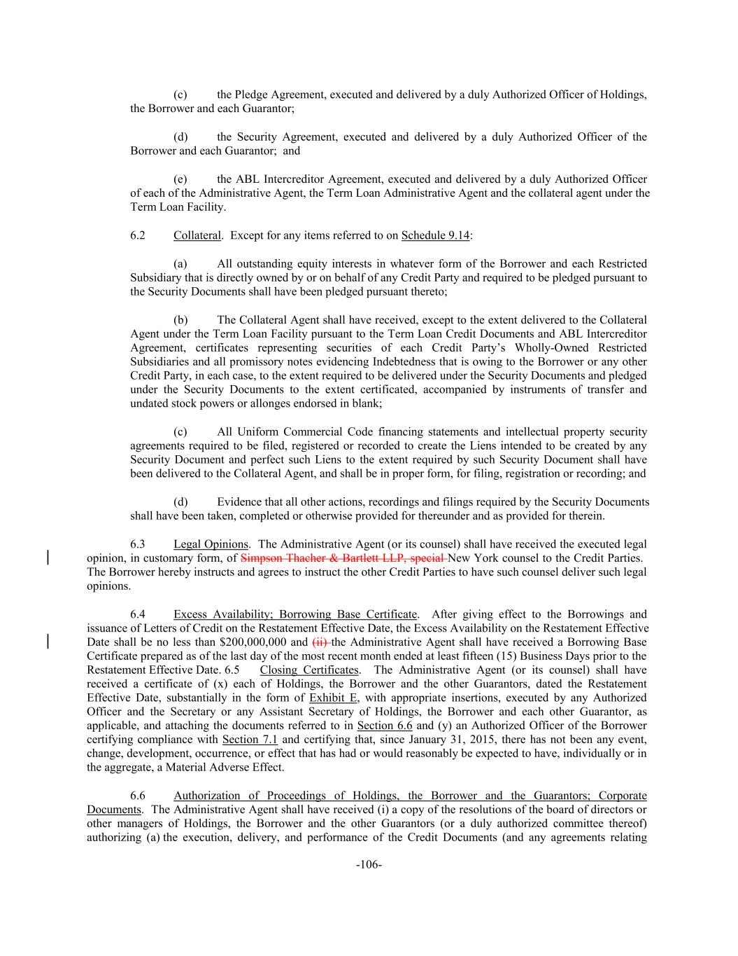 (c) the Pledge Agreement, executed and delivered by a duly Authorized Officer of Holdings, the Borrower and each Guarantor; (d) the Security Agreement, executed and delivered by a duly Authorized Officer of the Borrower and each Guarantor; and (e) the ABL Intercreditor Agreement, executed and delivered by a duly Authorized Officer of each of the Administrative Agent, the Term Loan Administrative Agent and the collateral agent under the Term Loan Facility. 6.2 Collateral. Except for any items referred to on Schedule 9.14: (a) All outstanding equity interests in whatever form of the Borrower and each Restricted Subsidiary that is directly owned by or on behalf of any Credit Party and required to be pledged pursuant to the Security Documents shall have been pledged pursuant thereto; (b) The Collateral Agent shall have received, except to the extent delivered to the Collateral Agent under the Term Loan Facility pursuant to the Term Loan Credit Documents and ABL Intercreditor Agreement, certificates representing securities of each Credit Party’s Wholly-Owned Restricted Subsidiaries and all promissory notes evidencing Indebtedness that is owing to the Borrower or any other Credit Party, in each case, to the extent required to be delivered under the Security Documents and pledged under the Security Documents to the extent certificated, accompanied by instruments of transfer and undated stock powers or allonges endorsed in blank; (c) All Uniform Commercial Code financing statements and intellectual property security agreements required to be filed, registered or recorded to create the Liens intended to be created by any Security Document and perfect such Liens to the extent required by such Security Document shall have been delivered to the Collateral Agent, and shall be in proper form, for filing, registration or recording; and (d) Evidence that all other actions, recordings and filings required by the Security Documents shall have been taken, completed or otherwise provided for thereunder and as provided for therein. 6.3 Legal Opinions. The Administrative Agent (or its counsel) shall have received the executed legal opinion, in customary form, of Simpson Thacher & Bartlett LLP, special New York counsel to the Credit Parties. The Borrower hereby instructs and agrees to instruct the other Credit Parties to have such counsel deliver such legal opinions. 6.4 Excess Availability; Borrowing Base Certificate. After giving effect to the Borrowings and issuance of Letters of Credit on the Restatement Effective Date, the Excess Availability on the Restatement Effective Date shall be no less than $200,000,000 and (ii) the Administrative Agent shall have received a Borrowing Base Certificate prepared as of the last day of the most recent month ended at least fifteen (15) Business Days prior to the Restatement Effective Date. 6.5 Closing Certificates. The Administrative Agent (or its counsel) shall have received a certificate of (x) each of Holdings, the Borrower and the other Guarantors, dated the Restatement Effective Date, substantially in the form of Exhibit E, with appropriate insertions, executed by any Authorized Officer and the Secretary or any Assistant Secretary of Holdings, the Borrower and each other Guarantor, as applicable, and attaching the documents referred to in Section 6.6 and (y) an Authorized Officer of the Borrower certifying compliance with Section 7.1 and certifying that, since January 31, 2015, there has not been any event, change, development, occurrence, or effect that has had or would reasonably be expected to have, individually or in the aggregate, a Material Adverse Effect. 6.6 Authorization of Proceedings of Holdings, the Borrower and the Guarantors; Corporate Documents. The Administrative Agent shall have received (i) a copy of the resolutions of the board of directors or other managers of Holdings, the Borrower and the other Guarantors (or a duly authorized committee thereof) authorizing (a) the execution, delivery, and performance of the Credit Documents (and any agreements relating -106-