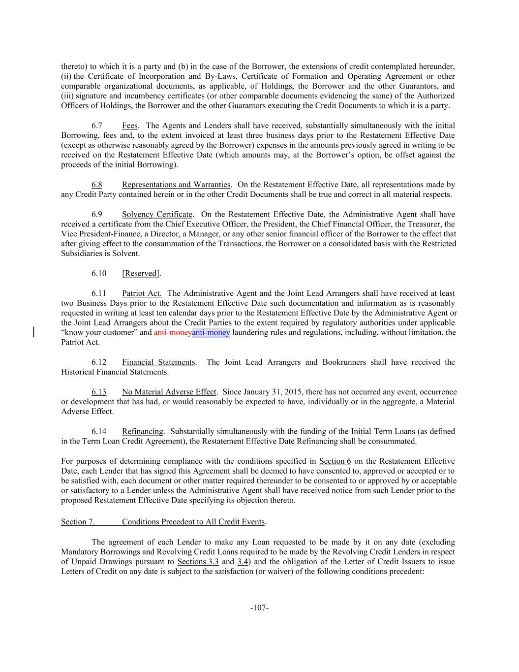 thereto) to which it is a party and (b) in the case of the Borrower, the extensions of credit contemplated hereunder, (ii) the Certificate of Incorporation and By-Laws, Certificate of Formation and Operating Agreement or other comparable organizational documents, as applicable, of Holdings, the Borrower and the other Guarantors, and (iii) signature and incumbency certificates (or other comparable documents evidencing the same) of the Authorized Officers of Holdings, the Borrower and the other Guarantors executing the Credit Documents to which it is a party. 6.7 Fees. The Agents and Lenders shall have received, substantially simultaneously with the initial Borrowing, fees and, to the extent invoiced at least three business days prior to the Restatement Effective Date (except as otherwise reasonably agreed by the Borrower) expenses in the amounts previously agreed in writing to be received on the Restatement Effective Date (which amounts may, at the Borrower’s option, be offset against the proceeds of the initial Borrowing). 6.8 Representations and Warranties. On the Restatement Effective Date, all representations made by any Credit Party contained herein or in the other Credit Documents shall be true and correct in all material respects. 6.9 Solvency Certificate. On the Restatement Effective Date, the Administrative Agent shall have received a certificate from the Chief Executive Officer, the President, the Chief Financial Officer, the Treasurer, the Vice President-Finance, a Director, a Manager, or any other senior financial officer of the Borrower to the effect that after giving effect to the consummation of the Transactions, the Borrower on a consolidated basis with the Restricted Subsidiaries is Solvent. 6.10 [Reserved]. 6.11 Patriot Act. The Administrative Agent and the Joint Lead Arrangers shall have received at least two Business Days prior to the Restatement Effective Date such documentation and information as is reasonably requested in writing at least ten calendar days prior to the Restatement Effective Date by the Administrative Agent or the Joint Lead Arrangers about the Credit Parties to the extent required by regulatory authorities under applicable “know your customer” and anti-moneyanti-money laundering rules and regulations, including, without limitation, the Patriot Act. 6.12 Financial Statements. The Joint Lead Arrangers and Bookrunners shall have received the Historical Financial Statements. 6.13 No Material Adverse Effect. Since January 31, 2015, there has not occurred any event, occurrence or development that has had, or would reasonably be expected to have, individually or in the aggregate, a Material Adverse Effect. 6.14 Refinancing. Substantially simultaneously with the funding of the Initial Term Loans (as defined in the Term Loan Credit Agreement), the Restatement Effective Date Refinancing shall be consummated. For purposes of determining compliance with the conditions specified in Section 6 on the Restatement Effective Date, each Lender that has signed this Agreement shall be deemed to have consented to, approved or accepted or to be satisfied with, each document or other matter required thereunder to be consented to or approved by or acceptable or satisfactory to a Lender unless the Administrative Agent shall have received notice from such Lender prior to the proposed Restatement Effective Date specifying its objection thereto. Section 7. Conditions Precedent to All Credit Events. The agreement of each Lender to make any Loan requested to be made by it on any date (excluding Mandatory Borrowings and Revolving Credit Loans required to be made by the Revolving Credit Lenders in respect of Unpaid Drawings pursuant to Sections 3.3 and 3.4) and the obligation of the Letter of Credit Issuers to issue Letters of Credit on any date is subject to the satisfaction (or waiver) of the following conditions precedent: -107-
