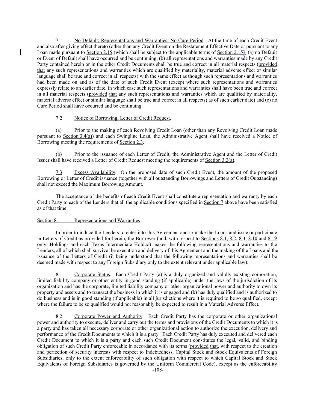 7.1 No Default; Representations and Warranties; No Cure Period. At the time of each Credit Event and also after giving effect thereto (other than any Credit Event on the Restatement Effective Date or pursuant to any Loan made pursuant to Section 2.15 (which shall be subject to the applicable terms of Section 2.15)) (a) no Default or Event of Default shall have occurred and be continuing, (b) all representations and warranties made by any Credit Party contained herein or in the other Credit Documents shall be true and correct in all material respects (provided that any such representations and warranties which are qualified by materiality, material adverse effect or similar language shall be true and correct in all respects) with the same effect as though such representations and warranties had been made on and as of the date of such Credit Event (except where such representations and warranties expressly relate to an earlier date, in which case such representations and warranties shall have been true and correct in all material respects (provided that any such representations and warranties which are qualified by materiality, material adverse effect or similar language shall be true and correct in all respects) as of such earlier date) and (c) no Cure Period shall have occurred and be continuing. 7.2 Notice of Borrowing; Letter of Credit Request. (a) Prior to the making of each Revolving Credit Loan (other than any Revolving Credit Loan made pursuant to Section 3.4(a)) and each Swingline Loan, the Administrative Agent shall have received a Notice of Borrowing meeting the requirements of Section 2.3. (b) Prior to the issuance of each Letter of Credit, the Administrative Agent and the Letter of Credit Issuer shall have received a Letter of Credit Request meeting the requirements of Section 3.2(a). 7.3 Excess Availability. On the proposed date of such Credit Event, the amount of the proposed Borrowing or Letter of Credit issuance (together with all outstanding Borrowings and Letters of Credit Outstanding) shall not exceed the Maximum Borrowing Amount. The acceptance of the benefits of each Credit Event shall constitute a representation and warranty by each Credit Party to each of the Lenders that all the applicable conditions specified in Section 7 above have been satisfied as of that time. Section 8. Representations and Warranties In order to induce the Lenders to enter into this Agreement and to make the Loans and issue or participate in Letters of Credit as provided for herein, the Borrower (and, with respect to Sections 8.1, 8.2, 8.3, 8.10 and 8.19 only, Holdings and each Texas Intermediate Holdco) makes the following representations and warranties to the Lenders, all of which shall survive the execution and delivery of this Agreement and the making of the Loans and the issuance of the Letters of Credit (it being understood that the following representations and warranties shall be deemed made with respect to any Foreign Subsidiary only to the extent relevant under applicable law): 8.1 Corporate Status. Each Credit Party (a) is a duly organized and validly existing corporation, limited liability company or other entity in good standing (if applicable) under the laws of the jurisdiction of its organization and has the corporate, limited liability company or other organizational power and authority to own its property and assets and to transact the business in which it is engaged and (b) has duly qualified and is authorized to do business and is in good standing (if applicable) in all jurisdictions where it is required to be so qualified, except where the failure to be so qualified would not reasonably be expected to result in a Material Adverse Effect. 8.2 Corporate Power and Authority. Each Credit Party has the corporate or other organizational power and authority to execute, deliver and carry out the terms and provisions of the Credit Documents to which it is a party and has taken all necessary corporate or other organizational action to authorize the execution, delivery and performance of the Credit Documents to which it is a party. Each Credit Party has duly executed and delivered each Credit Document to which it is a party and each such Credit Document constitutes the legal, valid, and binding obligation of such Credit Party enforceable in accordance with its terms (provided that, with respect to the creation and perfection of security interests with respect to Indebtedness, Capital Stock and Stock Equivalents of Foreign Subsidiaries, only to the extent enforceability of such obligation with respect to which Capital Stock and Stock Equivalents of Foreign Subsidiaries is governed by the Uniform Commercial Code), except as the enforceability -108-