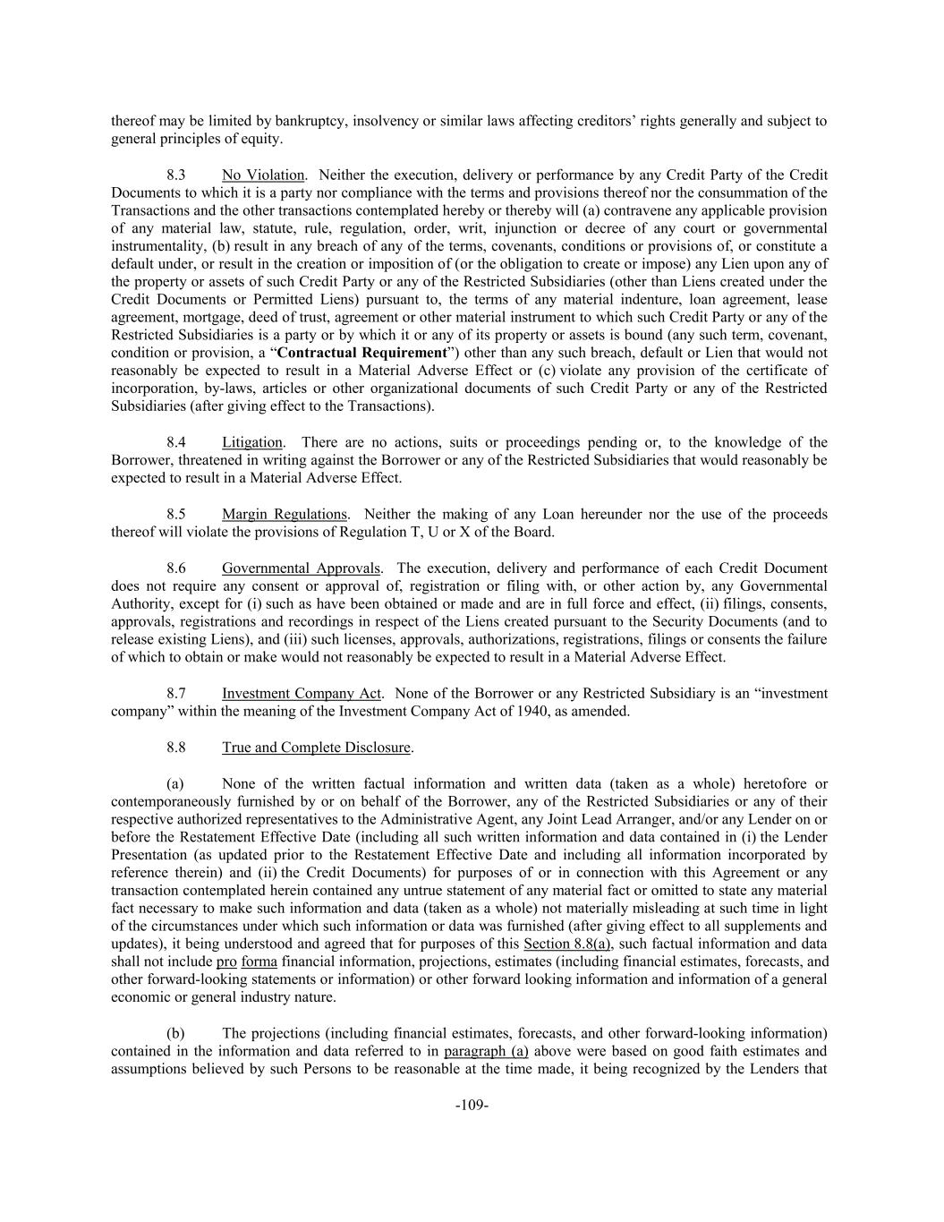thereof may be limited by bankruptcy, insolvency or similar laws affecting creditors’ rights generally and subject to general principles of equity. 8.3 No Violation. Neither the execution, delivery or performance by any Credit Party of the Credit Documents to which it is a party nor compliance with the terms and provisions thereof nor the consummation of the Transactions and the other transactions contemplated hereby or thereby will (a) contravene any applicable provision of any material law, statute, rule, regulation, order, writ, injunction or decree of any court or governmental instrumentality, (b) result in any breach of any of the terms, covenants, conditions or provisions of, or constitute a default under, or result in the creation or imposition of (or the obligation to create or impose) any Lien upon any of the property or assets of such Credit Party or any of the Restricted Subsidiaries (other than Liens created under the Credit Documents or Permitted Liens) pursuant to, the terms of any material indenture, loan agreement, lease agreement, mortgage, deed of trust, agreement or other material instrument to which such Credit Party or any of the Restricted Subsidiaries is a party or by which it or any of its property or assets is bound (any such term, covenant, condition or provision, a “Contractual Requirement”) other than any such breach, default or Lien that would not reasonably be expected to result in a Material Adverse Effect or (c) violate any provision of the certificate of incorporation, by-laws, articles or other organizational documents of such Credit Party or any of the Restricted Subsidiaries (after giving effect to the Transactions). 8.4 Litigation. There are no actions, suits or proceedings pending or, to the knowledge of the Borrower, threatened in writing against the Borrower or any of the Restricted Subsidiaries that would reasonably be expected to result in a Material Adverse Effect. 8.5 Margin Regulations. Neither the making of any Loan hereunder nor the use of the proceeds thereof will violate the provisions of Regulation T, U or X of the Board. 8.6 Governmental Approvals. The execution, delivery and performance of each Credit Document does not require any consent or approval of, registration or filing with, or other action by, any Governmental Authority, except for (i) such as have been obtained or made and are in full force and effect, (ii) filings, consents, approvals, registrations and recordings in respect of the Liens created pursuant to the Security Documents (and to release existing Liens), and (iii) such licenses, approvals, authorizations, registrations, filings or consents the failure of which to obtain or make would not reasonably be expected to result in a Material Adverse Effect. 8.7 Investment Company Act. None of the Borrower or any Restricted Subsidiary is an “investment company” within the meaning of the Investment Company Act of 1940, as amended. 8.8 True and Complete Disclosure. (a) None of the written factual information and written data (taken as a whole) heretofore or contemporaneously furnished by or on behalf of the Borrower, any of the Restricted Subsidiaries or any of their respective authorized representatives to the Administrative Agent, any Joint Lead Arranger, and/or any Lender on or before the Restatement Effective Date (including all such written information and data contained in (i) the Lender Presentation (as updated prior to the Restatement Effective Date and including all information incorporated by reference therein) and (ii) the Credit Documents) for purposes of or in connection with this Agreement or any transaction contemplated herein contained any untrue statement of any material fact or omitted to state any material fact necessary to make such information and data (taken as a whole) not materially misleading at such time in light of the circumstances under which such information or data was furnished (after giving effect to all supplements and updates), it being understood and agreed that for purposes of this Section 8.8(a), such factual information and data shall not include pro forma financial information, projections, estimates (including financial estimates, forecasts, and other forward-looking statements or information) or other forward looking information and information of a general economic or general industry nature. (b) The projections (including financial estimates, forecasts, and other forward-looking information) contained in the information and data referred to in paragraph (a) above were based on good faith estimates and assumptions believed by such Persons to be reasonable at the time made, it being recognized by the Lenders that -109-