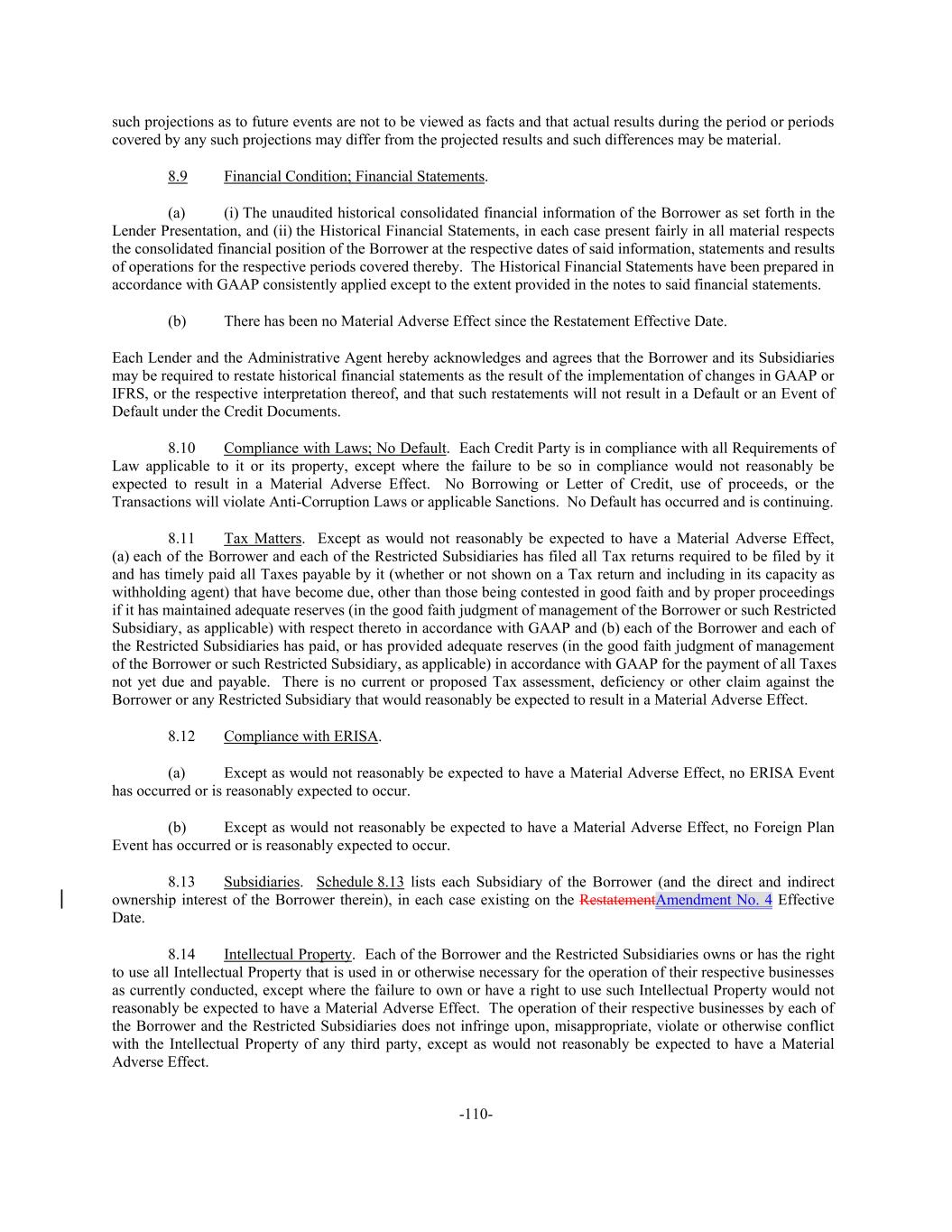 such projections as to future events are not to be viewed as facts and that actual results during the period or periods covered by any such projections may differ from the projected results and such differences may be material. 8.9 Financial Condition; Financial Statements. (a) (i) The unaudited historical consolidated financial information of the Borrower as set forth in the Lender Presentation, and (ii) the Historical Financial Statements, in each case present fairly in all material respects the consolidated financial position of the Borrower at the respective dates of said information, statements and results of operations for the respective periods covered thereby. The Historical Financial Statements have been prepared in accordance with GAAP consistently applied except to the extent provided in the notes to said financial statements. (b) There has been no Material Adverse Effect since the Restatement Effective Date. Each Lender and the Administrative Agent hereby acknowledges and agrees that the Borrower and its Subsidiaries may be required to restate historical financial statements as the result of the implementation of changes in GAAP or IFRS, or the respective interpretation thereof, and that such restatements will not result in a Default or an Event of Default under the Credit Documents. 8.10 Compliance with Laws; No Default. Each Credit Party is in compliance with all Requirements of Law applicable to it or its property, except where the failure to be so in compliance would not reasonably be expected to result in a Material Adverse Effect. No Borrowing or Letter of Credit, use of proceeds, or the Transactions will violate Anti-Corruption Laws or applicable Sanctions. No Default has occurred and is continuing. 8.11 Tax Matters. Except as would not reasonably be expected to have a Material Adverse Effect, (a) each of the Borrower and each of the Restricted Subsidiaries has filed all Tax returns required to be filed by it and has timely paid all Taxes payable by it (whether or not shown on a Tax return and including in its capacity as withholding agent) that have become due, other than those being contested in good faith and by proper proceedings if it has maintained adequate reserves (in the good faith judgment of management of the Borrower or such Restricted Subsidiary, as applicable) with respect thereto in accordance with GAAP and (b) each of the Borrower and each of the Restricted Subsidiaries has paid, or has provided adequate reserves (in the good faith judgment of management of the Borrower or such Restricted Subsidiary, as applicable) in accordance with GAAP for the payment of all Taxes not yet due and payable. There is no current or proposed Tax assessment, deficiency or other claim against the Borrower or any Restricted Subsidiary that would reasonably be expected to result in a Material Adverse Effect. 8.12 Compliance with ERISA. (a) Except as would not reasonably be expected to have a Material Adverse Effect, no ERISA Event has occurred or is reasonably expected to occur. (b) Except as would not reasonably be expected to have a Material Adverse Effect, no Foreign Plan Event has occurred or is reasonably expected to occur. 8.13 Subsidiaries. Schedule 8.13 lists each Subsidiary of the Borrower (and the direct and indirect ownership interest of the Borrower therein), in each case existing on the RestatementAmendment No. 4 Effective Date. 8.14 Intellectual Property. Each of the Borrower and the Restricted Subsidiaries owns or has the right to use all Intellectual Property that is used in or otherwise necessary for the operation of their respective businesses as currently conducted, except where the failure to own or have a right to use such Intellectual Property would not reasonably be expected to have a Material Adverse Effect. The operation of their respective businesses by each of the Borrower and the Restricted Subsidiaries does not infringe upon, misappropriate, violate or otherwise conflict with the Intellectual Property of any third party, except as would not reasonably be expected to have a Material Adverse Effect. -110-