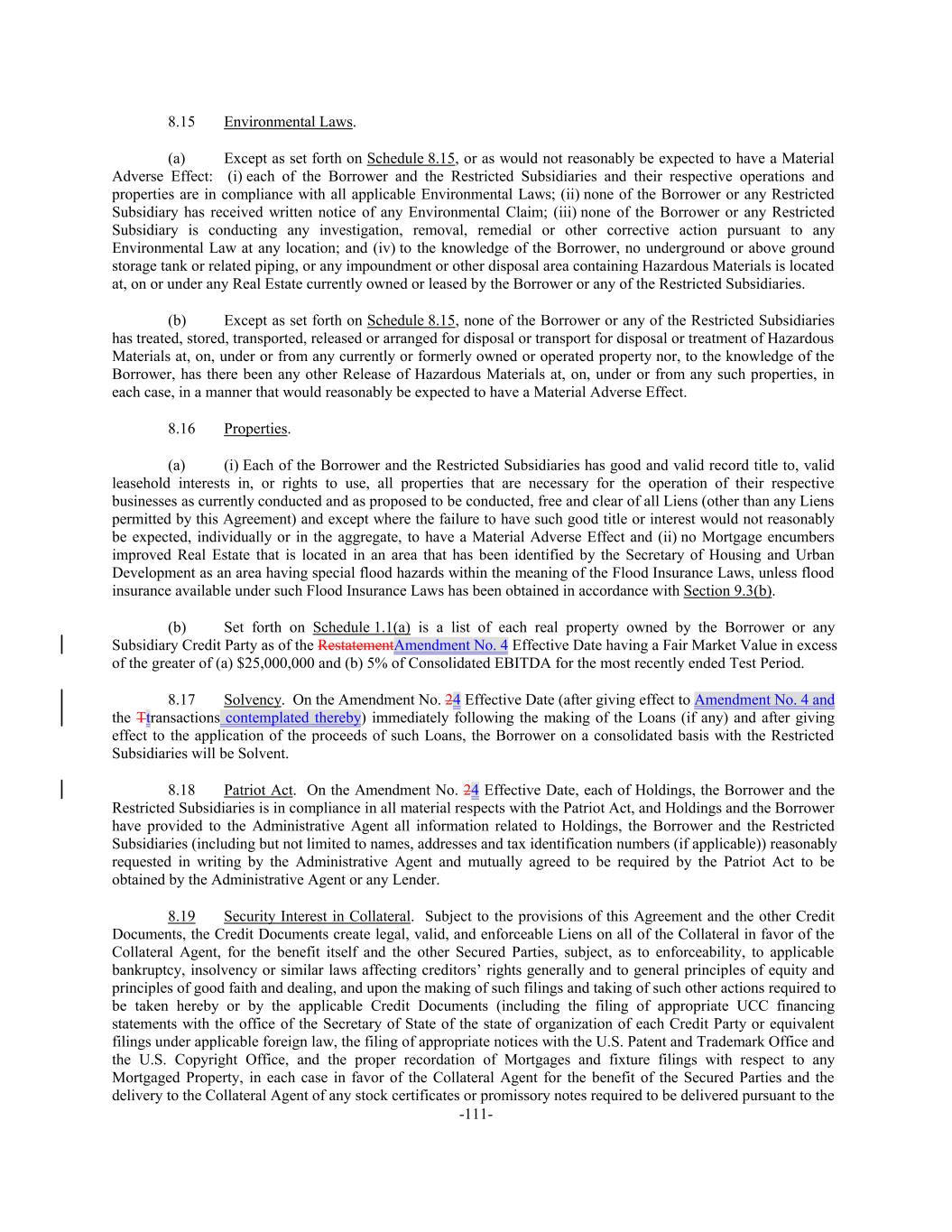 8.15 Environmental Laws. (a) Except as set forth on Schedule 8.15, or as would not reasonably be expected to have a Material Adverse Effect: (i) each of the Borrower and the Restricted Subsidiaries and their respective operations and properties are in compliance with all applicable Environmental Laws; (ii) none of the Borrower or any Restricted Subsidiary has received written notice of any Environmental Claim; (iii) none of the Borrower or any Restricted Subsidiary is conducting any investigation, removal, remedial or other corrective action pursuant to any Environmental Law at any location; and (iv) to the knowledge of the Borrower, no underground or above ground storage tank or related piping, or any impoundment or other disposal area containing Hazardous Materials is located at, on or under any Real Estate currently owned or leased by the Borrower or any of the Restricted Subsidiaries. (b) Except as set forth on Schedule 8.15, none of the Borrower or any of the Restricted Subsidiaries has treated, stored, transported, released or arranged for disposal or transport for disposal or treatment of Hazardous Materials at, on, under or from any currently or formerly owned or operated property nor, to the knowledge of the Borrower, has there been any other Release of Hazardous Materials at, on, under or from any such properties, in each case, in a manner that would reasonably be expected to have a Material Adverse Effect. 8.16 Properties. (a) (i) Each of the Borrower and the Restricted Subsidiaries has good and valid record title to, valid leasehold interests in, or rights to use, all properties that are necessary for the operation of their respective businesses as currently conducted and as proposed to be conducted, free and clear of all Liens (other than any Liens permitted by this Agreement) and except where the failure to have such good title or interest would not reasonably be expected, individually or in the aggregate, to have a Material Adverse Effect and (ii) no Mortgage encumbers improved Real Estate that is located in an area that has been identified by the Secretary of Housing and Urban Development as an area having special flood hazards within the meaning of the Flood Insurance Laws, unless flood insurance available under such Flood Insurance Laws has been obtained in accordance with Section 9.3(b). (b) Set forth on Schedule 1.1(a) is a list of each real property owned by the Borrower or any Subsidiary Credit Party as of the RestatementAmendment No. 4 Effective Date having a Fair Market Value in excess of the greater of (a) $25,000,000 and (b) 5% of Consolidated EBITDA for the most recently ended Test Period. 8.17 Solvency. On the Amendment No. 24 Effective Date (after giving effect to Amendment No. 4 and the Ttransactions contemplated thereby) immediately following the making of the Loans (if any) and after giving effect to the application of the proceeds of such Loans, the Borrower on a consolidated basis with the Restricted Subsidiaries will be Solvent. 8.18 Patriot Act. On the Amendment No. 24 Effective Date, each of Holdings, the Borrower and the Restricted Subsidiaries is in compliance in all material respects with the Patriot Act, and Holdings and the Borrower have provided to the Administrative Agent all information related to Holdings, the Borrower and the Restricted Subsidiaries (including but not limited to names, addresses and tax identification numbers (if applicable)) reasonably requested in writing by the Administrative Agent and mutually agreed to be required by the Patriot Act to be obtained by the Administrative Agent or any Lender. 8.19 Security Interest in Collateral. Subject to the provisions of this Agreement and the other Credit Documents, the Credit Documents create legal, valid, and enforceable Liens on all of the Collateral in favor of the Collateral Agent, for the benefit itself and the other Secured Parties, subject, as to enforceability, to applicable bankruptcy, insolvency or similar laws affecting creditors’ rights generally and to general principles of equity and principles of good faith and dealing, and upon the making of such filings and taking of such other actions required to be taken hereby or by the applicable Credit Documents (including the filing of appropriate UCC financing statements with the office of the Secretary of State of the state of organization of each Credit Party or equivalent filings under applicable foreign law, the filing of appropriate notices with the U.S. Patent and Trademark Office and the U.S. Copyright Office, and the proper recordation of Mortgages and fixture filings with respect to any Mortgaged Property, in each case in favor of the Collateral Agent for the benefit of the Secured Parties and the delivery to the Collateral Agent of any stock certificates or promissory notes required to be delivered pursuant to the -111-