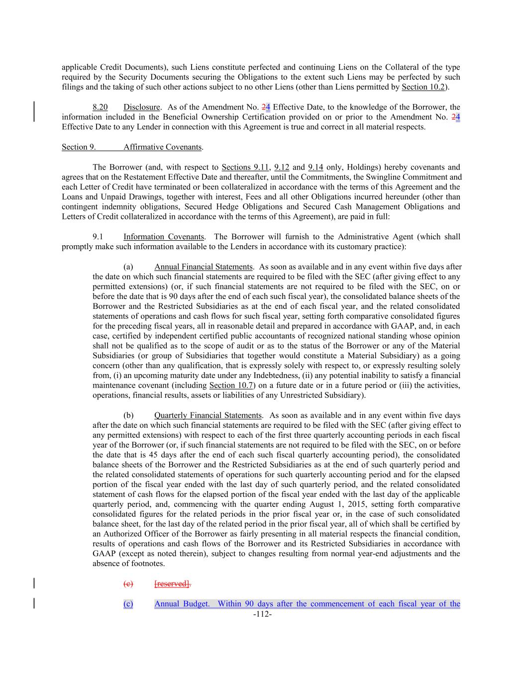 applicable Credit Documents), such Liens constitute perfected and continuing Liens on the Collateral of the type required by the Security Documents securing the Obligations to the extent such Liens may be perfected by such filings and the taking of such other actions subject to no other Liens (other than Liens permitted by Section 10.2). 8.20 Disclosure. As of the Amendment No. 24 Effective Date, to the knowledge of the Borrower, the information included in the Beneficial Ownership Certification provided on or prior to the Amendment No. 24 Effective Date to any Lender in connection with this Agreement is true and correct in all material respects. Section 9. Affirmative Covenants. The Borrower (and, with respect to Sections 9.11, 9.12 and 9.14 only, Holdings) hereby covenants and agrees that on the Restatement Effective Date and thereafter, until the Commitments, the Swingline Commitment and each Letter of Credit have terminated or been collateralized in accordance with the terms of this Agreement and the Loans and Unpaid Drawings, together with interest, Fees and all other Obligations incurred hereunder (other than contingent indemnity obligations, Secured Hedge Obligations and Secured Cash Management Obligations and Letters of Credit collateralized in accordance with the terms of this Agreement), are paid in full: 9.1 Information Covenants. The Borrower will furnish to the Administrative Agent (which shall promptly make such information available to the Lenders in accordance with its customary practice): (a) Annual Financial Statements. As soon as available and in any event within five days after the date on which such financial statements are required to be filed with the SEC (after giving effect to any permitted extensions) (or, if such financial statements are not required to be filed with the SEC, on or before the date that is 90 days after the end of each such fiscal year), the consolidated balance sheets of the Borrower and the Restricted Subsidiaries as at the end of each fiscal year, and the related consolidated statements of operations and cash flows for such fiscal year, setting forth comparative consolidated figures for the preceding fiscal years, all in reasonable detail and prepared in accordance with GAAP, and, in each case, certified by independent certified public accountants of recognized national standing whose opinion shall not be qualified as to the scope of audit or as to the status of the Borrower or any of the Material Subsidiaries (or group of Subsidiaries that together would constitute a Material Subsidiary) as a going concern (other than any qualification, that is expressly solely with respect to, or expressly resulting solely from, (i) an upcoming maturity date under any Indebtedness, (ii) any potential inability to satisfy a financial maintenance covenant (including Section 10.7) on a future date or in a future period or (iii) the activities, operations, financial results, assets or liabilities of any Unrestricted Subsidiary). (b) Quarterly Financial Statements. As soon as available and in any event within five days after the date on which such financial statements are required to be filed with the SEC (after giving effect to any permitted extensions) with respect to each of the first three quarterly accounting periods in each fiscal year of the Borrower (or, if such financial statements are not required to be filed with the SEC, on or before the date that is 45 days after the end of each such fiscal quarterly accounting period), the consolidated balance sheets of the Borrower and the Restricted Subsidiaries as at the end of such quarterly period and the related consolidated statements of operations for such quarterly accounting period and for the elapsed portion of the fiscal year ended with the last day of such quarterly period, and the related consolidated statement of cash flows for the elapsed portion of the fiscal year ended with the last day of the applicable quarterly period, and, commencing with the quarter ending August 1, 2015, setting forth comparative consolidated figures for the related periods in the prior fiscal year or, in the case of such consolidated balance sheet, for the last day of the related period in the prior fiscal year, all of which shall be certified by an Authorized Officer of the Borrower as fairly presenting in all material respects the financial condition, results of operations and cash flows of the Borrower and its Restricted Subsidiaries in accordance with GAAP (except as noted therein), subject to changes resulting from normal year-end adjustments and the absence of footnotes. (c) [reserved]. (c) Annual Budget. Within 90 days after the commencement of each fiscal year of the -112-