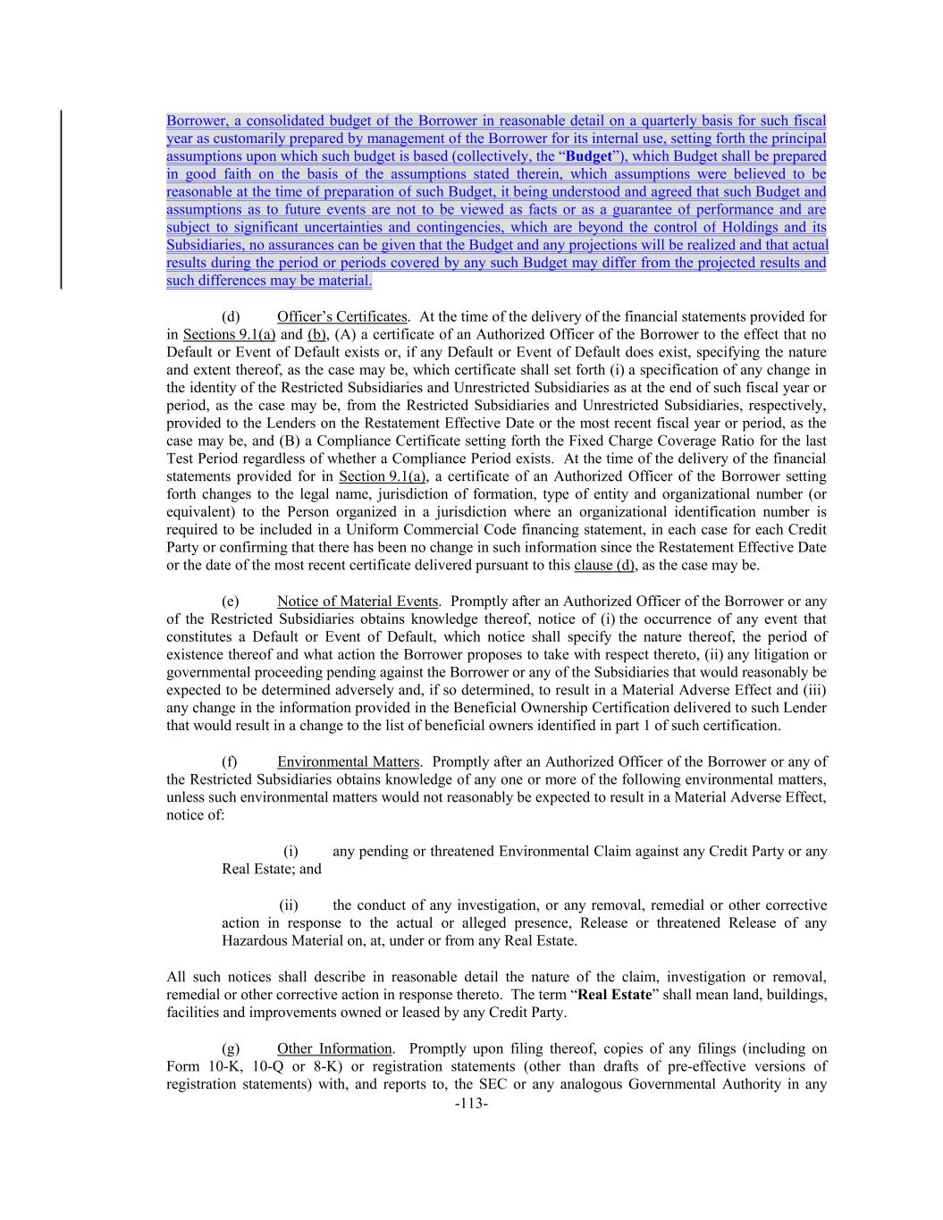 Borrower, a consolidated budget of the Borrower in reasonable detail on a quarterly basis for such fiscal year as customarily prepared by management of the Borrower for its internal use, setting forth the principal assumptions upon which such budget is based (collectively, the “Budget”), which Budget shall be prepared in good faith on the basis of the assumptions stated therein, which assumptions were believed to be reasonable at the time of preparation of such Budget, it being understood and agreed that such Budget and assumptions as to future events are not to be viewed as facts or as a guarantee of performance and are subject to significant uncertainties and contingencies, which are beyond the control of Holdings and its Subsidiaries, no assurances can be given that the Budget and any projections will be realized and that actual results during the period or periods covered by any such Budget may differ from the projected results and such differences may be material. (d) Officer’s Certificates. At the time of the delivery of the financial statements provided for in Sections 9.1(a) and (b), (A) a certificate of an Authorized Officer of the Borrower to the effect that no Default or Event of Default exists or, if any Default or Event of Default does exist, specifying the nature and extent thereof, as the case may be, which certificate shall set forth (i) a specification of any change in the identity of the Restricted Subsidiaries and Unrestricted Subsidiaries as at the end of such fiscal year or period, as the case may be, from the Restricted Subsidiaries and Unrestricted Subsidiaries, respectively, provided to the Lenders on the Restatement Effective Date or the most recent fiscal year or period, as the case may be, and (B) a Compliance Certificate setting forth the Fixed Charge Coverage Ratio for the last Test Period regardless of whether a Compliance Period exists. At the time of the delivery of the financial statements provided for in Section 9.1(a), a certificate of an Authorized Officer of the Borrower setting forth changes to the legal name, jurisdiction of formation, type of entity and organizational number (or equivalent) to the Person organized in a jurisdiction where an organizational identification number is required to be included in a Uniform Commercial Code financing statement, in each case for each Credit Party or confirming that there has been no change in such information since the Restatement Effective Date or the date of the most recent certificate delivered pursuant to this clause (d), as the case may be. (e) Notice of Material Events. Promptly after an Authorized Officer of the Borrower or any of the Restricted Subsidiaries obtains knowledge thereof, notice of (i) the occurrence of any event that constitutes a Default or Event of Default, which notice shall specify the nature thereof, the period of existence thereof and what action the Borrower proposes to take with respect thereto, (ii) any litigation or governmental proceeding pending against the Borrower or any of the Subsidiaries that would reasonably be expected to be determined adversely and, if so determined, to result in a Material Adverse Effect and (iii) any change in the information provided in the Beneficial Ownership Certification delivered to such Lender that would result in a change to the list of beneficial owners identified in part 1 of such certification. (f) Environmental Matters. Promptly after an Authorized Officer of the Borrower or any of the Restricted Subsidiaries obtains knowledge of any one or more of the following environmental matters, unless such environmental matters would not reasonably be expected to result in a Material Adverse Effect, notice of: (i) any pending or threatened Environmental Claim against any Credit Party or any Real Estate; and (ii) the conduct of any investigation, or any removal, remedial or other corrective action in response to the actual or alleged presence, Release or threatened Release of any Hazardous Material on, at, under or from any Real Estate. All such notices shall describe in reasonable detail the nature of the claim, investigation or removal, remedial or other corrective action in response thereto. The term “Real Estate” shall mean land, buildings, facilities and improvements owned or leased by any Credit Party. (g) Other Information. Promptly upon filing thereof, copies of any filings (including on Form 10-K, 10-Q or 8-K) or registration statements (other than drafts of pre-effective versions of registration statements) with, and reports to, the SEC or any analogous Governmental Authority in any -113-