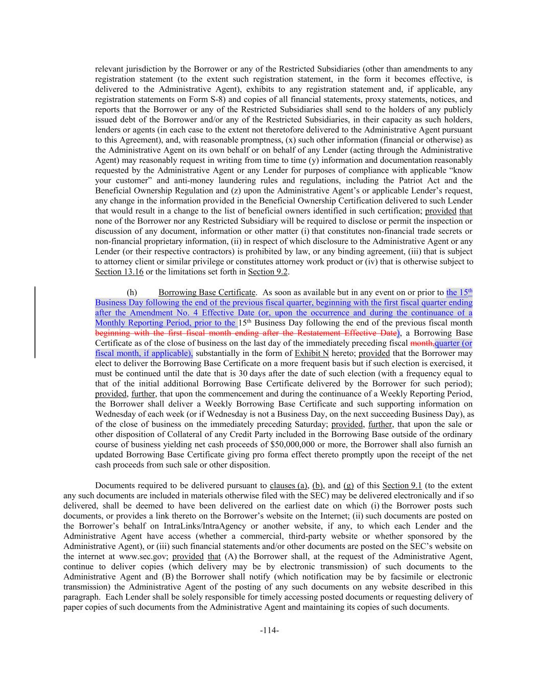 relevant jurisdiction by the Borrower or any of the Restricted Subsidiaries (other than amendments to any registration statement (to the extent such registration statement, in the form it becomes effective, is delivered to the Administrative Agent), exhibits to any registration statement and, if applicable, any registration statements on Form S-8) and copies of all financial statements, proxy statements, notices, and reports that the Borrower or any of the Restricted Subsidiaries shall send to the holders of any publicly issued debt of the Borrower and/or any of the Restricted Subsidiaries, in their capacity as such holders, lenders or agents (in each case to the extent not theretofore delivered to the Administrative Agent pursuant to this Agreement), and, with reasonable promptness, (x) such other information (financial or otherwise) as the Administrative Agent on its own behalf or on behalf of any Lender (acting through the Administrative Agent) may reasonably request in writing from time to time (y) information and documentation reasonably requested by the Administrative Agent or any Lender for purposes of compliance with applicable “know your customer” and anti-money laundering rules and regulations, including the Patriot Act and the Beneficial Ownership Regulation and (z) upon the Administrative Agent’s or applicable Lender’s request, any change in the information provided in the Beneficial Ownership Certification delivered to such Lender that would result in a change to the list of beneficial owners identified in such certification; provided that none of the Borrower nor any Restricted Subsidiary will be required to disclose or permit the inspection or discussion of any document, information or other matter (i) that constitutes non-financial trade secrets or non-financial proprietary information, (ii) in respect of which disclosure to the Administrative Agent or any Lender (or their respective contractors) is prohibited by law, or any binding agreement, (iii) that is subject to attorney client or similar privilege or constitutes attorney work product or (iv) that is otherwise subject to Section 13.16 or the limitations set forth in Section 9.2. (h) Borrowing Base Certificate. As soon as available but in any event on or prior to the 15th Business Day following the end of the previous fiscal quarter, beginning with the first fiscal quarter ending after the Amendment No. 4 Effective Date (or, upon the occurrence and during the continuance of a Monthly Reporting Period, prior to the 15th Business Day following the end of the previous fiscal month beginning with the first fiscal month ending after the Restatement Effective Date), a Borrowing Base Certificate as of the close of business on the last day of the immediately preceding fiscal month,quarter (or fiscal month, if applicable), substantially in the form of Exhibit N hereto; provided that the Borrower may elect to deliver the Borrowing Base Certificate on a more frequent basis but if such election is exercised, it must be continued until the date that is 30 days after the date of such election (with a frequency equal to that of the initial additional Borrowing Base Certificate delivered by the Borrower for such period); provided, further, that upon the commencement and during the continuance of a Weekly Reporting Period, the Borrower shall deliver a Weekly Borrowing Base Certificate and such supporting information on Wednesday of each week (or if Wednesday is not a Business Day, on the next succeeding Business Day), as of the close of business on the immediately preceding Saturday; provided, further, that upon the sale or other disposition of Collateral of any Credit Party included in the Borrowing Base outside of the ordinary course of business yielding net cash proceeds of $50,000,000 or more, the Borrower shall also furnish an updated Borrowing Base Certificate giving pro forma effect thereto promptly upon the receipt of the net cash proceeds from such sale or other disposition. Documents required to be delivered pursuant to clauses (a), (b), and (g) of this Section 9.1 (to the extent any such documents are included in materials otherwise filed with the SEC) may be delivered electronically and if so delivered, shall be deemed to have been delivered on the earliest date on which (i) the Borrower posts such documents, or provides a link thereto on the Borrower’s website on the Internet; (ii) such documents are posted on the Borrower’s behalf on IntraLinks/IntraAgency or another website, if any, to which each Lender and the Administrative Agent have access (whether a commercial, third-party website or whether sponsored by the Administrative Agent), or (iii) such financial statements and/or other documents are posted on the SEC’s website on the internet at www.sec.gov; provided that (A) the Borrower shall, at the request of the Administrative Agent, continue to deliver copies (which delivery may be by electronic transmission) of such documents to the Administrative Agent and (B) the Borrower shall notify (which notification may be by facsimile or electronic transmission) the Administrative Agent of the posting of any such documents on any website described in this paragraph. Each Lender shall be solely responsible for timely accessing posted documents or requesting delivery of paper copies of such documents from the Administrative Agent and maintaining its copies of such documents. -114-