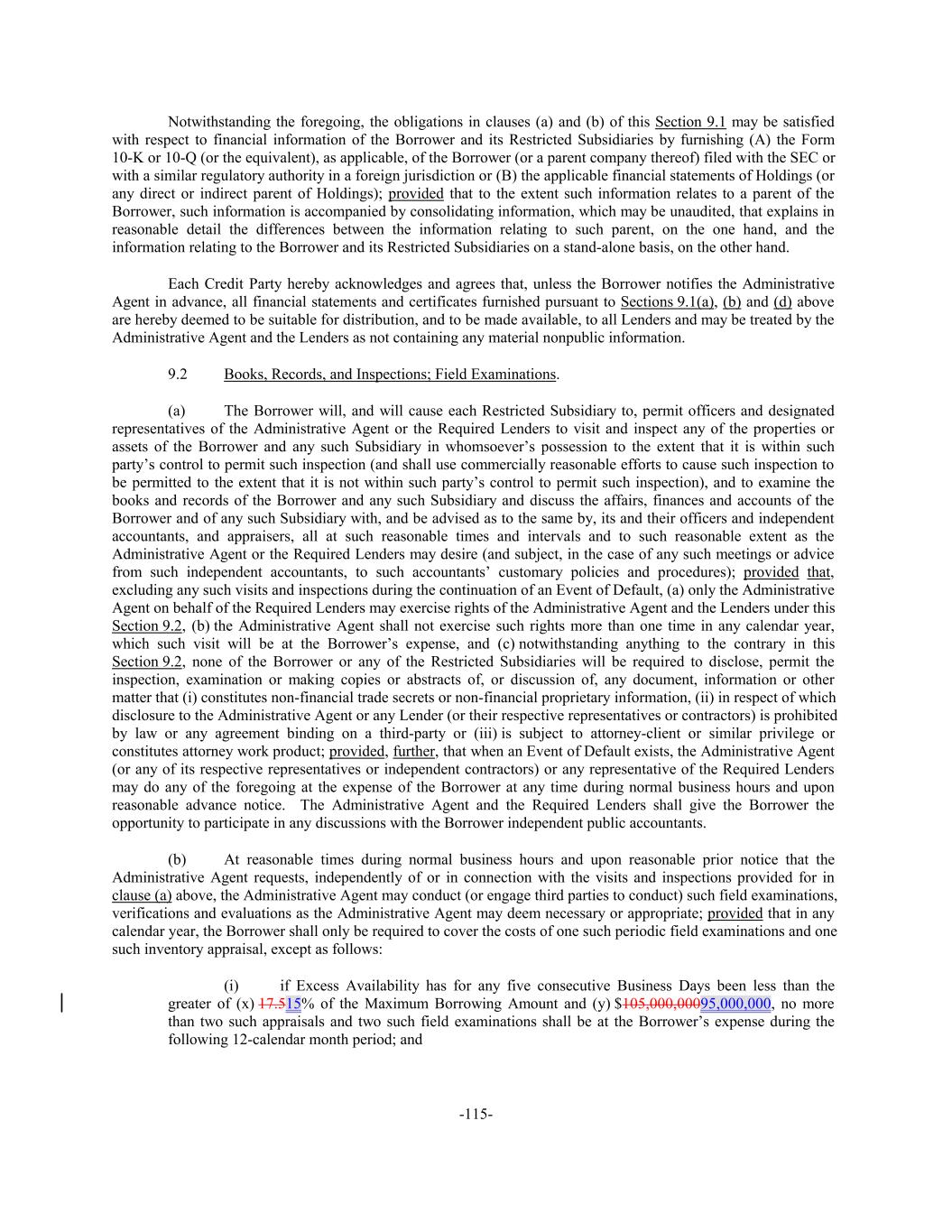 Notwithstanding the foregoing, the obligations in clauses (a) and (b) of this Section 9.1 may be satisfied with respect to financial information of the Borrower and its Restricted Subsidiaries by furnishing (A) the Form 10-K or 10-Q (or the equivalent), as applicable, of the Borrower (or a parent company thereof) filed with the SEC or with a similar regulatory authority in a foreign jurisdiction or (B) the applicable financial statements of Holdings (or any direct or indirect parent of Holdings); provided that to the extent such information relates to a parent of the Borrower, such information is accompanied by consolidating information, which may be unaudited, that explains in reasonable detail the differences between the information relating to such parent, on the one hand, and the information relating to the Borrower and its Restricted Subsidiaries on a stand-alone basis, on the other hand. Each Credit Party hereby acknowledges and agrees that, unless the Borrower notifies the Administrative Agent in advance, all financial statements and certificates furnished pursuant to Sections 9.1(a), (b) and (d) above are hereby deemed to be suitable for distribution, and to be made available, to all Lenders and may be treated by the Administrative Agent and the Lenders as not containing any material nonpublic information. 9.2 Books, Records, and Inspections; Field Examinations. (a) The Borrower will, and will cause each Restricted Subsidiary to, permit officers and designated representatives of the Administrative Agent or the Required Lenders to visit and inspect any of the properties or assets of the Borrower and any such Subsidiary in whomsoever’s possession to the extent that it is within such party’s control to permit such inspection (and shall use commercially reasonable efforts to cause such inspection to be permitted to the extent that it is not within such party’s control to permit such inspection), and to examine the books and records of the Borrower and any such Subsidiary and discuss the affairs, finances and accounts of the Borrower and of any such Subsidiary with, and be advised as to the same by, its and their officers and independent accountants, and appraisers, all at such reasonable times and intervals and to such reasonable extent as the Administrative Agent or the Required Lenders may desire (and subject, in the case of any such meetings or advice from such independent accountants, to such accountants’ customary policies and procedures); provided that, excluding any such visits and inspections during the continuation of an Event of Default, (a) only the Administrative Agent on behalf of the Required Lenders may exercise rights of the Administrative Agent and the Lenders under this Section 9.2, (b) the Administrative Agent shall not exercise such rights more than one time in any calendar year, which such visit will be at the Borrower’s expense, and (c) notwithstanding anything to the contrary in this Section 9.2, none of the Borrower or any of the Restricted Subsidiaries will be required to disclose, permit the inspection, examination or making copies or abstracts of, or discussion of, any document, information or other matter that (i) constitutes non-financial trade secrets or non-financial proprietary information, (ii) in respect of which disclosure to the Administrative Agent or any Lender (or their respective representatives or contractors) is prohibited by law or any agreement binding on a third-party or (iii) is subject to attorney-client or similar privilege or constitutes attorney work product; provided, further, that when an Event of Default exists, the Administrative Agent (or any of its respective representatives or independent contractors) or any representative of the Required Lenders may do any of the foregoing at the expense of the Borrower at any time during normal business hours and upon reasonable advance notice. The Administrative Agent and the Required Lenders shall give the Borrower the opportunity to participate in any discussions with the Borrower independent public accountants. (b) At reasonable times during normal business hours and upon reasonable prior notice that the Administrative Agent requests, independently of or in connection with the visits and inspections provided for in clause (a) above, the Administrative Agent may conduct (or engage third parties to conduct) such field examinations, verifications and evaluations as the Administrative Agent may deem necessary or appropriate; provided that in any calendar year, the Borrower shall only be required to cover the costs of one such periodic field examinations and one such inventory appraisal, except as follows: (i) if Excess Availability has for any five consecutive Business Days been less than the greater of (x) 17.515% of the Maximum Borrowing Amount and (y) $105,000,00095,000,000, no more than two such appraisals and two such field examinations shall be at the Borrower’s expense during the following 12-calendar month period; and -115-