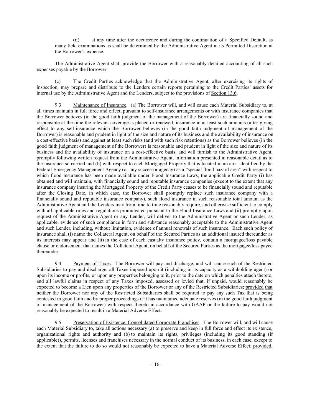 (ii) at any time after the occurrence and during the continuation of a Specified Default, as many field examinations as shall be determined by the Administrative Agent in its Permitted Discretion at the Borrower’s expense. The Administrative Agent shall provide the Borrower with a reasonably detailed accounting of all such expenses payable by the Borrower. (c) The Credit Parties acknowledge that the Administrative Agent, after exercising its rights of inspection, may prepare and distribute to the Lenders certain reports pertaining to the Credit Parties’ assets for internal use by the Administrative Agent and the Lenders, subject to the provisions of Section 13.6. 9.3 Maintenance of Insurance. (a) The Borrower will, and will cause each Material Subsidiary to, at all times maintain in full force and effect, pursuant to self-insurance arrangements or with insurance companies that the Borrower believes (in the good faith judgment of the management of the Borrower) are financially sound and responsible at the time the relevant coverage is placed or renewed, insurance in at least such amounts (after giving effect to any self-insurance which the Borrower believes (in the good faith judgment of management of the Borrower) is reasonable and prudent in light of the size and nature of its business and the availability of insurance on a cost-effective basis) and against at least such risks (and with such risk retentions) as the Borrower believes (in the good faith judgment of management of the Borrower) is reasonable and prudent in light of the size and nature of its business and the availability of insurance on a cost-effective basis; and will furnish to the Administrative Agent, promptly following written request from the Administrative Agent, information presented in reasonable detail as to the insurance so carried and (b) with respect to each Mortgaged Property that is located in an area identified by the Federal Emergency Management Agency (or any successor agency) as a “special flood hazard area” with respect to which flood insurance has been made available under Flood Insurance Laws, the applicable Credit Party (i) has obtained and will maintain, with financially sound and reputable insurance companies (except to the extent that any insurance company insuring the Mortgaged Property of the Credit Party ceases to be financially sound and reputable after the Closing Date, in which case, the Borrower shall promptly replace such insurance company with a financially sound and reputable insurance company), such flood insurance in such reasonable total amount as the Administrative Agent and the Lenders may from time to time reasonably require, and otherwise sufficient to comply with all applicable rules and regulations promulgated pursuant to the Flood Insurance Laws and (ii) promptly upon request of the Administrative Agent or any Lender, will deliver to the Administrative Agent or such Lender, as applicable, evidence of such compliance in form and substance reasonably acceptable to the Administrative Agent and such Lender, including, without limitation, evidence of annual renewals of such insurance. Each such policy of insurance shall (i) name the Collateral Agent, on behalf of the Secured Parties as an additional insured thereunder as its interests may appear and (ii) in the case of each casualty insurance policy, contain a mortgagee/loss payable clause or endorsement that names the Collateral Agent, on behalf of the Secured Parties as the mortgagee/loss payee thereunder. 9.4 Payment of Taxes. The Borrower will pay and discharge, and will cause each of the Restricted Subsidiaries to pay and discharge, all Taxes imposed upon it (including in its capacity as a withholding agent) or upon its income or profits, or upon any properties belonging to it, prior to the date on which penalties attach thereto, and all lawful claims in respect of any Taxes imposed, assessed or levied that, if unpaid, would reasonably be expected to become a Lien upon any properties of the Borrower or any of the Restricted Subsidiaries; provided that neither the Borrower nor any of the Restricted Subsidiaries shall be required to pay any such Tax that is being contested in good faith and by proper proceedings if it has maintained adequate reserves (in the good faith judgment of management of the Borrower) with respect thereto in accordance with GAAP or the failure to pay would not reasonably be expected to result in a Material Adverse Effect. 9.5 Preservation of Existence; Consolidated Corporate Franchises. The Borrower will, and will cause each Material Subsidiary to, take all actions necessary (a) to preserve and keep in full force and effect its existence, organizational rights and authority and (b) to maintain its rights, privileges (including its good standing (if applicable)), permits, licenses and franchises necessary in the normal conduct of its business, in each case, except to the extent that the failure to do so would not reasonably be expected to have a Material Adverse Effect; provided, -116-
