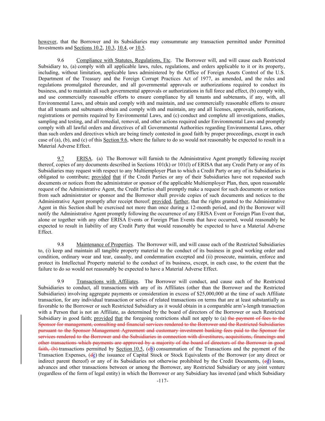 however, that the Borrower and its Subsidiaries may consummate any transaction permitted under Permitted Investments and Sections 10.2, 10.3, 10.4, or 10.5. 9.6 Compliance with Statutes, Regulations, Etc. The Borrower will, and will cause each Restricted Subsidiary to, (a) comply with all applicable laws, rules, regulations, and orders applicable to it or its property, including, without limitation, applicable laws administered by the Office of Foreign Assets Control of the U.S. Department of the Treasury and the Foreign Corrupt Practices Act of 1977, as amended, and the rules and regulations promulgated thereunder, and all governmental approvals or authorizations required to conduct its business, and to maintain all such governmental approvals or authorizations in full force and effect, (b) comply with, and use commercially reasonable efforts to ensure compliance by all tenants and subtenants, if any, with, all Environmental Laws, and obtain and comply with and maintain, and use commercially reasonable efforts to ensure that all tenants and subtenants obtain and comply with and maintain, any and all licenses, approvals, notifications, registrations or permits required by Environmental Laws, and (c) conduct and complete all investigations, studies, sampling and testing, and all remedial, removal, and other actions required under Environmental Laws and promptly comply with all lawful orders and directives of all Governmental Authorities regarding Environmental Laws, other than such orders and directives which are being timely contested in good faith by proper proceedings, except in each case of (a), (b), and (c) of this Section 9.6, where the failure to do so would not reasonably be expected to result in a Material Adverse Effect. 9.7 ERISA. (a) The Borrower will furnish to the Administrative Agent promptly following receipt thereof, copies of any documents described in Sections 101(k) or 101(l) of ERISA that any Credit Party or any of its Subsidiaries may request with respect to any Multiemployer Plan to which a Credit Party or any of its Subsidiaries is obligated to contribute; provided that if the Credit Parties or any of their Subsidiaries have not requested such documents or notices from the administrator or sponsor of the applicable Multiemployer Plan, then, upon reasonable request of the Administrative Agent, the Credit Parties shall promptly make a request for such documents or notices from such administrator or sponsor and the Borrower shall provide copies of such documents and notices to the Administrative Agent promptly after receipt thereof; provided, further, that the rights granted to the Administrative Agent in this Section shall be exercised not more than once during a 12-month period, and (b) the Borrower will notify the Administrative Agent promptly following the occurrence of any ERISA Event or Foreign Plan Event that, alone or together with any other ERISA Events or Foreign Plan Events that have occurred, would reasonably be expected to result in liability of any Credit Party that would reasonably be expected to have a Material Adverse Effect. 9.8 Maintenance of Properties. The Borrower will, and will cause each of the Restricted Subsidiaries to, (i) keep and maintain all tangible property material to the conduct of its business in good working order and condition, ordinary wear and tear, casualty, and condemnation excepted and (ii) prosecute, maintain, enforce and protect its Intellectual Property material to the conduct of its business, except, in each case, to the extent that the failure to do so would not reasonably be expected to have a Material Adverse Effect. 9.9 Transactions with Affiliates. The Borrower will conduct, and cause each of the Restricted Subsidiaries to conduct, all transactions with any of its Affiliates (other than the Borrower and the Restricted Subsidiaries) involving aggregate payments or consideration in excess of $25,000,000 at the time of such Affiliate transaction, for any individual transaction or series of related transactions on terms that are at least substantially as favorable to the Borrower or such Restricted Subsidiary as it would obtain in a comparable arm’s-length transaction with a Person that is not an Affiliate, as determined by the board of directors of the Borrower or such Restricted Subsidiary in good faith; provided that the foregoing restrictions shall not apply to (a) the payment of fees to the Sponsor for management, consulting and financial services rendered to the Borrower and the Restricted Subsidiaries pursuant to the Sponsor Management Agreement and customary investment banking fees paid to the Sponsor for services rendered to the Borrower and the Subsidiaries in connection with divestitures, acquisitions, financings and other transactions which payments are approved by a majority of the board of directors of the Borrower in good faith, (b) transactions permitted by Section 10.5, (cb) consummation of the Transactions and the payment of the Transaction Expenses, (dc) the issuance of Capital Stock or Stock Equivalents of the Borrower (or any direct or indirect parent thereof) or any of its Subsidiaries not otherwise prohibited by the Credit Documents, (ed) loans, advances and other transactions between or among the Borrower, any Restricted Subsidiary or any joint venture (regardless of the form of legal entity) in which the Borrower or any Subsidiary has invested (and which Subsidiary -117-