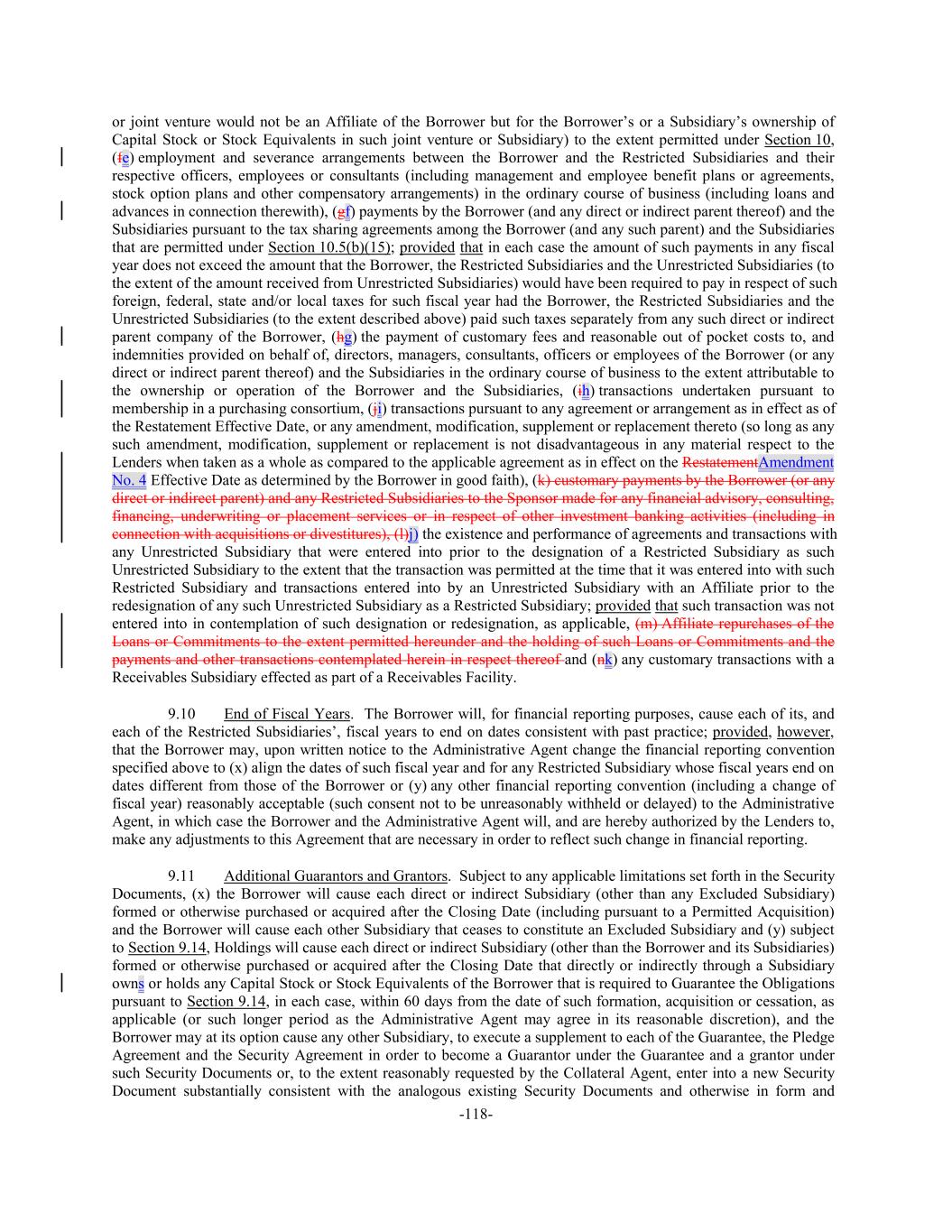 or joint venture would not be an Affiliate of the Borrower but for the Borrower’s or a Subsidiary’s ownership of Capital Stock or Stock Equivalents in such joint venture or Subsidiary) to the extent permitted under Section 10, (fe) employment and severance arrangements between the Borrower and the Restricted Subsidiaries and their respective officers, employees or consultants (including management and employee benefit plans or agreements, stock option plans and other compensatory arrangements) in the ordinary course of business (including loans and advances in connection therewith), (gf) payments by the Borrower (and any direct or indirect parent thereof) and the Subsidiaries pursuant to the tax sharing agreements among the Borrower (and any such parent) and the Subsidiaries that are permitted under Section 10.5(b)(15); provided that in each case the amount of such payments in any fiscal year does not exceed the amount that the Borrower, the Restricted Subsidiaries and the Unrestricted Subsidiaries (to the extent of the amount received from Unrestricted Subsidiaries) would have been required to pay in respect of such foreign, federal, state and/or local taxes for such fiscal year had the Borrower, the Restricted Subsidiaries and the Unrestricted Subsidiaries (to the extent described above) paid such taxes separately from any such direct or indirect parent company of the Borrower, (hg) the payment of customary fees and reasonable out of pocket costs to, and indemnities provided on behalf of, directors, managers, consultants, officers or employees of the Borrower (or any direct or indirect parent thereof) and the Subsidiaries in the ordinary course of business to the extent attributable to the ownership or operation of the Borrower and the Subsidiaries, (ih) transactions undertaken pursuant to membership in a purchasing consortium, (ji) transactions pursuant to any agreement or arrangement as in effect as of the Restatement Effective Date, or any amendment, modification, supplement or replacement thereto (so long as any such amendment, modification, supplement or replacement is not disadvantageous in any material respect to the Lenders when taken as a whole as compared to the applicable agreement as in effect on the RestatementAmendment No. 4 Effective Date as determined by the Borrower in good faith), (k) customary payments by the Borrower (or any direct or indirect parent) and any Restricted Subsidiaries to the Sponsor made for any financial advisory, consulting, financing, underwriting or placement services or in respect of other investment banking activities (including in connection with acquisitions or divestitures), (l)j) the existence and performance of agreements and transactions with any Unrestricted Subsidiary that were entered into prior to the designation of a Restricted Subsidiary as such Unrestricted Subsidiary to the extent that the transaction was permitted at the time that it was entered into with such Restricted Subsidiary and transactions entered into by an Unrestricted Subsidiary with an Affiliate prior to the redesignation of any such Unrestricted Subsidiary as a Restricted Subsidiary; provided that such transaction was not entered into in contemplation of such designation or redesignation, as applicable, (m) Affiliate repurchases of the Loans or Commitments to the extent permitted hereunder and the holding of such Loans or Commitments and the payments and other transactions contemplated herein in respect thereof and (nk) any customary transactions with a Receivables Subsidiary effected as part of a Receivables Facility. 9.10 End of Fiscal Years. The Borrower will, for financial reporting purposes, cause each of its, and each of the Restricted Subsidiaries’, fiscal years to end on dates consistent with past practice; provided, however, that the Borrower may, upon written notice to the Administrative Agent change the financial reporting convention specified above to (x) align the dates of such fiscal year and for any Restricted Subsidiary whose fiscal years end on dates different from those of the Borrower or (y) any other financial reporting convention (including a change of fiscal year) reasonably acceptable (such consent not to be unreasonably withheld or delayed) to the Administrative Agent, in which case the Borrower and the Administrative Agent will, and are hereby authorized by the Lenders to, make any adjustments to this Agreement that are necessary in order to reflect such change in financial reporting. 9.11 Additional Guarantors and Grantors. Subject to any applicable limitations set forth in the Security Documents, (x) the Borrower will cause each direct or indirect Subsidiary (other than any Excluded Subsidiary) formed or otherwise purchased or acquired after the Closing Date (including pursuant to a Permitted Acquisition) and the Borrower will cause each other Subsidiary that ceases to constitute an Excluded Subsidiary and (y) subject to Section 9.14, Holdings will cause each direct or indirect Subsidiary (other than the Borrower and its Subsidiaries) formed or otherwise purchased or acquired after the Closing Date that directly or indirectly through a Subsidiary owns or holds any Capital Stock or Stock Equivalents of the Borrower that is required to Guarantee the Obligations pursuant to Section 9.14, in each case, within 60 days from the date of such formation, acquisition or cessation, as applicable (or such longer period as the Administrative Agent may agree in its reasonable discretion), and the Borrower may at its option cause any other Subsidiary, to execute a supplement to each of the Guarantee, the Pledge Agreement and the Security Agreement in order to become a Guarantor under the Guarantee and a grantor under such Security Documents or, to the extent reasonably requested by the Collateral Agent, enter into a new Security Document substantially consistent with the analogous existing Security Documents and otherwise in form and -118-