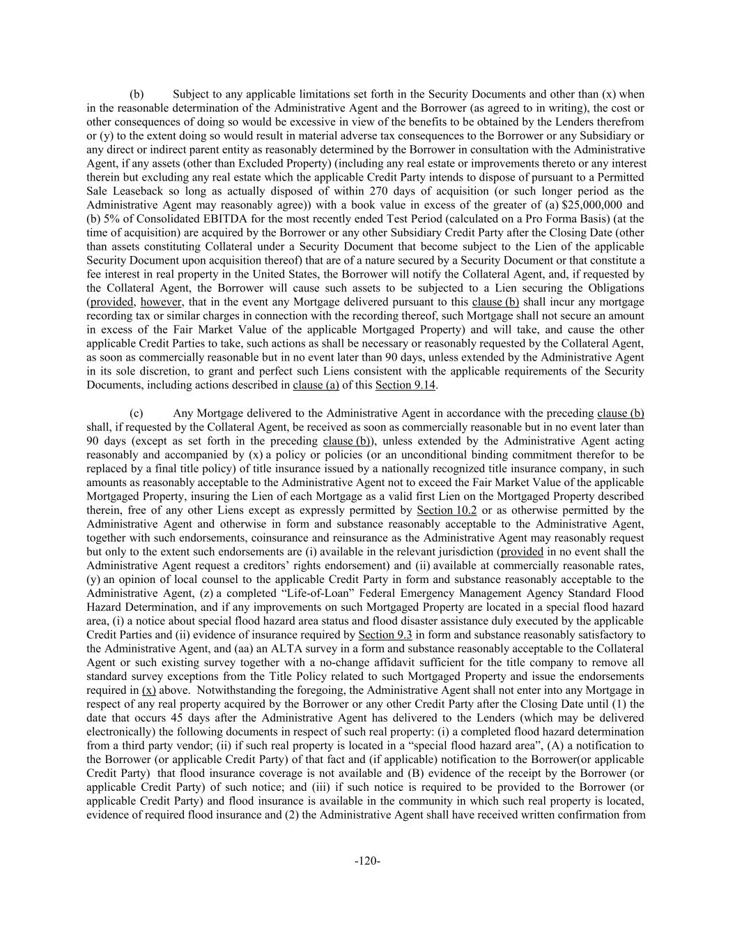 (b) Subject to any applicable limitations set forth in the Security Documents and other than (x) when in the reasonable determination of the Administrative Agent and the Borrower (as agreed to in writing), the cost or other consequences of doing so would be excessive in view of the benefits to be obtained by the Lenders therefrom or (y) to the extent doing so would result in material adverse tax consequences to the Borrower or any Subsidiary or any direct or indirect parent entity as reasonably determined by the Borrower in consultation with the Administrative Agent, if any assets (other than Excluded Property) (including any real estate or improvements thereto or any interest therein but excluding any real estate which the applicable Credit Party intends to dispose of pursuant to a Permitted Sale Leaseback so long as actually disposed of within 270 days of acquisition (or such longer period as the Administrative Agent may reasonably agree)) with a book value in excess of the greater of (a) $25,000,000 and (b) 5% of Consolidated EBITDA for the most recently ended Test Period (calculated on a Pro Forma Basis) (at the time of acquisition) are acquired by the Borrower or any other Subsidiary Credit Party after the Closing Date (other than assets constituting Collateral under a Security Document that become subject to the Lien of the applicable Security Document upon acquisition thereof) that are of a nature secured by a Security Document or that constitute a fee interest in real property in the United States, the Borrower will notify the Collateral Agent, and, if requested by the Collateral Agent, the Borrower will cause such assets to be subjected to a Lien securing the Obligations (provided, however, that in the event any Mortgage delivered pursuant to this clause (b) shall incur any mortgage recording tax or similar charges in connection with the recording thereof, such Mortgage shall not secure an amount in excess of the Fair Market Value of the applicable Mortgaged Property) and will take, and cause the other applicable Credit Parties to take, such actions as shall be necessary or reasonably requested by the Collateral Agent, as soon as commercially reasonable but in no event later than 90 days, unless extended by the Administrative Agent in its sole discretion, to grant and perfect such Liens consistent with the applicable requirements of the Security Documents, including actions described in clause (a) of this Section 9.14. (c) Any Mortgage delivered to the Administrative Agent in accordance with the preceding clause (b) shall, if requested by the Collateral Agent, be received as soon as commercially reasonable but in no event later than 90 days (except as set forth in the preceding clause (b)), unless extended by the Administrative Agent acting reasonably and accompanied by (x) a policy or policies (or an unconditional binding commitment therefor to be replaced by a final title policy) of title insurance issued by a nationally recognized title insurance company, in such amounts as reasonably acceptable to the Administrative Agent not to exceed the Fair Market Value of the applicable Mortgaged Property, insuring the Lien of each Mortgage as a valid first Lien on the Mortgaged Property described therein, free of any other Liens except as expressly permitted by Section 10.2 or as otherwise permitted by the Administrative Agent and otherwise in form and substance reasonably acceptable to the Administrative Agent, together with such endorsements, coinsurance and reinsurance as the Administrative Agent may reasonably request but only to the extent such endorsements are (i) available in the relevant jurisdiction (provided in no event shall the Administrative Agent request a creditors’ rights endorsement) and (ii) available at commercially reasonable rates, (y) an opinion of local counsel to the applicable Credit Party in form and substance reasonably acceptable to the Administrative Agent, (z) a completed “Life-of-Loan” Federal Emergency Management Agency Standard Flood Hazard Determination, and if any improvements on such Mortgaged Property are located in a special flood hazard area, (i) a notice about special flood hazard area status and flood disaster assistance duly executed by the applicable Credit Parties and (ii) evidence of insurance required by Section 9.3 in form and substance reasonably satisfactory to the Administrative Agent, and (aa) an ALTA survey in a form and substance reasonably acceptable to the Collateral Agent or such existing survey together with a no-change affidavit sufficient for the title company to remove all standard survey exceptions from the Title Policy related to such Mortgaged Property and issue the endorsements required in (x) above. Notwithstanding the foregoing, the Administrative Agent shall not enter into any Mortgage in respect of any real property acquired by the Borrower or any other Credit Party after the Closing Date until (1) the date that occurs 45 days after the Administrative Agent has delivered to the Lenders (which may be delivered electronically) the following documents in respect of such real property: (i) a completed flood hazard determination from a third party vendor; (ii) if such real property is located in a “special flood hazard area”, (A) a notification to the Borrower (or applicable Credit Party) of that fact and (if applicable) notification to the Borrower(or applicable Credit Party) that flood insurance coverage is not available and (B) evidence of the receipt by the Borrower (or applicable Credit Party) of such notice; and (iii) if such notice is required to be provided to the Borrower (or applicable Credit Party) and flood insurance is available in the community in which such real property is located, evidence of required flood insurance and (2) the Administrative Agent shall have received written confirmation from -120-