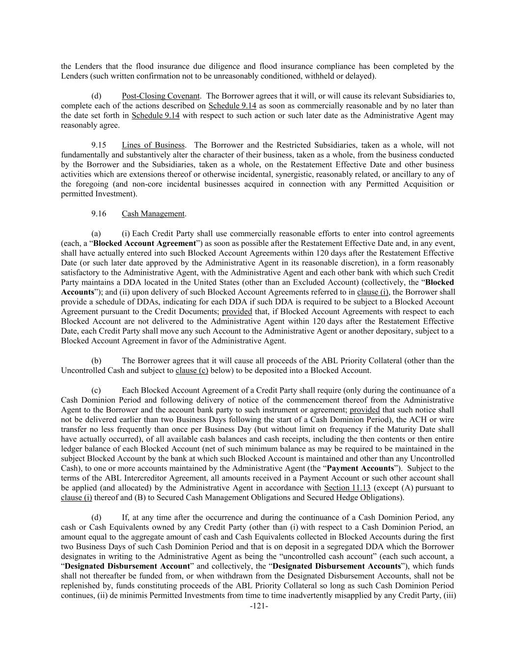 the Lenders that the flood insurance due diligence and flood insurance compliance has been completed by the Lenders (such written confirmation not to be unreasonably conditioned, withheld or delayed). (d) Post-Closing Covenant. The Borrower agrees that it will, or will cause its relevant Subsidiaries to, complete each of the actions described on Schedule 9.14 as soon as commercially reasonable and by no later than the date set forth in Schedule 9.14 with respect to such action or such later date as the Administrative Agent may reasonably agree. 9.15 Lines of Business. The Borrower and the Restricted Subsidiaries, taken as a whole, will not fundamentally and substantively alter the character of their business, taken as a whole, from the business conducted by the Borrower and the Subsidiaries, taken as a whole, on the Restatement Effective Date and other business activities which are extensions thereof or otherwise incidental, synergistic, reasonably related, or ancillary to any of the foregoing (and non-core incidental businesses acquired in connection with any Permitted Acquisition or permitted Investment). 9.16 Cash Management. (a) (i) Each Credit Party shall use commercially reasonable efforts to enter into control agreements (each, a “Blocked Account Agreement”) as soon as possible after the Restatement Effective Date and, in any event, shall have actually entered into such Blocked Account Agreements within 120 days after the Restatement Effective Date (or such later date approved by the Administrative Agent in its reasonable discretion), in a form reasonably satisfactory to the Administrative Agent, with the Administrative Agent and each other bank with which such Credit Party maintains a DDA located in the United States (other than an Excluded Account) (collectively, the “Blocked Accounts”); and (ii) upon delivery of such Blocked Account Agreements referred to in clause (i), the Borrower shall provide a schedule of DDAs, indicating for each DDA if such DDA is required to be subject to a Blocked Account Agreement pursuant to the Credit Documents; provided that, if Blocked Account Agreements with respect to each Blocked Account are not delivered to the Administrative Agent within 120 days after the Restatement Effective Date, each Credit Party shall move any such Account to the Administrative Agent or another depositary, subject to a Blocked Account Agreement in favor of the Administrative Agent. (b) The Borrower agrees that it will cause all proceeds of the ABL Priority Collateral (other than the Uncontrolled Cash and subject to clause (c) below) to be deposited into a Blocked Account. (c) Each Blocked Account Agreement of a Credit Party shall require (only during the continuance of a Cash Dominion Period and following delivery of notice of the commencement thereof from the Administrative Agent to the Borrower and the account bank party to such instrument or agreement; provided that such notice shall not be delivered earlier than two Business Days following the start of a Cash Dominion Period), the ACH or wire transfer no less frequently than once per Business Day (but without limit on frequency if the Maturity Date shall have actually occurred), of all available cash balances and cash receipts, including the then contents or then entire ledger balance of each Blocked Account (net of such minimum balance as may be required to be maintained in the subject Blocked Account by the bank at which such Blocked Account is maintained and other than any Uncontrolled Cash), to one or more accounts maintained by the Administrative Agent (the “Payment Accounts”). Subject to the terms of the ABL Intercreditor Agreement, all amounts received in a Payment Account or such other account shall be applied (and allocated) by the Administrative Agent in accordance with Section 11.13 (except (A) pursuant to clause (i) thereof and (B) to Secured Cash Management Obligations and Secured Hedge Obligations). (d) If, at any time after the occurrence and during the continuance of a Cash Dominion Period, any cash or Cash Equivalents owned by any Credit Party (other than (i) with respect to a Cash Dominion Period, an amount equal to the aggregate amount of cash and Cash Equivalents collected in Blocked Accounts during the first two Business Days of such Cash Dominion Period and that is on deposit in a segregated DDA which the Borrower designates in writing to the Administrative Agent as being the “uncontrolled cash account” (each such account, a “Designated Disbursement Account” and collectively, the “Designated Disbursement Accounts”), which funds shall not thereafter be funded from, or when withdrawn from the Designated Disbursement Accounts, shall not be replenished by, funds constituting proceeds of the ABL Priority Collateral so long as such Cash Dominion Period continues, (ii) de minimis Permitted Investments from time to time inadvertently misapplied by any Credit Party, (iii) -121-