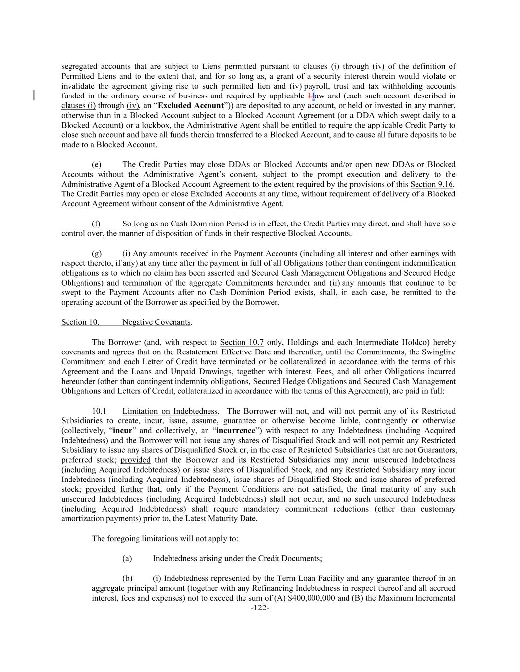 segregated accounts that are subject to Liens permitted pursuant to clauses (i) through (iv) of the definition of Permitted Liens and to the extent that, and for so long as, a grant of a security interest therein would violate or invalidate the agreement giving rise to such permitted lien and (iv) payroll, trust and tax withholding accounts funded in the ordinary course of business and required by applicable Llaw and (each such account described in clauses (i) through (iv), an “Excluded Account”)) are deposited to any account, or held or invested in any manner, otherwise than in a Blocked Account subject to a Blocked Account Agreement (or a DDA which swept daily to a Blocked Account) or a lockbox, the Administrative Agent shall be entitled to require the applicable Credit Party to close such account and have all funds therein transferred to a Blocked Account, and to cause all future deposits to be made to a Blocked Account. (e) The Credit Parties may close DDAs or Blocked Accounts and/or open new DDAs or Blocked Accounts without the Administrative Agent’s consent, subject to the prompt execution and delivery to the Administrative Agent of a Blocked Account Agreement to the extent required by the provisions of this Section 9.16. The Credit Parties may open or close Excluded Accounts at any time, without requirement of delivery of a Blocked Account Agreement without consent of the Administrative Agent. (f) So long as no Cash Dominion Period is in effect, the Credit Parties may direct, and shall have sole control over, the manner of disposition of funds in their respective Blocked Accounts. (g) (i) Any amounts received in the Payment Accounts (including all interest and other earnings with respect thereto, if any) at any time after the payment in full of all Obligations (other than contingent indemnification obligations as to which no claim has been asserted and Secured Cash Management Obligations and Secured Hedge Obligations) and termination of the aggregate Commitments hereunder and (ii) any amounts that continue to be swept to the Payment Accounts after no Cash Dominion Period exists, shall, in each case, be remitted to the operating account of the Borrower as specified by the Borrower. Section 10. Negative Covenants. The Borrower (and, with respect to Section 10.7 only, Holdings and each Intermediate Holdco) hereby covenants and agrees that on the Restatement Effective Date and thereafter, until the Commitments, the Swingline Commitment and each Letter of Credit have terminated or be collateralized in accordance with the terms of this Agreement and the Loans and Unpaid Drawings, together with interest, Fees, and all other Obligations incurred hereunder (other than contingent indemnity obligations, Secured Hedge Obligations and Secured Cash Management Obligations and Letters of Credit, collateralized in accordance with the terms of this Agreement), are paid in full: 10.1 Limitation on Indebtedness. The Borrower will not, and will not permit any of its Restricted Subsidiaries to create, incur, issue, assume, guarantee or otherwise become liable, contingently or otherwise (collectively, “incur” and collectively, an “incurrence”) with respect to any Indebtedness (including Acquired Indebtedness) and the Borrower will not issue any shares of Disqualified Stock and will not permit any Restricted Subsidiary to issue any shares of Disqualified Stock or, in the case of Restricted Subsidiaries that are not Guarantors, preferred stock; provided that the Borrower and its Restricted Subsidiaries may incur unsecured Indebtedness (including Acquired Indebtedness) or issue shares of Disqualified Stock, and any Restricted Subsidiary may incur Indebtedness (including Acquired Indebtedness), issue shares of Disqualified Stock and issue shares of preferred stock; provided further that, only if the Payment Conditions are not satisfied, the final maturity of any such unsecured Indebtedness (including Acquired Indebtedness) shall not occur, and no such unsecured Indebtedness (including Acquired Indebtedness) shall require mandatory commitment reductions (other than customary amortization payments) prior to, the Latest Maturity Date. The foregoing limitations will not apply to: (a) Indebtedness arising under the Credit Documents; (b) (i) Indebtedness represented by the Term Loan Facility and any guarantee thereof in an aggregate principal amount (together with any Refinancing Indebtedness in respect thereof and all accrued interest, fees and expenses) not to exceed the sum of (A) $400,000,000 and (B) the Maximum Incremental -122-