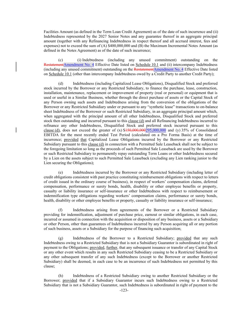 Facilities Amount (as defined in the Term Loan Credit Agreement) as of the date of such incurrence and (ii) Indebtedness represented by the 2027 Senior Notes and any guarantee thereof in an aggregate principal amount (together with any Refinancing Indebtedness in respect thereof and all accrued interest, fees and expenses) not to exceed the sum of (A) $400,000,000 and (B) the Maximum Incremental Notes Amount (as defined in the Notes Agreement) as of the date of such incurrence; (c) (i) Indebtedness (including any unused commitment) outstanding on the RestatementAmendment No. 4 Effective Date listed on Schedule 10.1 and (ii) intercompany Indebtedness (including any unused commitment) outstanding on the RestatementAmendment No. 4 Effective Date listed on Schedule 10.1 (other than intercompany Indebtedness owed by a Credit Party to another Credit Party); (d) Indebtedness (including Capitalized Lease Obligations), Disqualified Stock and preferred stock incurred by the Borrower or any Restricted Subsidiary, to finance the purchase, lease, construction, installation, maintenance, replacement or improvement of property (real or personal) or equipment that is used or useful in a Similar Business, whether through the direct purchase of assets or the Capital Stock of any Person owning such assets and Indebtedness arising from the conversion of the obligations of the Borrower or any Restricted Subsidiary under or pursuant to any “synthetic lease” transactions to on-balance sheet Indebtedness of the Borrower or such Restricted Subsidiary, in an aggregate principal amount which, when aggregated with the principal amount of all other Indebtedness, Disqualified Stock and preferred stock then outstanding and incurred pursuant to this clause (d) and all Refinancing Indebtedness incurred to refinance any other Indebtedness, Disqualified Stock and preferred stock incurred pursuant to this clause (d), does not exceed the greater of (x) $150,000,000295,000,000 and (y) 35% of Consolidated EBITDA for the most recently ended Test Period (calculated on a Pro Forma Basis) at the time of incurrence; provided that Capitalized Lease Obligations incurred by the Borrower or any Restricted Subsidiary pursuant to this clause (d) in connection with a Permitted Sale Leaseback shall not be subject to the foregoing limitation so long as the proceeds of such Permitted Sale Leaseback are used by the Borrower or such Restricted Subsidiary to permanently repay outstanding Term Loans or other Indebtedness secured by a Lien on the assets subject to such Permitted Sale Leaseback (excluding any Lien ranking junior to the Lien securing the Obligations); (e) Indebtedness incurred by the Borrower or any Restricted Subsidiary (including letter of credit obligations consistent with past practice constituting reimbursement obligations with respect to letters of credit issued in the ordinary course of business), in respect of workers’ compensation claims, deferred compensation, performance or surety bonds, health, disability or other employee benefits or property, casualty or liability insurance or self-insurance or other Indebtedness with respect to reimbursement or indemnification type obligations regarding workers’ compensation claims, performance or surety bonds, health, disability or other employee benefits or property, casualty or liability insurance or self-insurance; (f) Indebtedness arising from agreements of the Borrower or a Restricted Subsidiary providing for indemnification, adjustment of purchase price, earnout or similar obligations, in each case, incurred or assumed in connection with the acquisition or disposition of any business, assets or a Subsidiary or other Person, other than guarantees of Indebtedness incurred by any Person acquiring all or any portion of such business, assets or a Subsidiary for the purpose of financing such acquisition; (g) Indebtedness of the Borrower to a Restricted Subsidiary; provided that any such Indebtedness owing to a Restricted Subsidiary that is not a Subsidiary Guarantor is subordinated in right of payment to the Obligations; provided, further, that any subsequent issuance or transfer of any Capital Stock or any other event which results in any such Restricted Subsidiary ceasing to be a Restricted Subsidiary or any other subsequent transfer of any such Indebtedness (except to the Borrower or another Restricted Subsidiary) shall be deemed, in each case to be an incurrence of such Indebtedness not permitted by this clause; (h) Indebtedness of a Restricted Subsidiary owing to another Restricted Subsidiary or the Borrower; provided that if a Subsidiary Guarantor incurs such Indebtedness owing to a Restricted Subsidiary that is not a Subsidiary Guarantor, such Indebtedness is subordinated in right of payment to the -123-