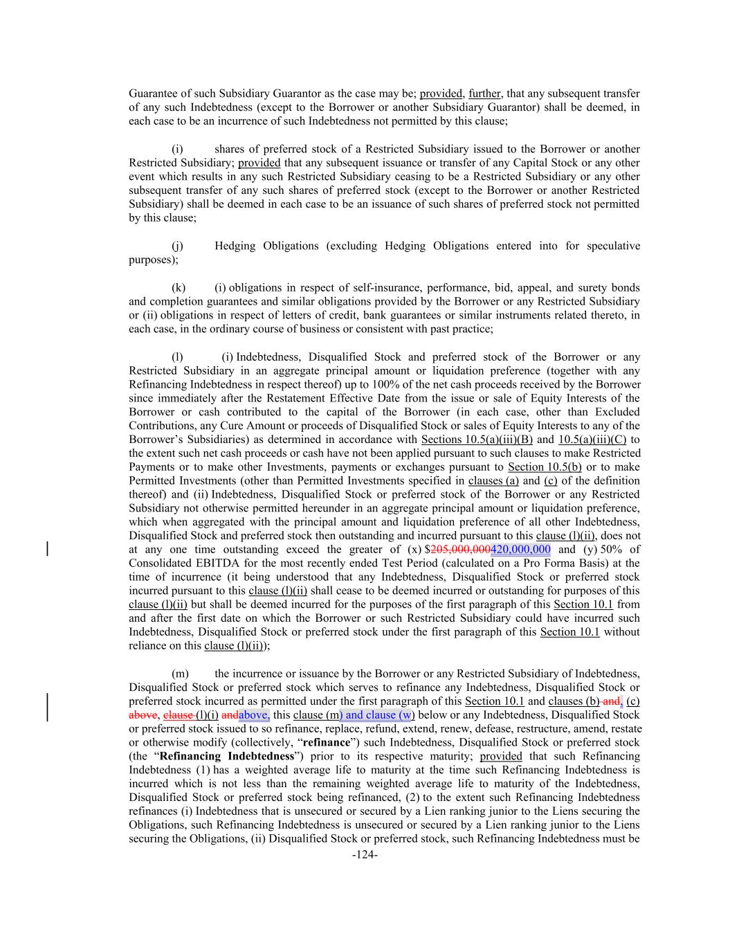 Guarantee of such Subsidiary Guarantor as the case may be; provided, further, that any subsequent transfer of any such Indebtedness (except to the Borrower or another Subsidiary Guarantor) shall be deemed, in each case to be an incurrence of such Indebtedness not permitted by this clause; (i) shares of preferred stock of a Restricted Subsidiary issued to the Borrower or another Restricted Subsidiary; provided that any subsequent issuance or transfer of any Capital Stock or any other event which results in any such Restricted Subsidiary ceasing to be a Restricted Subsidiary or any other subsequent transfer of any such shares of preferred stock (except to the Borrower or another Restricted Subsidiary) shall be deemed in each case to be an issuance of such shares of preferred stock not permitted by this clause; (j) Hedging Obligations (excluding Hedging Obligations entered into for speculative purposes); (k) (i) obligations in respect of self-insurance, performance, bid, appeal, and surety bonds and completion guarantees and similar obligations provided by the Borrower or any Restricted Subsidiary or (ii) obligations in respect of letters of credit, bank guarantees or similar instruments related thereto, in each case, in the ordinary course of business or consistent with past practice; (l) (i) Indebtedness, Disqualified Stock and preferred stock of the Borrower or any Restricted Subsidiary in an aggregate principal amount or liquidation preference (together with any Refinancing Indebtedness in respect thereof) up to 100% of the net cash proceeds received by the Borrower since immediately after the Restatement Effective Date from the issue or sale of Equity Interests of the Borrower or cash contributed to the capital of the Borrower (in each case, other than Excluded Contributions, any Cure Amount or proceeds of Disqualified Stock or sales of Equity Interests to any of the Borrower’s Subsidiaries) as determined in accordance with Sections 10.5(a)(iii)(B) and 10.5(a)(iii)(C) to the extent such net cash proceeds or cash have not been applied pursuant to such clauses to make Restricted Payments or to make other Investments, payments or exchanges pursuant to Section 10.5(b) or to make Permitted Investments (other than Permitted Investments specified in clauses (a) and (c) of the definition thereof) and (ii) Indebtedness, Disqualified Stock or preferred stock of the Borrower or any Restricted Subsidiary not otherwise permitted hereunder in an aggregate principal amount or liquidation preference, which when aggregated with the principal amount and liquidation preference of all other Indebtedness, Disqualified Stock and preferred stock then outstanding and incurred pursuant to this clause (l)(ii), does not at any one time outstanding exceed the greater of (x) $205,000,000420,000,000 and (y) 50% of Consolidated EBITDA for the most recently ended Test Period (calculated on a Pro Forma Basis) at the time of incurrence (it being understood that any Indebtedness, Disqualified Stock or preferred stock incurred pursuant to this clause (l)(ii) shall cease to be deemed incurred or outstanding for purposes of this clause (l)(ii) but shall be deemed incurred for the purposes of the first paragraph of this Section 10.1 from and after the first date on which the Borrower or such Restricted Subsidiary could have incurred such Indebtedness, Disqualified Stock or preferred stock under the first paragraph of this Section 10.1 without reliance on this clause (l)(ii)); (m) the incurrence or issuance by the Borrower or any Restricted Subsidiary of Indebtedness, Disqualified Stock or preferred stock which serves to refinance any Indebtedness, Disqualified Stock or preferred stock incurred as permitted under the first paragraph of this Section 10.1 and clauses (b) and, (c) above, clause (l)(i) andabove, this clause (m) and clause (w) below or any Indebtedness, Disqualified Stock or preferred stock issued to so refinance, replace, refund, extend, renew, defease, restructure, amend, restate or otherwise modify (collectively, “refinance”) such Indebtedness, Disqualified Stock or preferred stock (the “Refinancing Indebtedness”) prior to its respective maturity; provided that such Refinancing Indebtedness (1) has a weighted average life to maturity at the time such Refinancing Indebtedness is incurred which is not less than the remaining weighted average life to maturity of the Indebtedness, Disqualified Stock or preferred stock being refinanced, (2) to the extent such Refinancing Indebtedness refinances (i) Indebtedness that is unsecured or secured by a Lien ranking junior to the Liens securing the Obligations, such Refinancing Indebtedness is unsecured or secured by a Lien ranking junior to the Liens securing the Obligations, (ii) Disqualified Stock or preferred stock, such Refinancing Indebtedness must be -124-